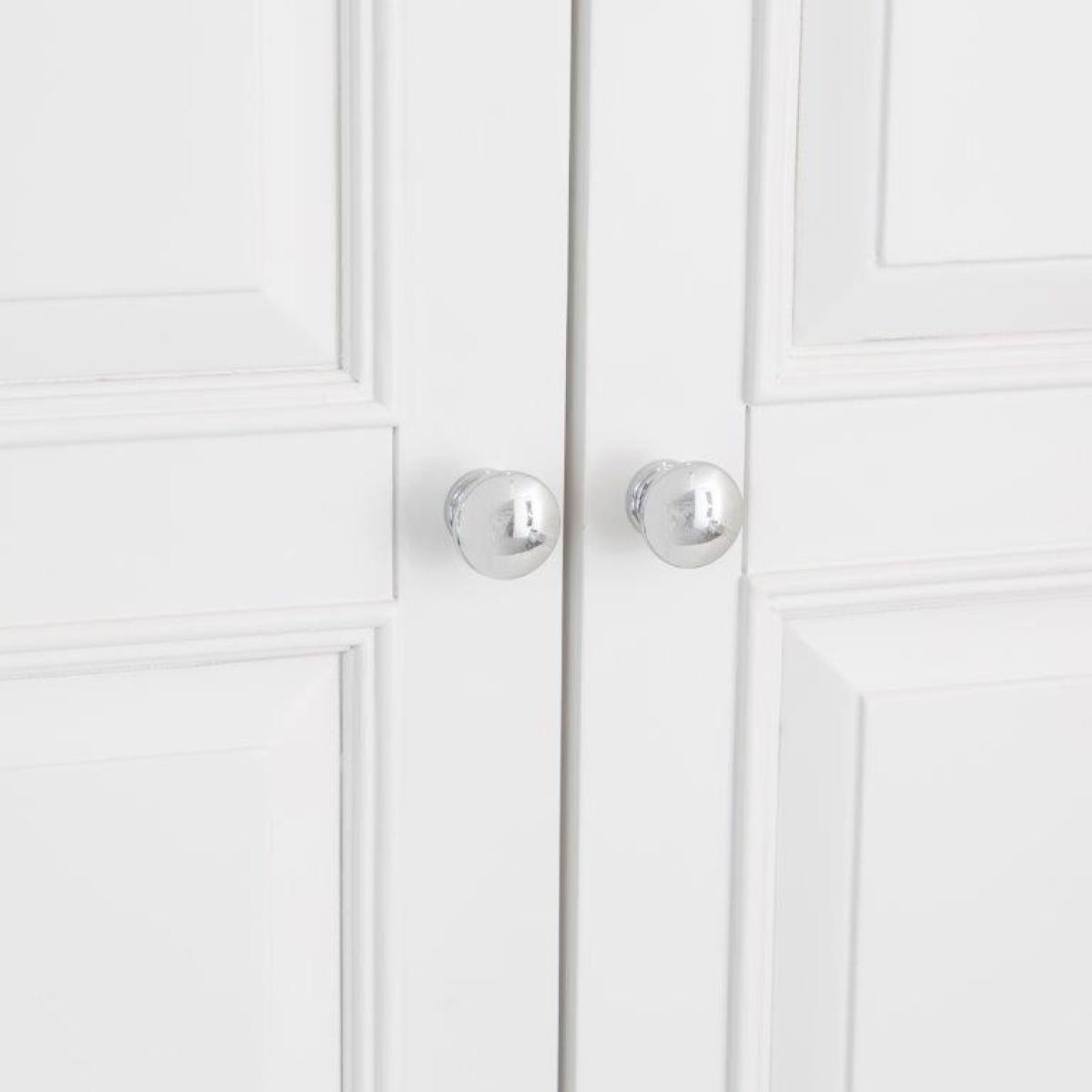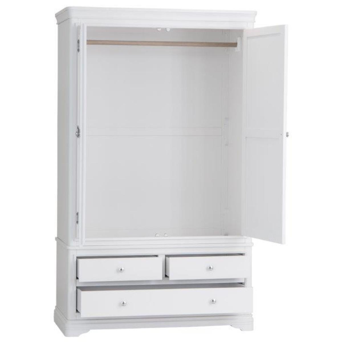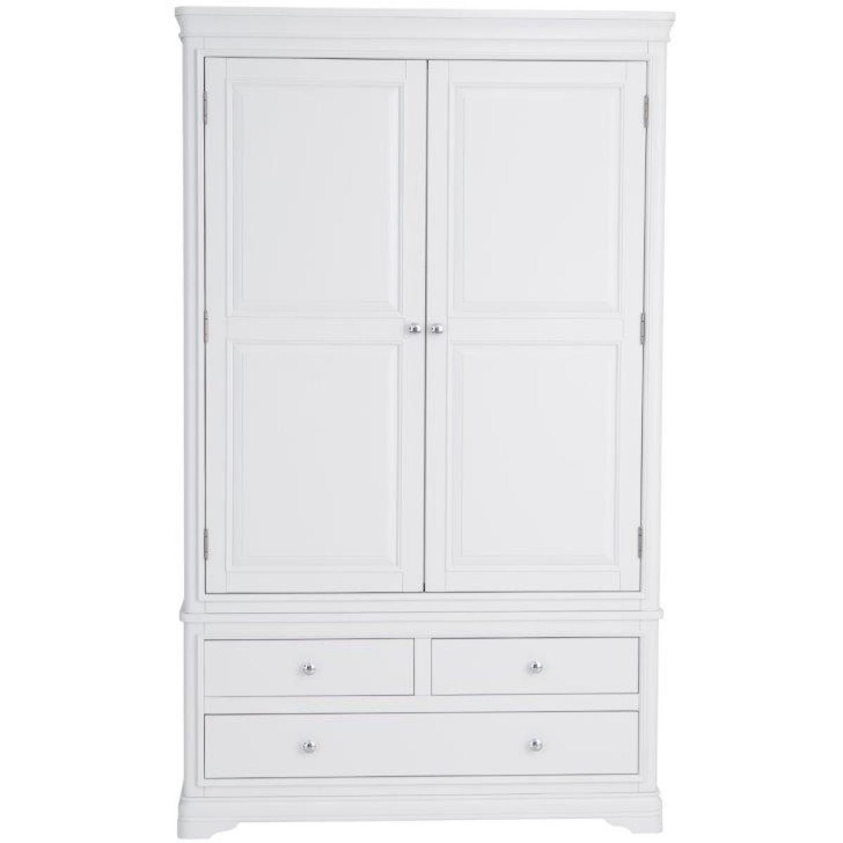 This sophisticated Sutton 2 Door Wardrobe is in a soft white with rounded corners. Features a full hanging wardrobe and 3 storage drawers. This range is lovingly crafted for a little something special. Key Features: Assembly required. Drawer soft close runners Hidden under mounted drawer runners 2 Door, 2 Bottom Drawers over 1 full Bottom length Drawer Full hanging wardrobe Soft close magnetic catches Colour - White Dimensions: Height: 200cm Width: 120cm Depth: 58cm Weight 85kg All screens vary in colour reproduction and whilst every effort has been made to display the colour as accurately as possible it is for guidance only.