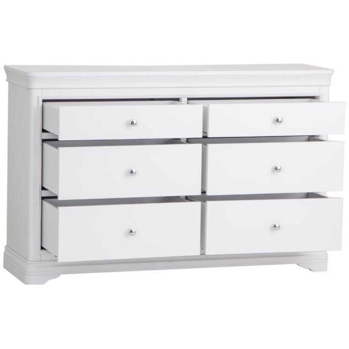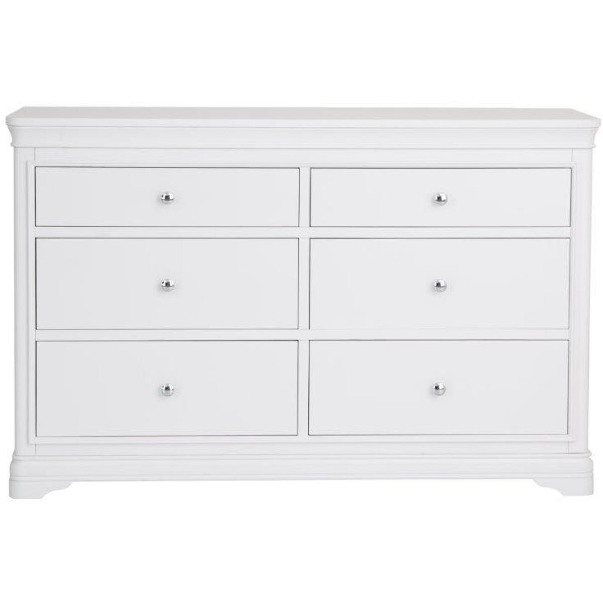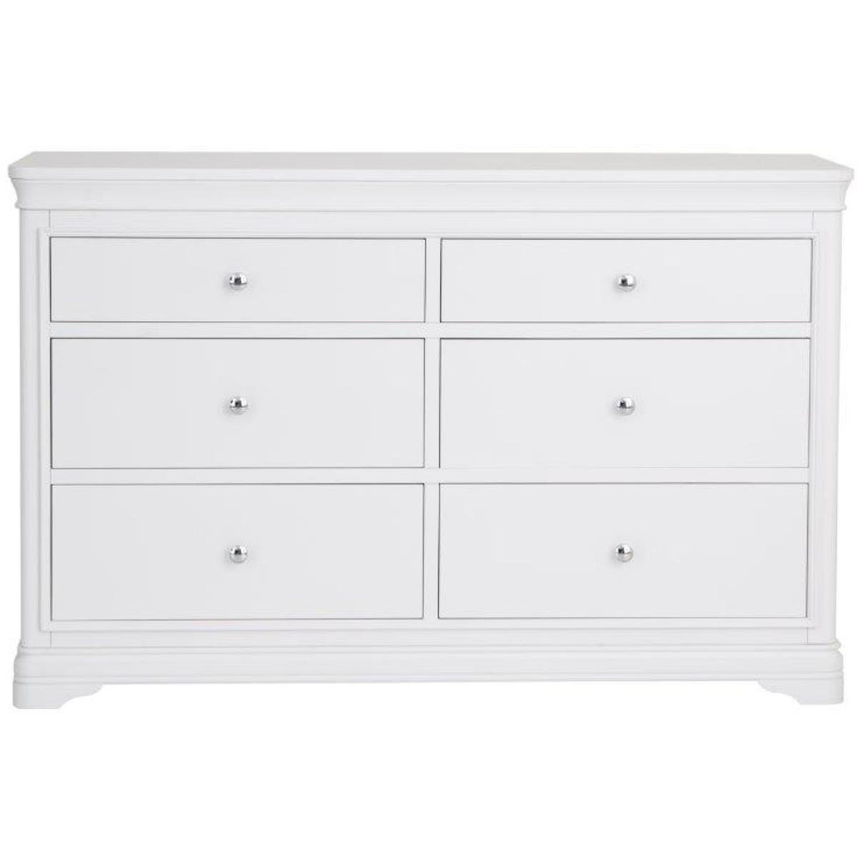 This sophisticated Sutton 6 Drawer Chest is in a soft white with rounded corners and sculptured feet. Features 6 spacious storage drawers with soft closing runners. This range is lovingly crafted for a little something special. Key Features: No assembly required. Drawer soft close runners Hidden under mounted drawer runners 2 top Drawers, 4 Bottom Drawers Chrome Handles Colour - White Dimensions: Height: 90cm Width: 140cm Depth: 42cm Weight 60kg All screens vary in colour reproduction and whilst every effort has been made to display the colour as accurately as possible it is for guidance only.