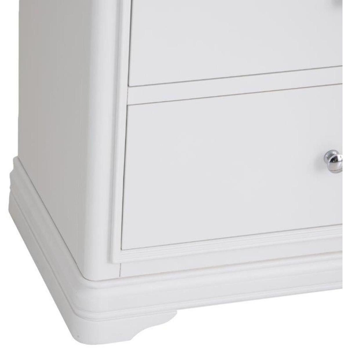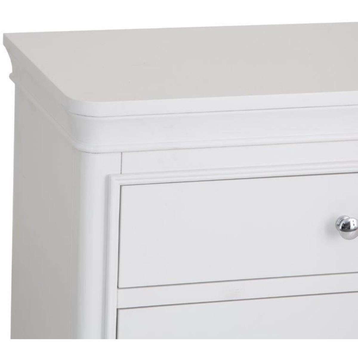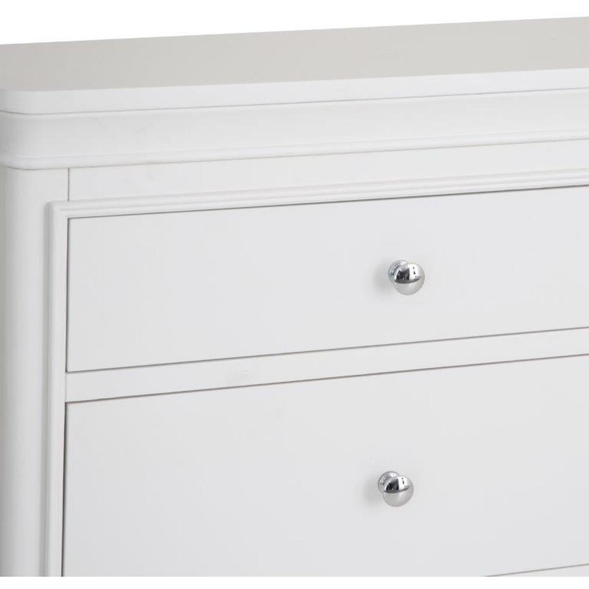 This sophisticated Sutton 6 Drawer Chest is in a soft white with rounded corners and sculptured feet. Features 6 spacious storage drawers with soft closing runners. This range is lovingly crafted for a little something special. Key Features: No assembly required. Drawer soft close runners Hidden under mounted drawer runners 2 top Drawers, 4 Bottom Drawers Chrome Handles Colour - White Dimensions: Height: 90cm Width: 140cm Depth: 42cm Weight 60kg All screens vary in colour reproduction and whilst every effort has been made to display the colour as accurately as possible it is for guidance only.