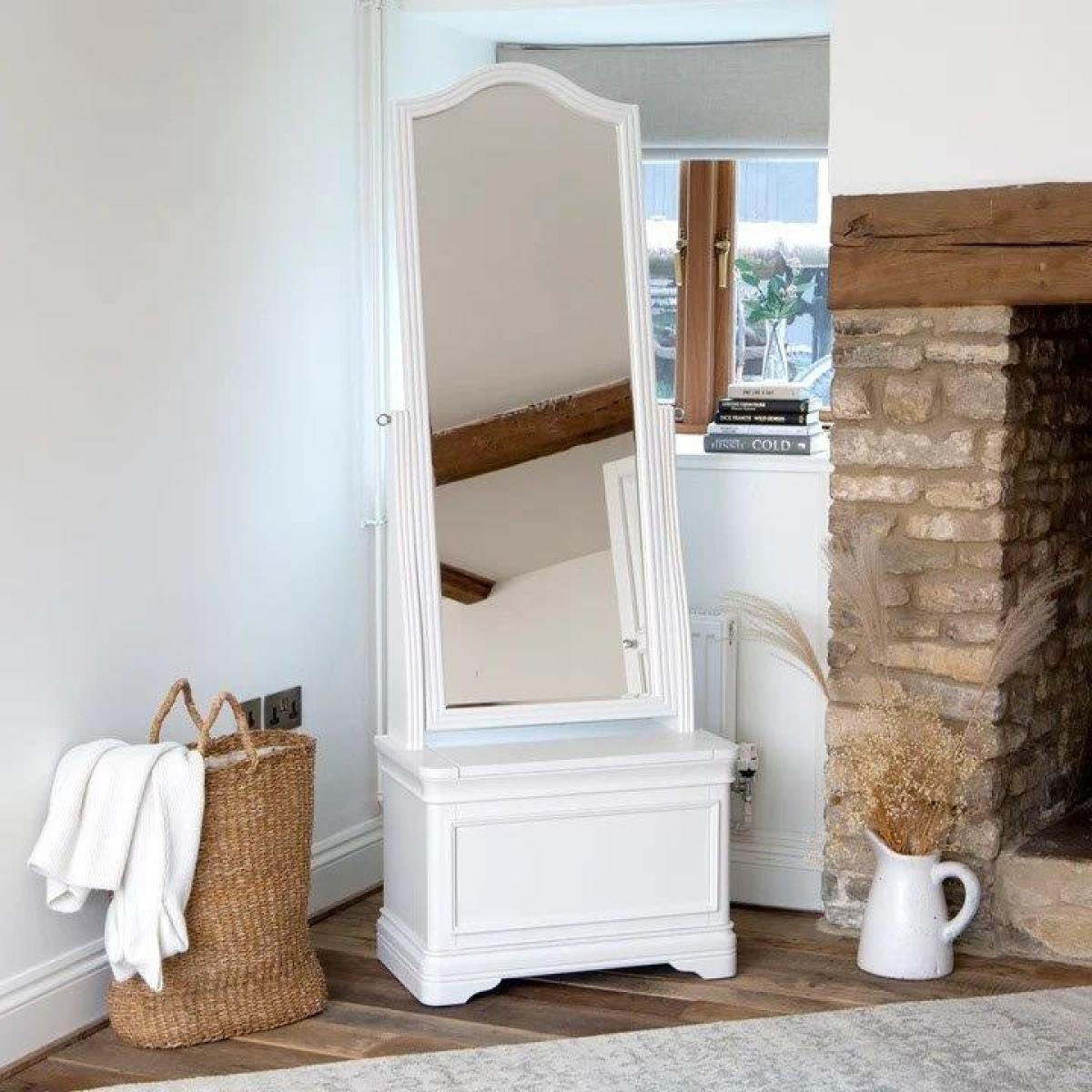 I love this dressing table mirror because of its clean, classic design that adds a touch of elegance without overpowering a space. It works especially well in bedrooms that lean towards a coastal or country aesthetic, thanks to its soft white finish and simple, timeless shape. Practical styling tips include placing it in front of natural light to maximise brightness and pairing it with vintage or rustic accents for a cohesive look. Its versatile design makes it suitable for both traditional and contemporary interiors, and it can serve as a focal point on a dressing table or against a bedroom wall for a neat, organised feel.