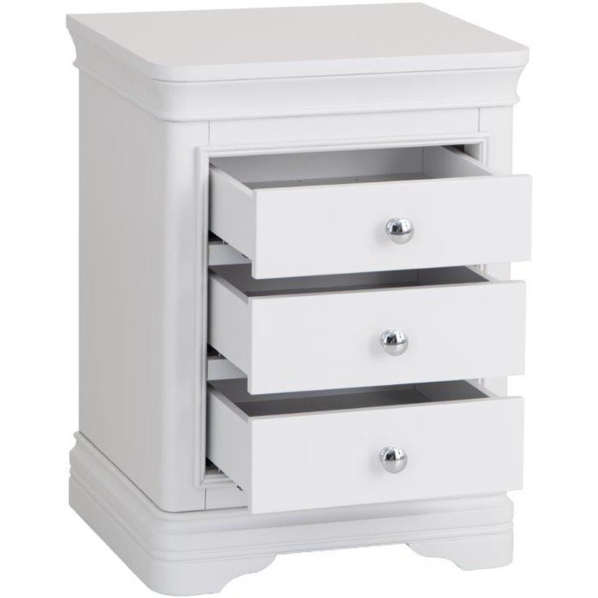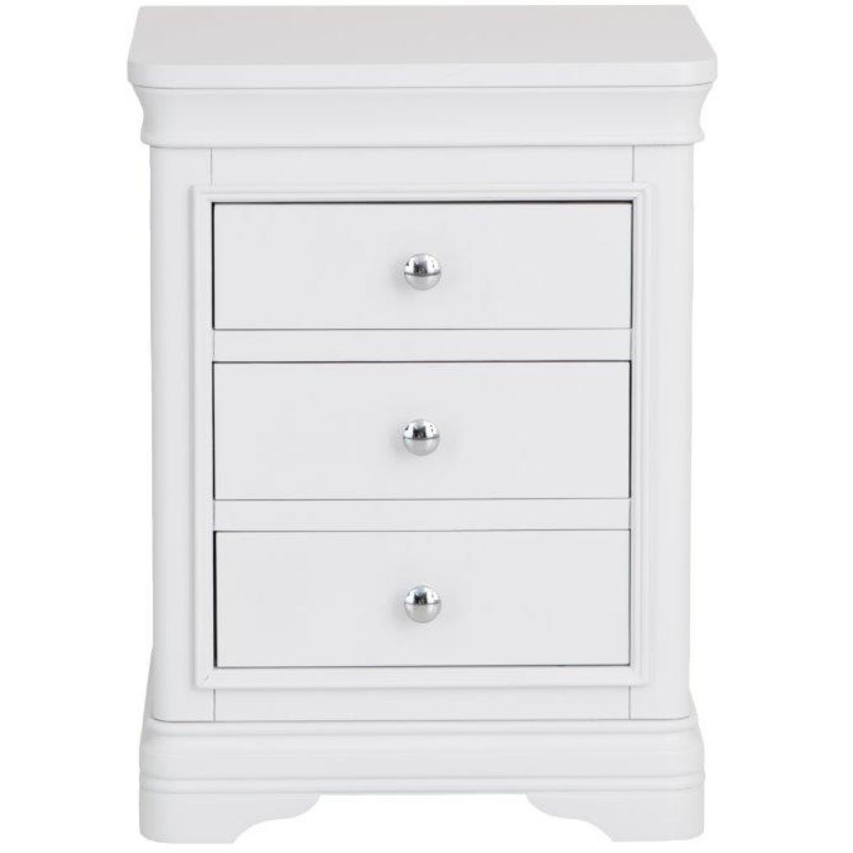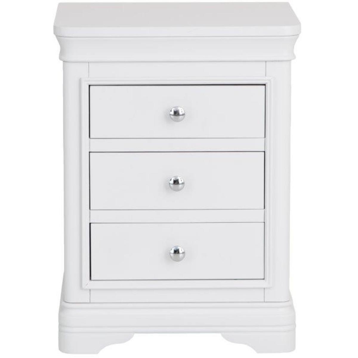 This sophisticated Sutton Large Bedside Cabinet is in a soft white with rounded corners and sculptured feet. Features 3 drawers with soft closing runners. This range is lovingly crafted for a little something special. Key Features: No assembly required. Drawer soft closed runners Hidden under mounted drawer runners 3 Drawers Rounded Edges Colour - White Dimensions: Height: 65cm Width: 48cm Depth: 42cm Weight 23kg All screens vary in colour reproduction and whilst every effort has been made to display the colour as accurately as possible it is for guidance only.