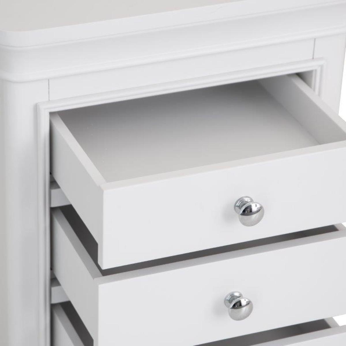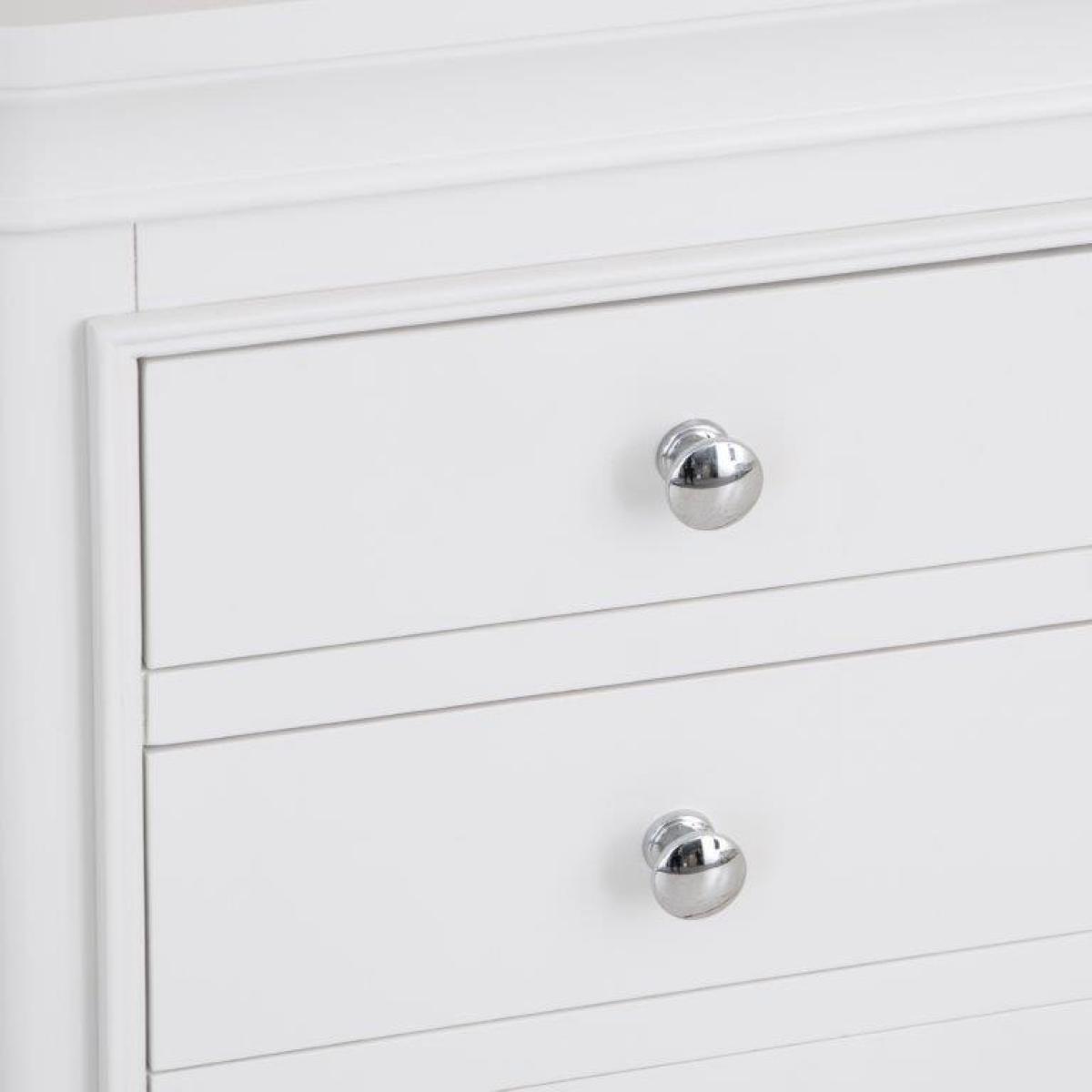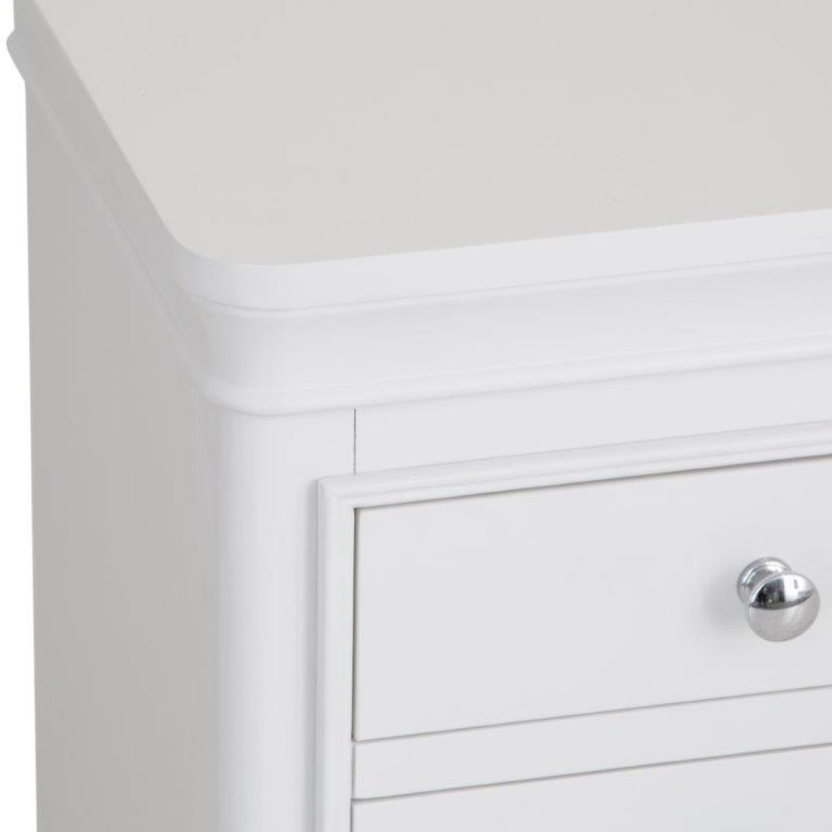 This sophisticated Sutton Large Bedside Cabinet is in a soft white with rounded corners and sculptured feet. Features 3 drawers with soft closing runners. This range is lovingly crafted for a little something special. Key Features: No assembly required. Drawer soft closed runners Hidden under mounted drawer runners 3 Drawers Rounded Edges Colour - White Dimensions: Height: 65cm Width: 48cm Depth: 42cm Weight 23kg All screens vary in colour reproduction and whilst every effort has been made to display the colour as accurately as possible it is for guidance only.
