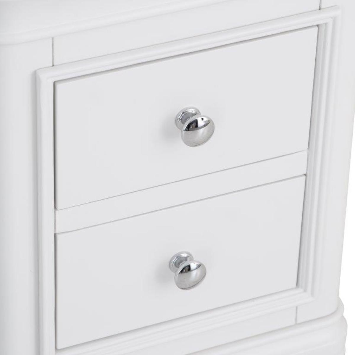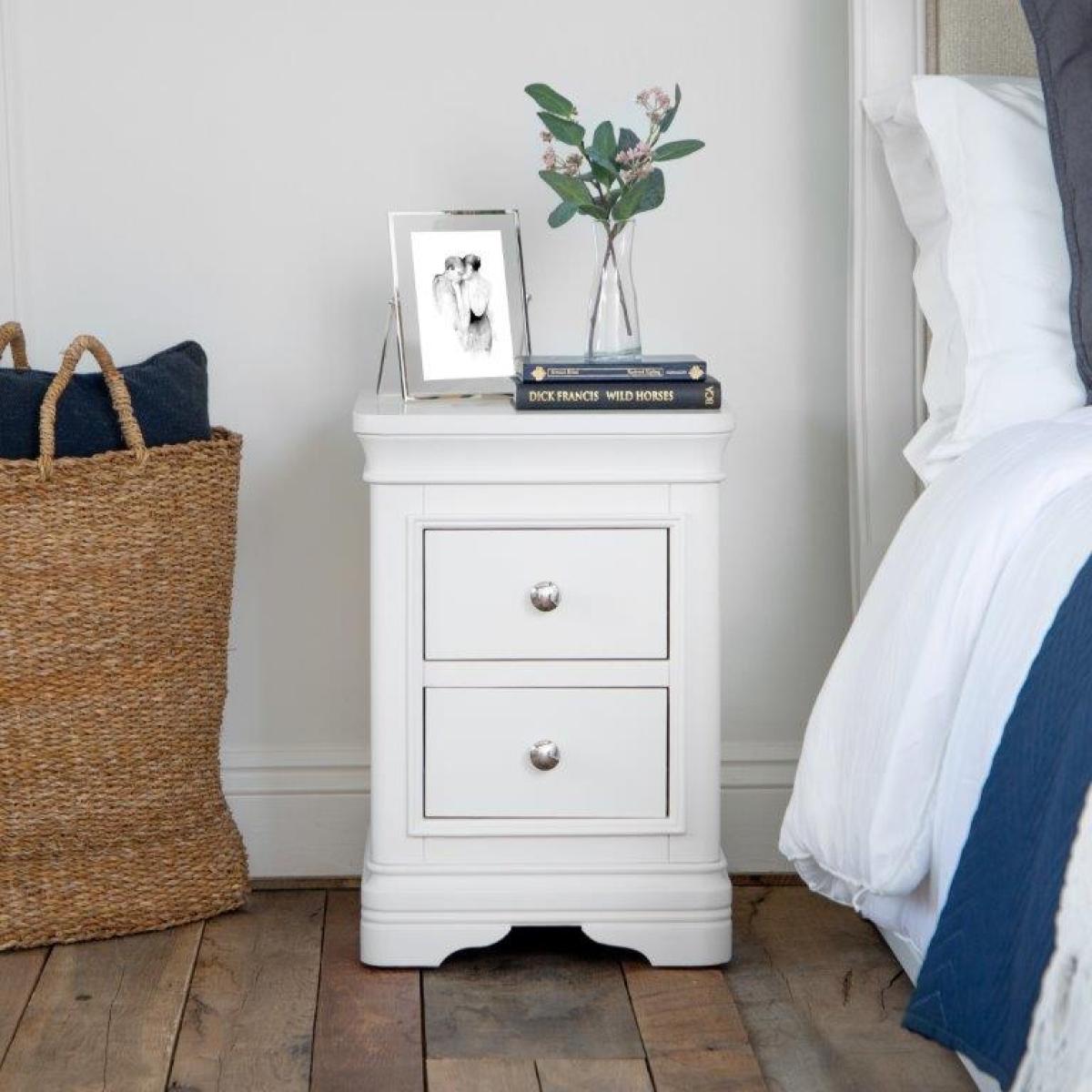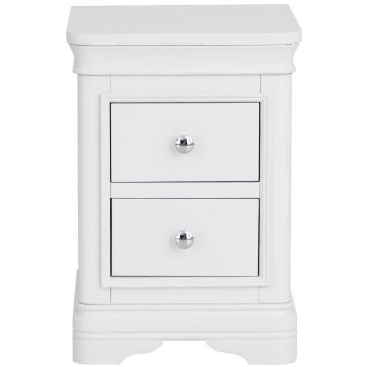 This sophisticated Sutton Small Bedside Cabinet is in a soft white with rounded corners and sculptured feet. Features 2 drawers with soft closing runners. This range is lovingly crafted for a little something special. Key Features: No assembly required. Drawer soft closed runners Hidden under mounted drawer runners 2 Drawers Rounded Edges Colour - White Dimensions: Height: 55cm Width: 38cm Depth: 40cm Weight 16kg All screens vary in colour reproduction and whilst every effort has been made to display the colour as accurately as possible it is for guidance only.