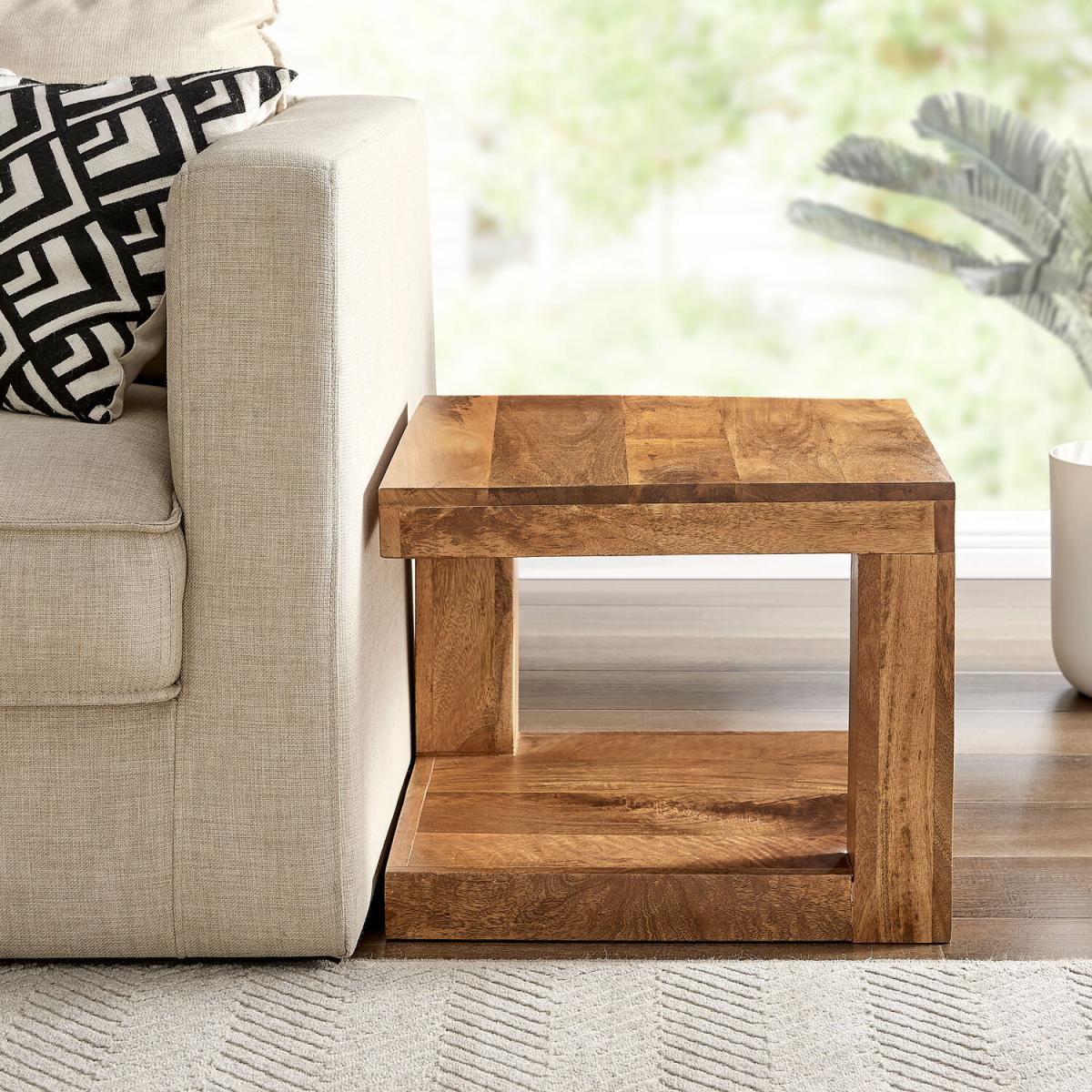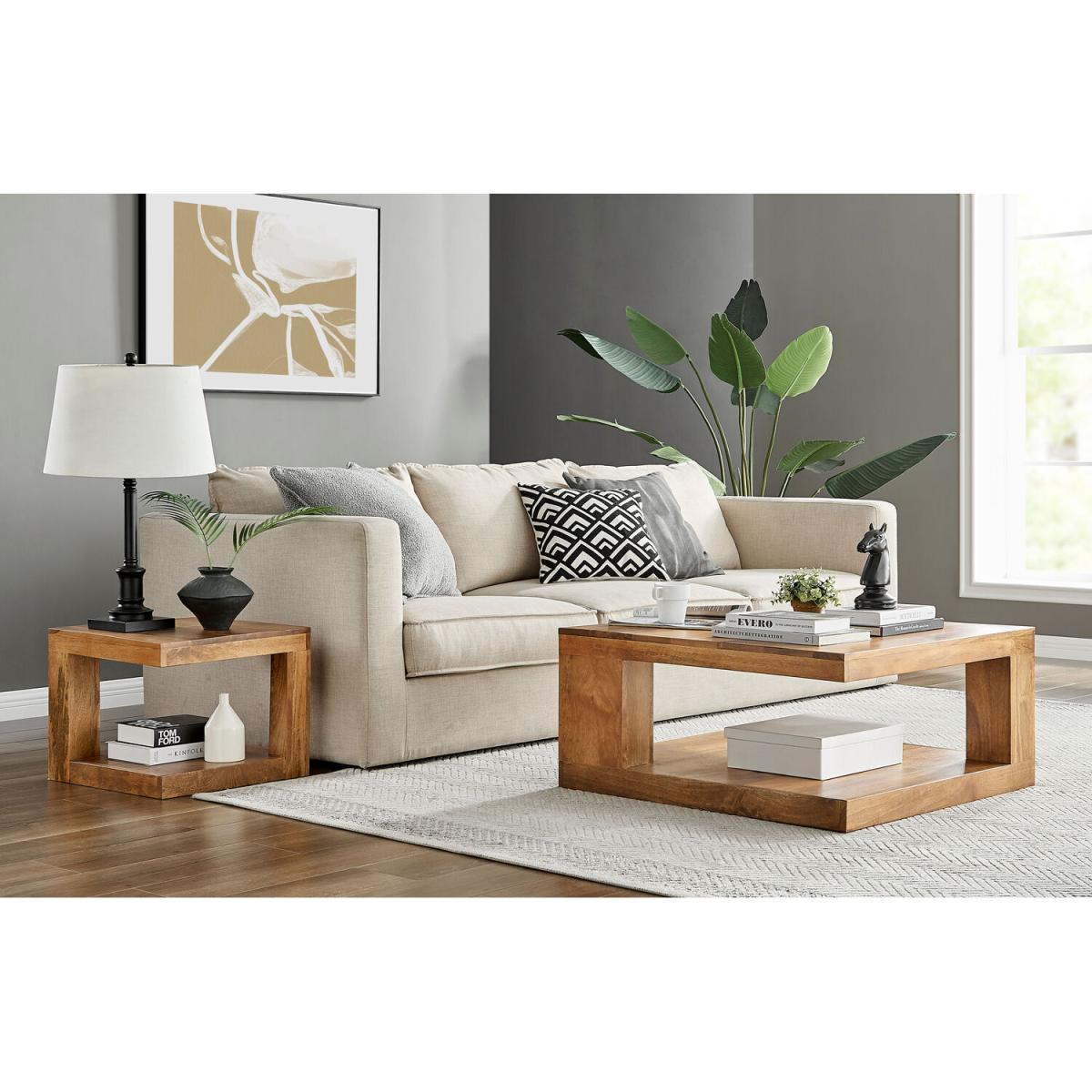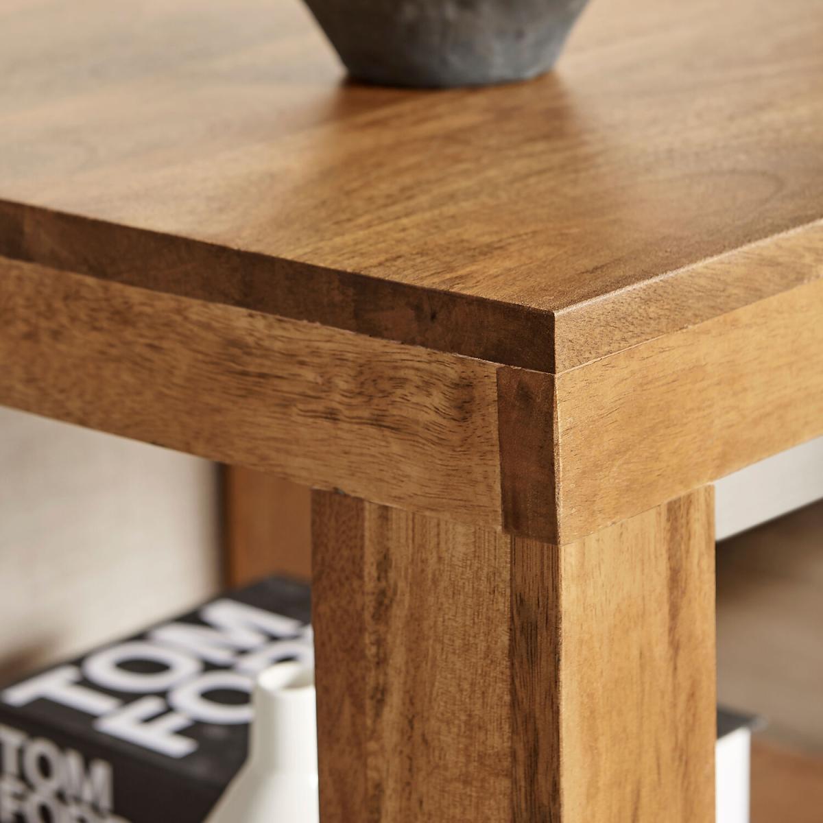 Our Sutton solid wood living room set comprises of a matching gorgeous side table and coffee table. This modern living room furniture set will equally suit a more traditional rustic or more sleek and modern home. Both side table coffee table are square, with a minimalist design of straight lines and open space, and both provide plenty of surface space to keep all your living room essentials tidy. Made from solid sustainably sourced mango wood in a stunning warm honey toned finish, the Sutton set is unfussy and super stylish. Complete the look with the matching Sutton TV stand or browse our other living room furniture! This set is also available in a darker rich walnut-coloured finish. As this is real, solid wood furniture, the grain and natural elements of each piece will be unique and different, determined by the tree that produced it. Some pieces may have knots and whorls that will add character to your bespoke table.
