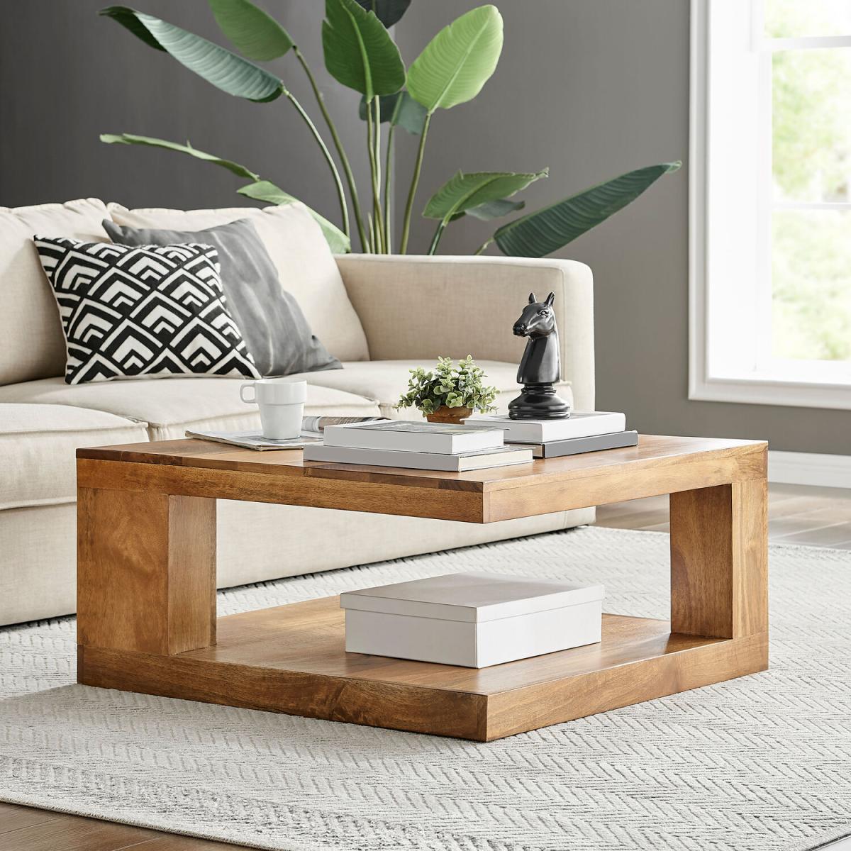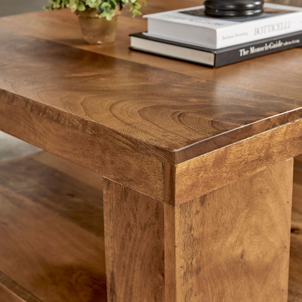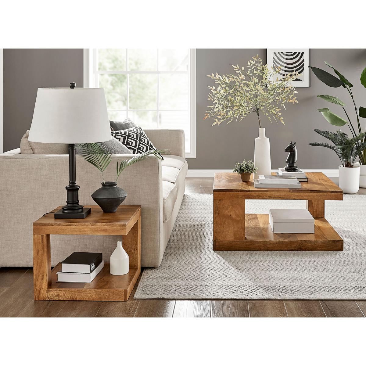 Our Sutton solid wood living room set comprises of a matching gorgeous side table and coffee table. This modern living room furniture set will equally suit a more traditional rustic or more sleek and modern home. Both side table coffee table are square, with a minimalist design of straight lines and open space, and both provide plenty of surface space to keep all your living room essentials tidy. Made from solid sustainably sourced mango wood in a stunning warm honey toned finish, the Sutton set is unfussy and super stylish. Complete the look with the matching Sutton TV stand or browse our other living room furniture! This set is also available in a darker rich walnut-coloured finish. As this is real, solid wood furniture, the grain and natural elements of each piece will be unique and different, determined by the tree that produced it. Some pieces may have knots and whorls that will add character to your bespoke table.
