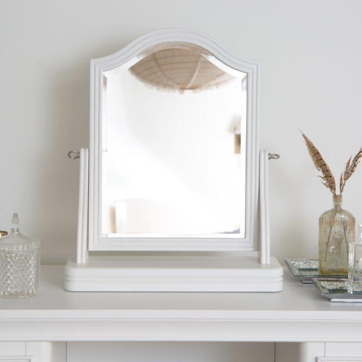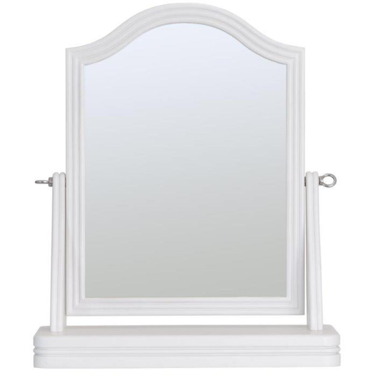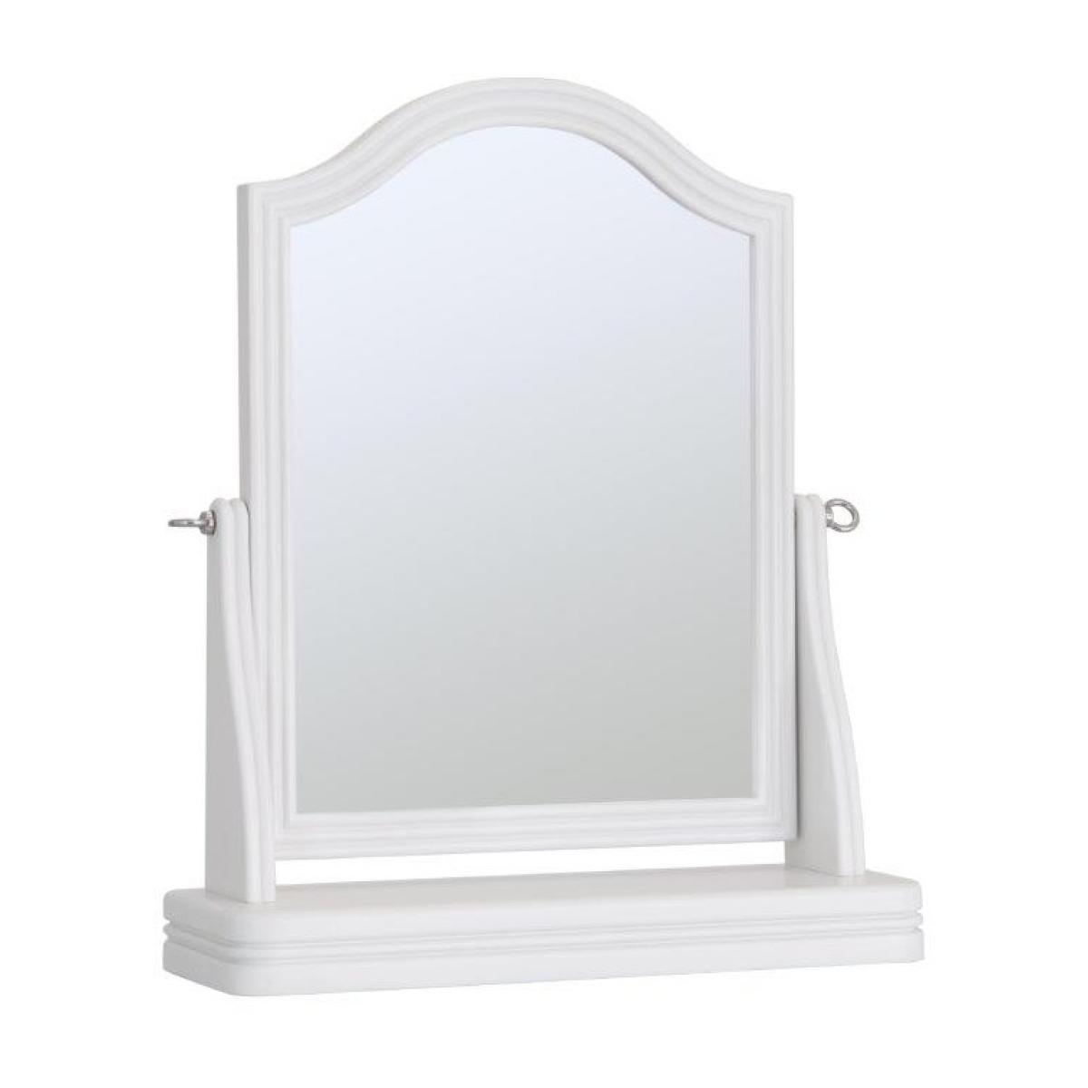 This sophisticated Sutton Trinket Mirror is in a soft white with rounded corners. Features an adjustable angle. This range is lovingly crafted for a little something special. Use it with the matching dressing table and stool for a luxurious set-up. Key Features: No assembly required. Compact enough to sit on a Dressing Table Rounded Edges Adjustable angle Bevelled mirror Colour - White Dimensions: Height: 57cm Width: 48cm Depth: 14.5cm Weight 5kg All screens vary in colour reproduction and whilst every effort has been made to display the colour as accurately as possible it is for guidance only.