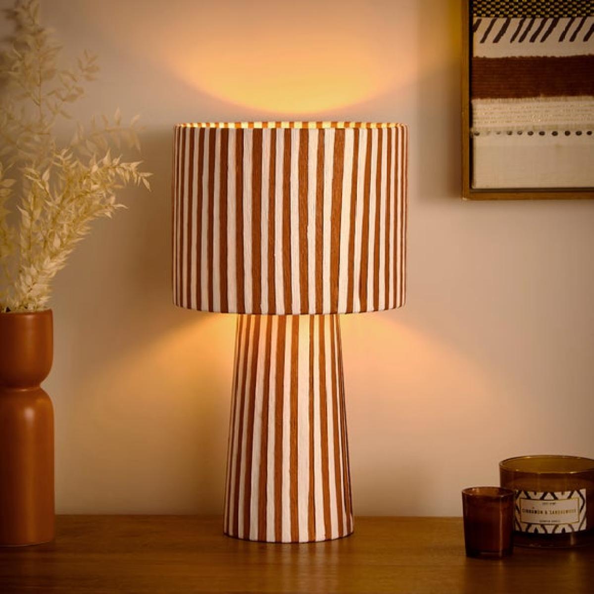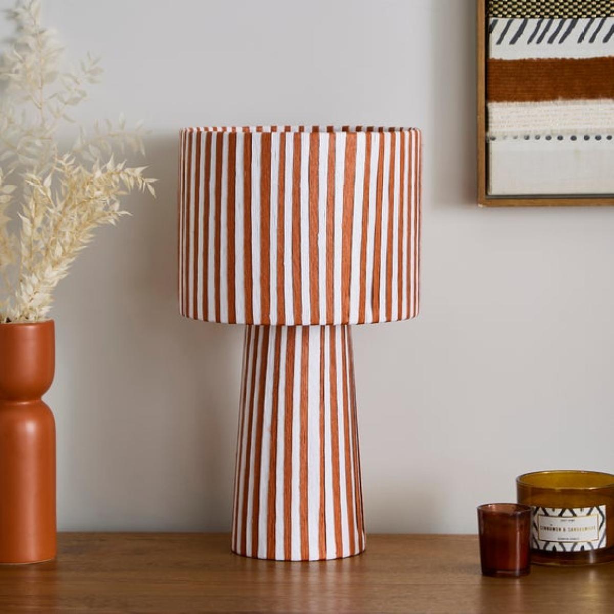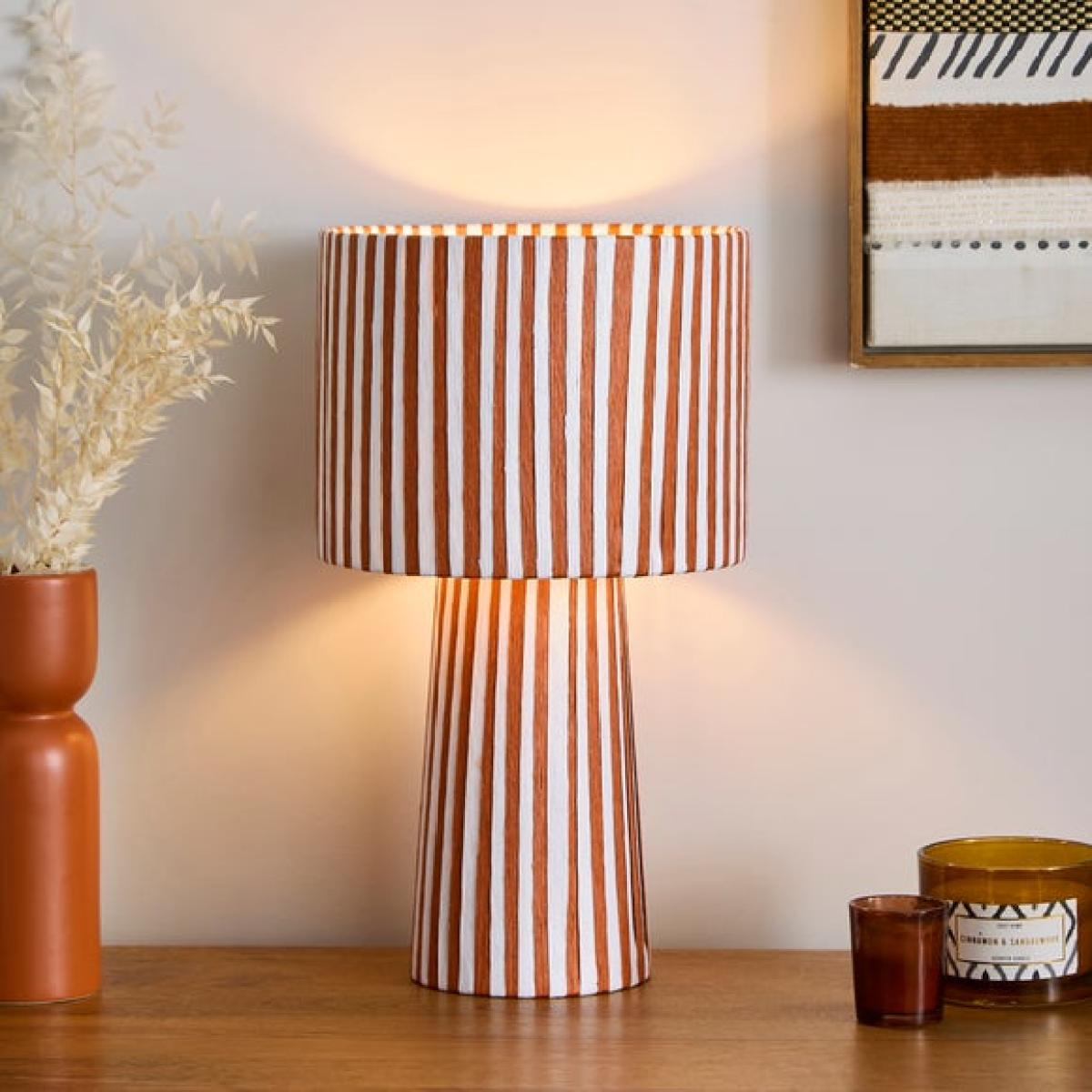 I love this striped woven table lamp for its bold yet versatile design, making it a great statement piece in both contemporary and eclectic interiors. Its warm, earthy tones and textured finish add visual interest without overwhelming the space, making it perfect for side tables, console tables, or bedroom bedside tables. For styling tips, consider pairing it with neutral or matching accessories to enhance its pattern, or place it alongside soft fabrics and natural materials for a cosy, layered look. It’s particularly effective in living rooms or bedrooms where a touch of colour and texture can soften the overall aesthetic while providing functional lighting.