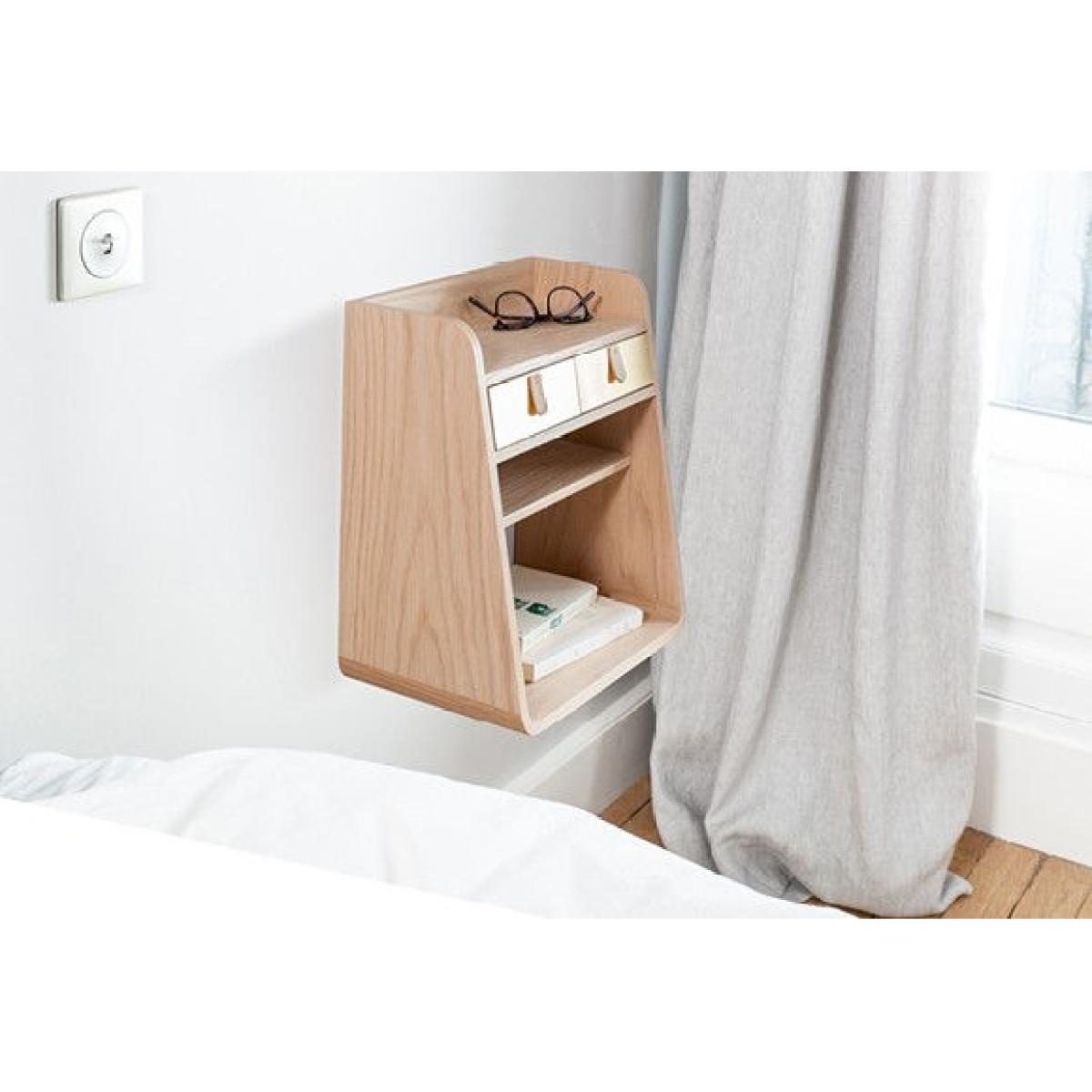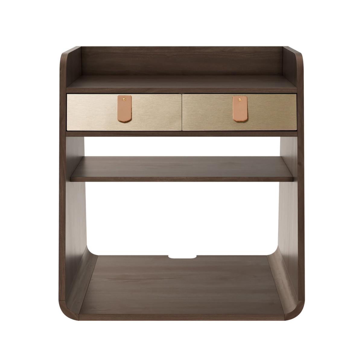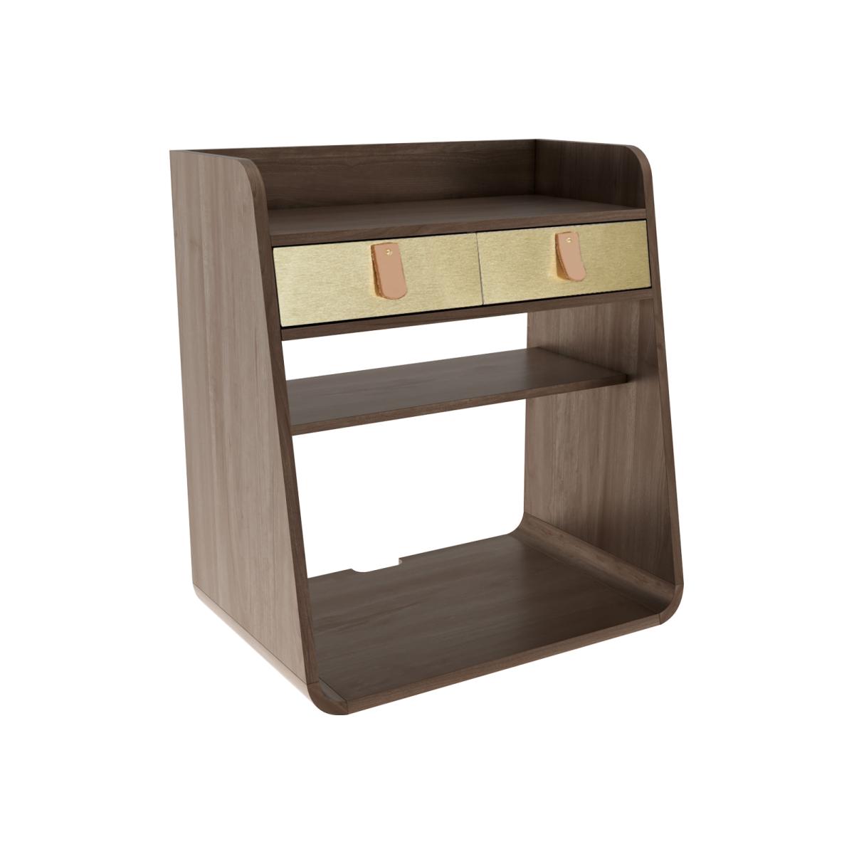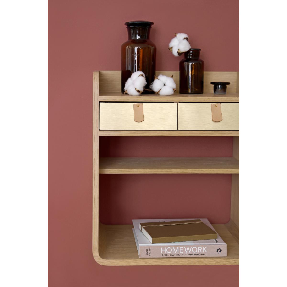 This wall shelf is the ideal space-saving solution for small spaces… Suzon presents an elegant combination of materials. The brass structure includes two drawers dressed in brushed brass adorned with two tabs in natural leather. Suzon takes up very little space; barely measuring as follows: W 36 cm x max. Depth 15. 5 cm x H 39. 5 cm. It therefore provides choice additional storage, able to easily slip into any room in the house. Your clutter can be hidden in the drawers and the shelves can serve either as storage or display space for beautiful items or art books. Suzon is a small storage unit ideal for the hall, as a trinket holder, or for the bedroom, as a bedside table.
