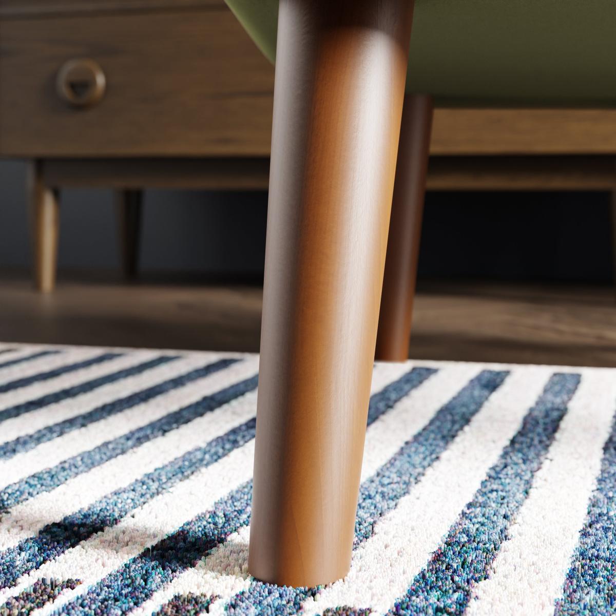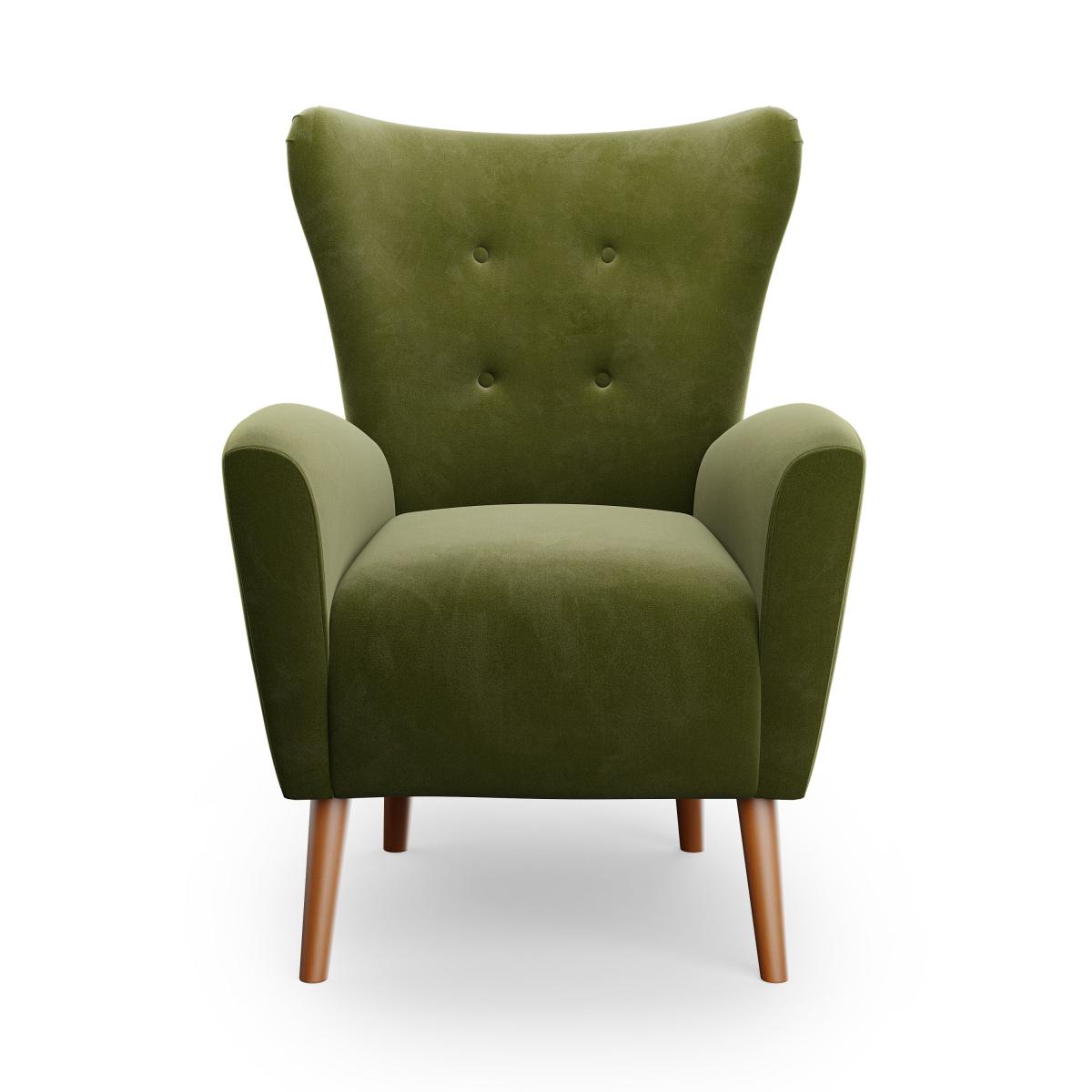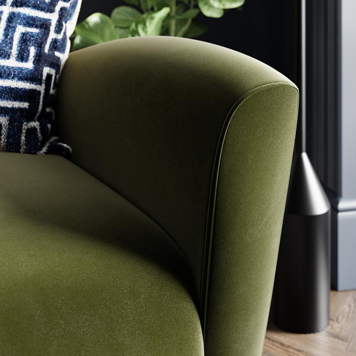 I’m a fan of this olive velvet wing chair for its firm yet cosy seat and sculptural silhouette - it instantly elevates a living room or reading nook without overwhelming the space. The deep green works well with mid-century modern schemes and pairs beautifully with warm walnut tones, matte black metal accents or soft neutrals to keep the look grounded. For styling, add a geometric-print cushion or a lightweight throw in a contrasting hue (think mustard or slate blue) to break up the solid colour. Position it beside a slender floor lamp and a simple side table topped with greenery or a stack of books. In a more eclectic interior, layer it over a patterned rug to introduce extra texture and depth.