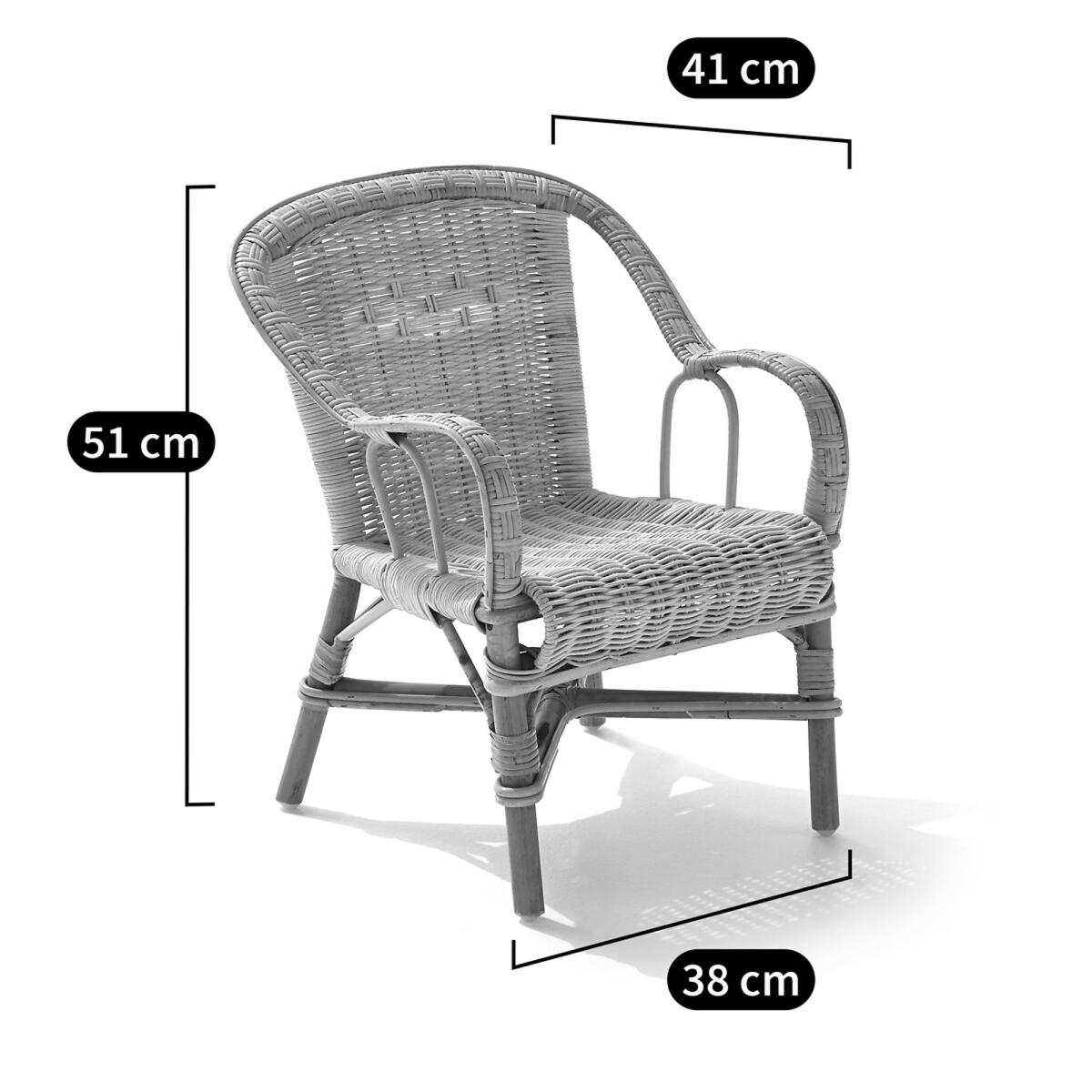 Child’s rattan core chair by KOK : The emblematic French-style garden armchair in rattan now available in a children's version! A light, versatile and comfortable model,and ultra robust for all children!Description: • Rattan frame • Woven rattan core • Finish: water-based varnish • High quality plaiting. To keep it in top condition, store it over the winter. Size : • Width: 38cm • Height: 51cm • Depth: 41 cmQuality:. This product is made of rattan and rattan marrow, so to ensure its longevity, observe the following maintenance rules: • Avoid placing rattan furniture next to a heat source as it could cause the material to dry out and split. • Outdoor use is recommended in good weather as long as the product is well protected in the event of bad weather. • This product can be used on a terrace, patio, conservatory or balcony provided it is protected from wind and rain. Avoid leaving the product in direct contact with the ground or grass in order to prevent any rising damp at the feet. Home Delivery:Your child’s rattan core chair by KOK is supplied assembled. It will be delivered to your door!Note! Please check that all access points are large enough to accommodate your delivery (doors, stairs, lifts)..Dimensions and weight of parcel: • L46 x D40 x H52 cm • 2 kg