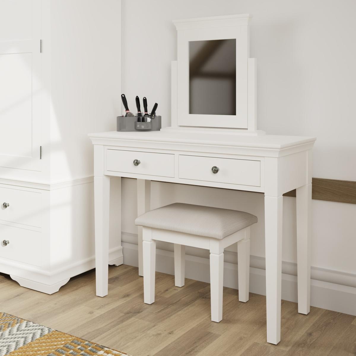 I love this little stool because of its versatility and clean, understated look. The white finish makes it a perfect fit for a range of interiors, from minimal and Scandi-inspired spaces to more classic or shabby chic bedrooms. It works especially well paired with matching or contrasting dressing tables, adding a practical seating option that’s equally stylish. When styling, consider adding a soft cushion or throw for extra comfort, and keep the surrounding decor simple to let the stool stand out as a subtle, functional accent. Its ready-assembled nature makes it a convenient option, ensuring a polished look right out of the box.