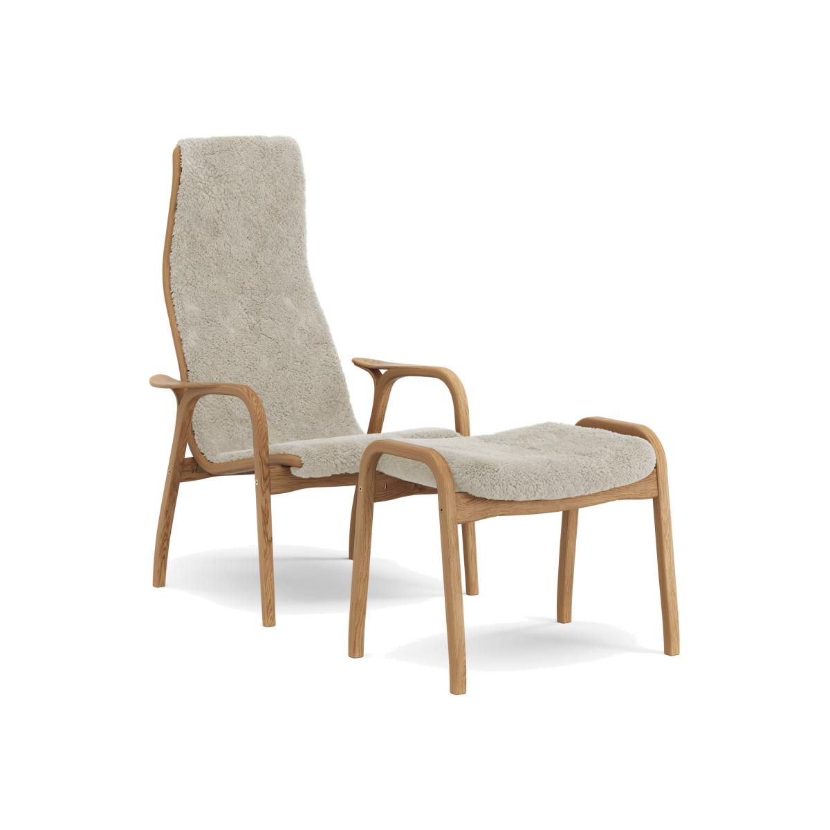 Swedese Lamino armchair and footstool oiled oak/sheepskin Moonlight (beige)