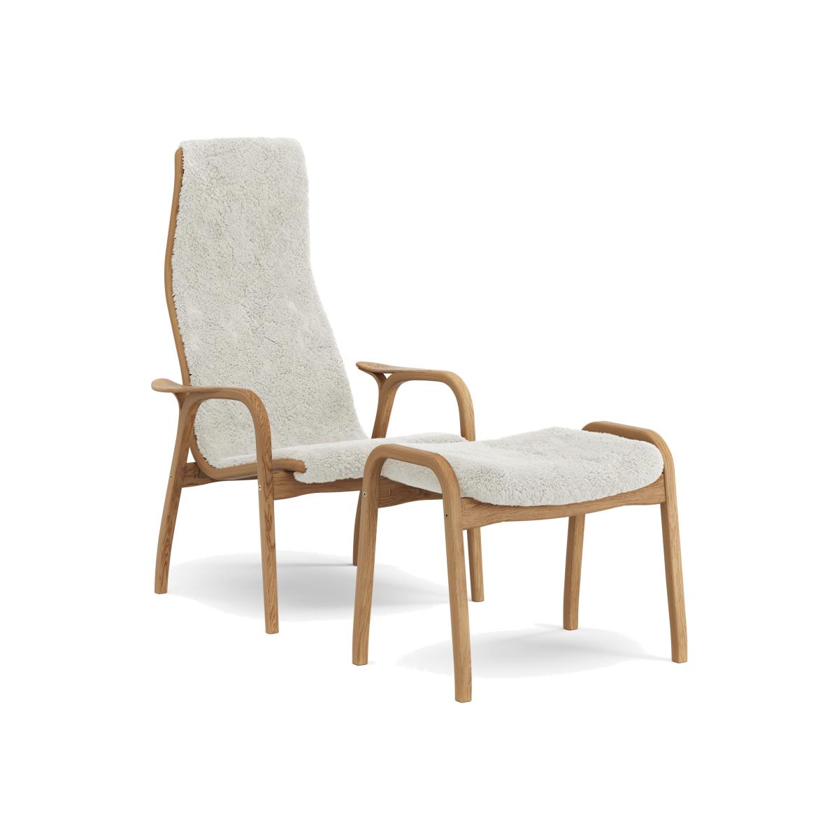 Swedese Lamino armchair and footstool oiled oak/sheepskin Off-white (white)