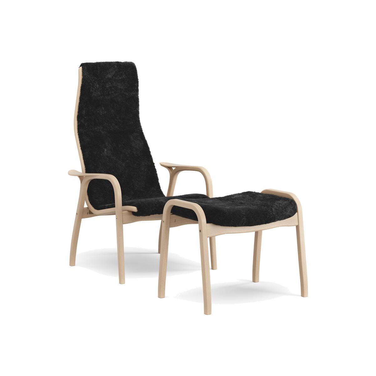 Swedese Lamino armchair and footstool varnished beech/sheepskin Black