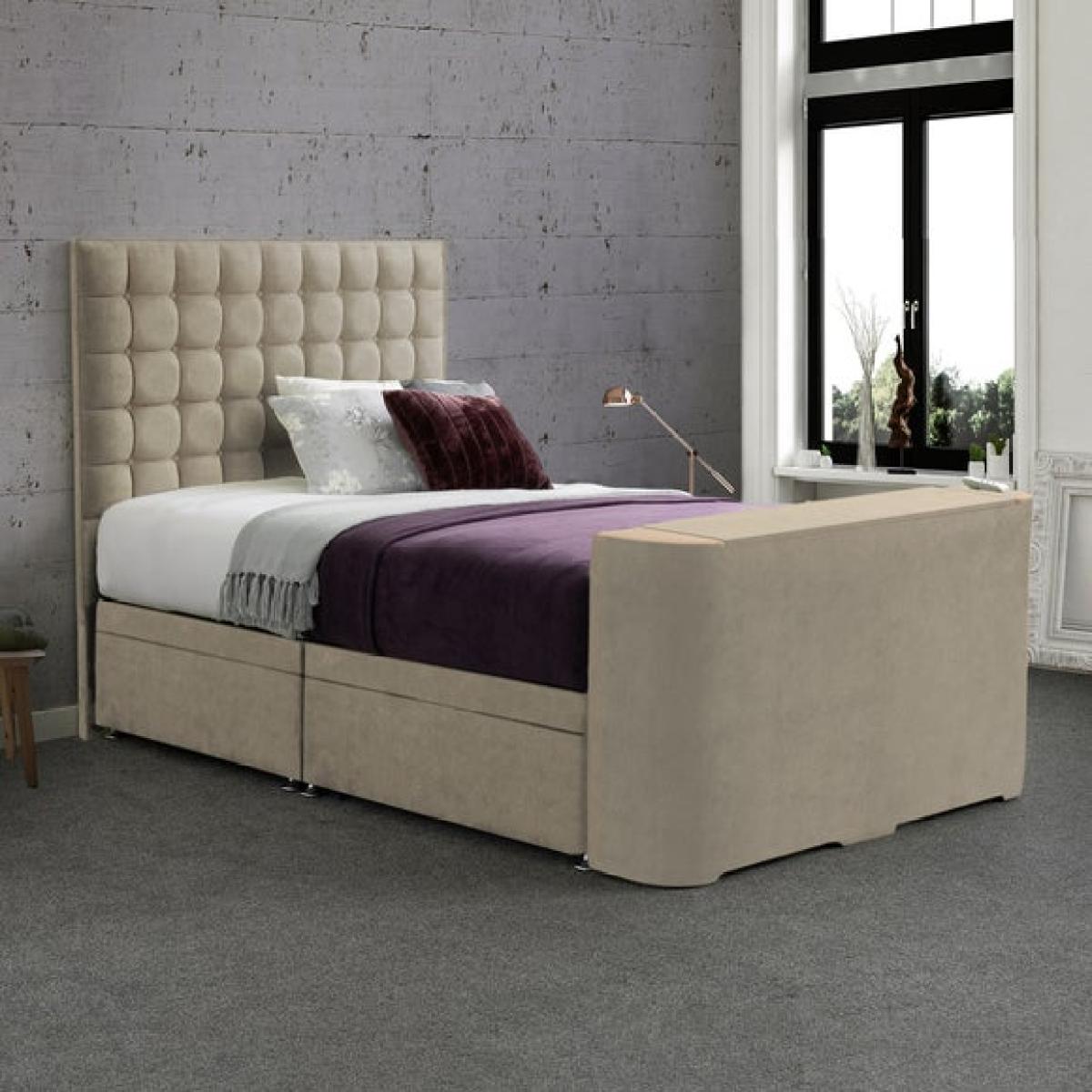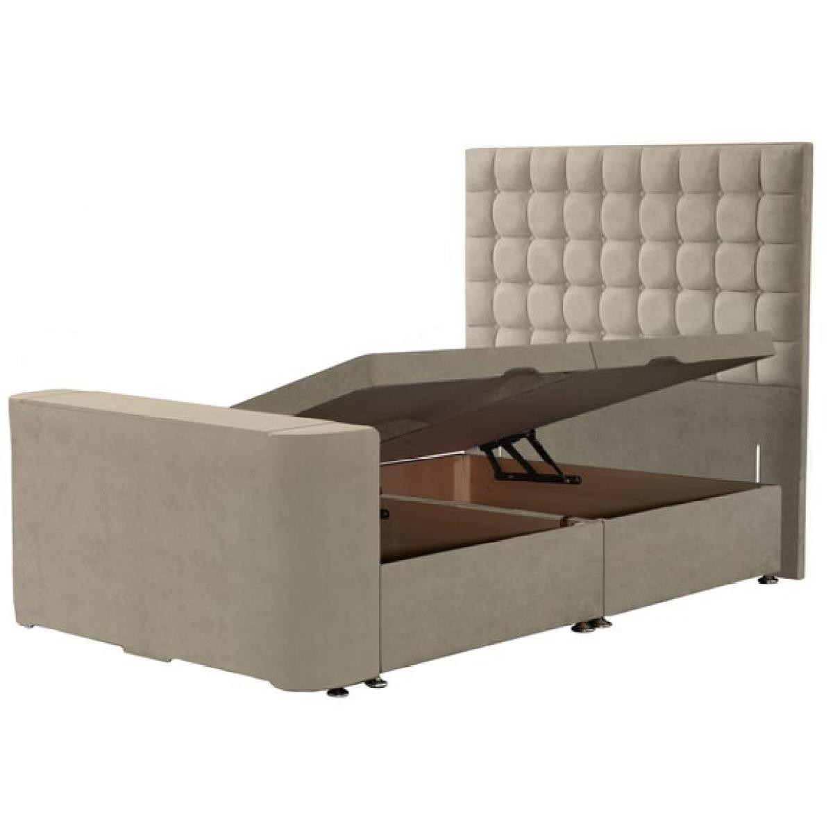 * Fits TVs up to 40" with max depth of 8cm (TV not included) * Vertical pleated headboard with geometric styling * Side-lift ottoman base for hidden storage * Available in a range of colour options * TV mechanism must be mains connected This bed is built for those who like their space neat and their evenings relaxed. Upholstered in soft-touch Luxy fabric, it’s available in a range of colours to suit your style. The headboard features a bold geometric pleated design, adding texture and structure to your room. At the foot end, a built-in TV lift holds screens up to 40" (TV not included), operated by remote and powered via mains connection. The side-lift ottoman base gives you plenty of hidden storage, ideal for keeping things out of sight. A practical pick for streamers, snoozers and tidy minds.