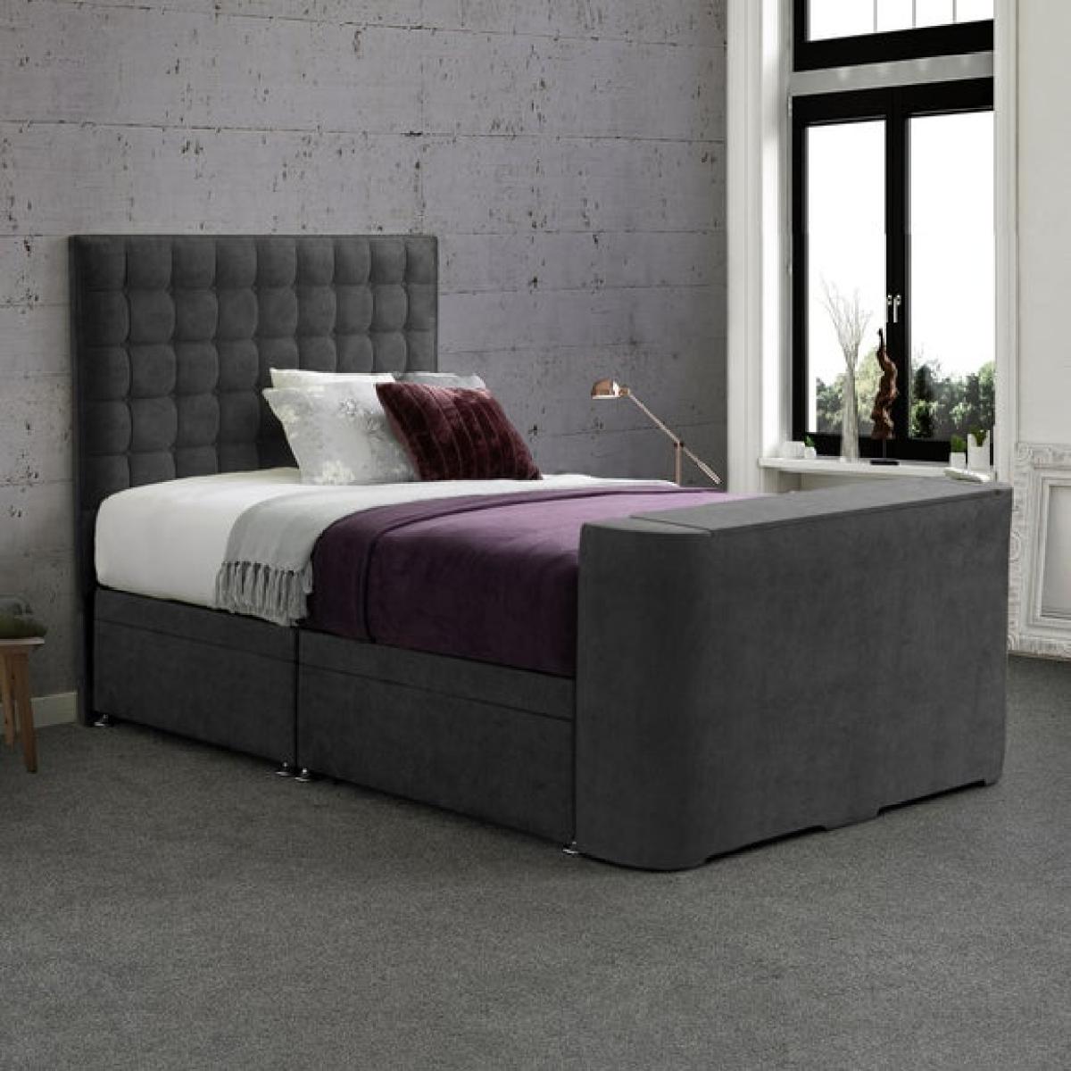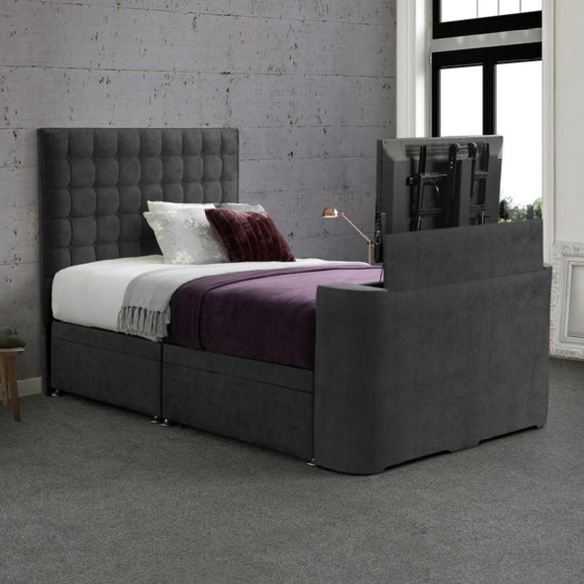 * Fits TVs up to 40" with max depth of 8cm (TV not included) * Vertical pleated headboard with geometric styling * Side-lift ottoman base for hidden storage * Available in a range of colour options * TV mechanism must be mains connected This bed is built for those who like their space neat and their evenings relaxed. Upholstered in soft-touch Luxy fabric, it’s available in a range of colours to suit your style. The headboard features a bold geometric pleated design, adding texture and structure to your room. At the foot end, a built-in TV lift holds screens up to 40" (TV not included), operated by remote and powered via mains connection. The side-lift ottoman base gives you plenty of hidden storage, ideal for keeping things out of sight. A practical pick for streamers, snoozers and tidy minds.