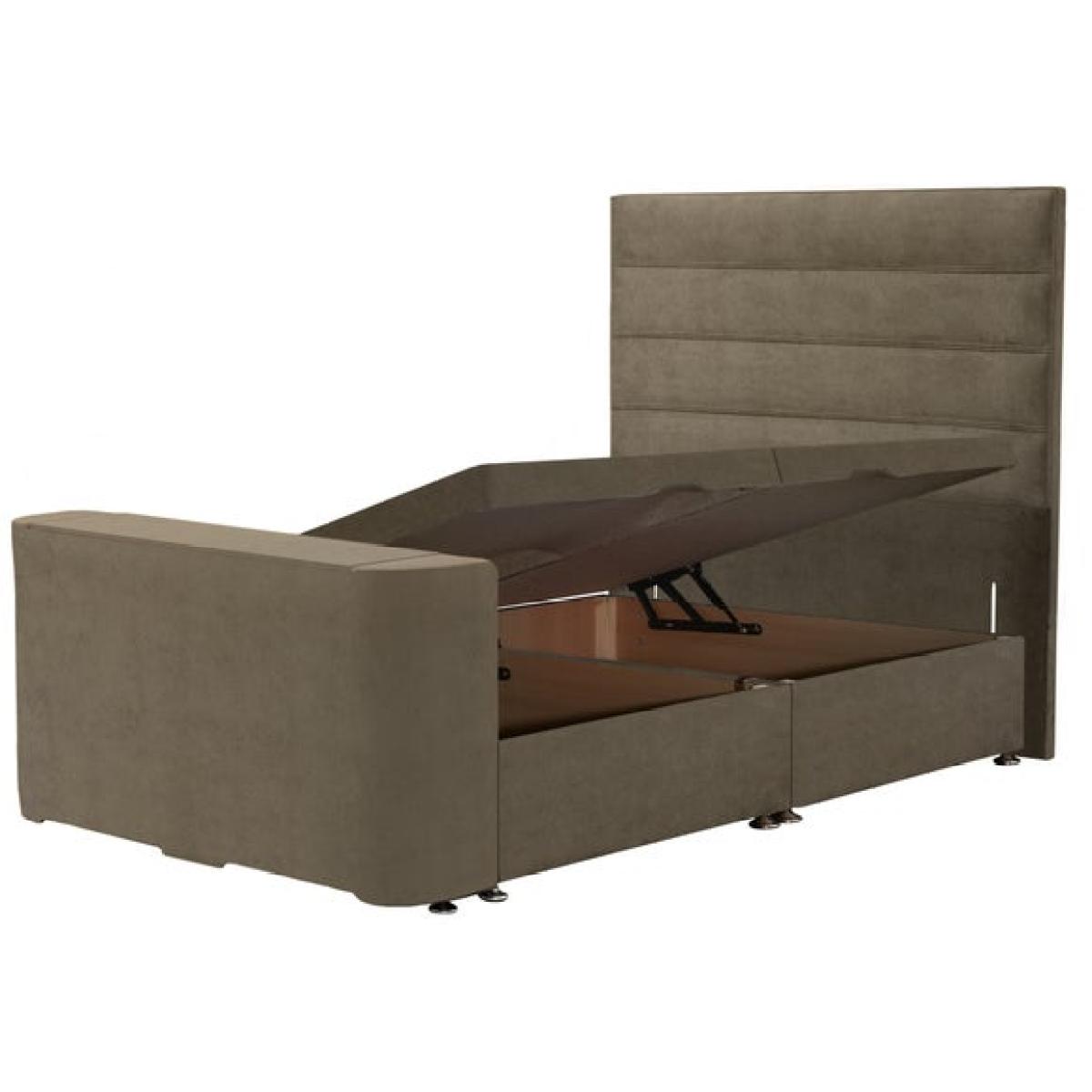 * Remote-controlled TV lift built into the foot end * Suitable for TVs up to 40" with max depth of 8cm (TV not included) * Horizontally pleated headboard for a modern look * Side-lift ottoman base for hidden storage * Available in a range of colour options A clever mix of storage and tech, the Gaia TV Bed is built for relaxed evenings and tidy spaces. Upholstered in soft-touch Luxy fabric, it’s available in a range of colours to suit your style. The horizontally pleated headboard adds a modern finish, while the foot end features a built-in TV lift for screens up to 40" (TV not included). The lift is remote-controlled and must be mains connected to operate. The side-lift ottoman base offers generous hidden storage, perfect for keeping things out of sight. A smart choice for those who like their bedroom to work a little harder.