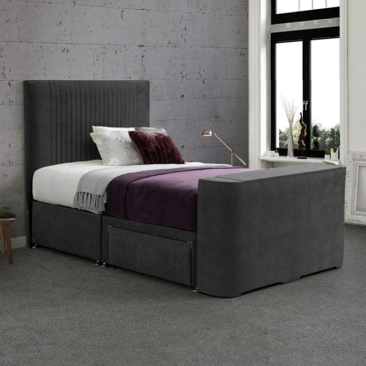 * Suitable for TVs up to 40" with max depth of 8cm (TV not included) * Luxy fabric upholstery with a soft, textured feel * Vertical pleated headboard for a structured look * Available in a range of colour and storage options A bold blend of tech and texture, the Gaia TV Bed is built for laid-back evenings and binge-worthy weekends. Upholstered in soft-touch Luxy fabric, it’s available in a range of colours to suit your space. The vertical pleated headboard adds a structured finish, while the foot end features a built-in TV lift for screens up to 40" (TV not included). The mechanism is remote-controlled and must be mains connected to work. The base is non-storage, with other storage options available across the Gaia range. Designed to keep things neat while adding a touch of modern comfort.