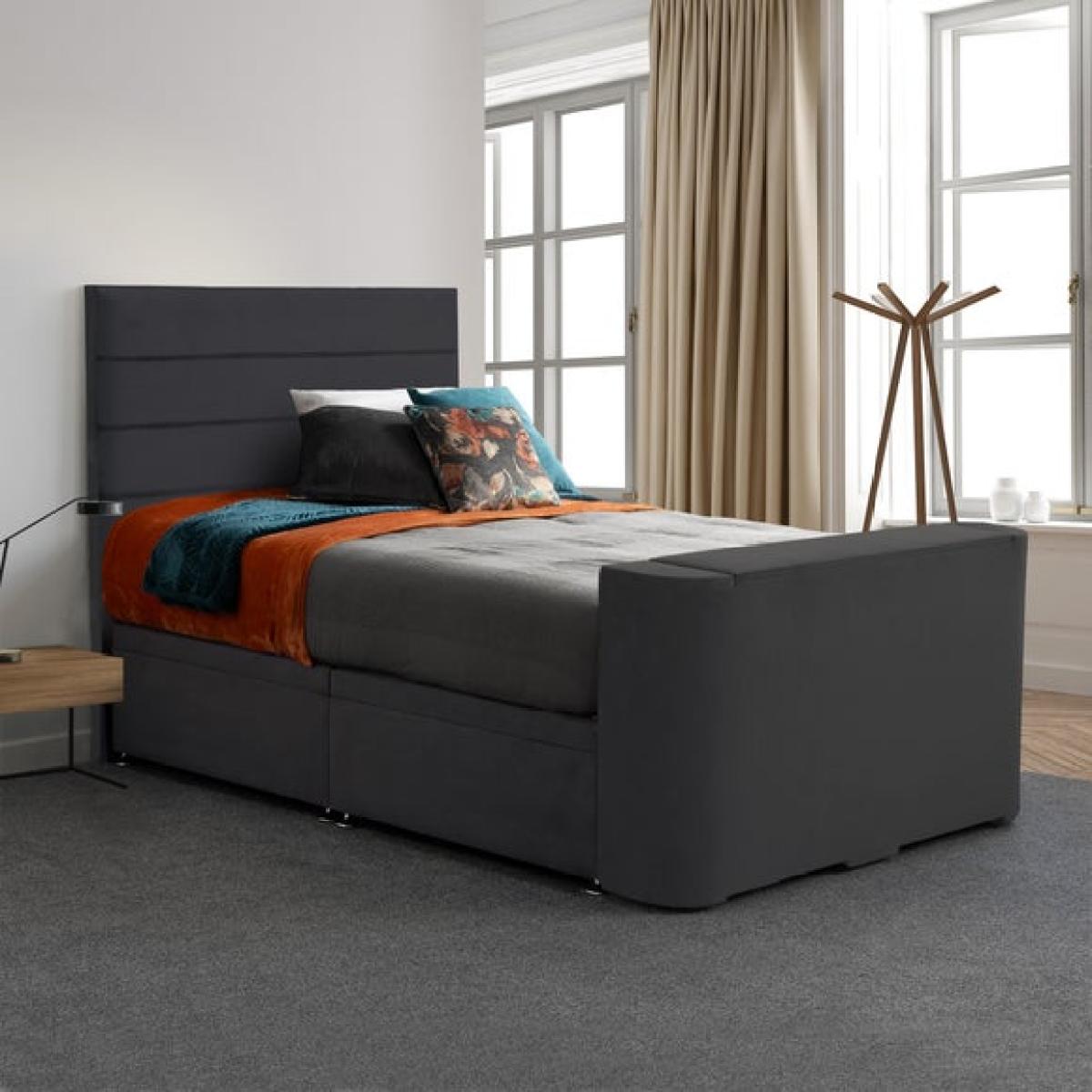 * Remote operated mechanism * Fits televisions up to 40 inches (not included) * Horizontal pleated headboard * Side lift ottoman base for storage * Available in multiple colours A bed that keeps things neat while adding a touch of tech. Upholstered in plush Luxy fabric, it’s soft to the touch and available in a range of colours to suit your space. The headboard features horizontal pleating for a structured finish that works well in modern bedrooms. At the foot end, there’s a built-in compartment designed to hold a television up to 40 inches in size and 8 centimetres in depth. The lift is operated by remote and must be connected to mains power. The TV is not included, so you can choose the model that suits you best.