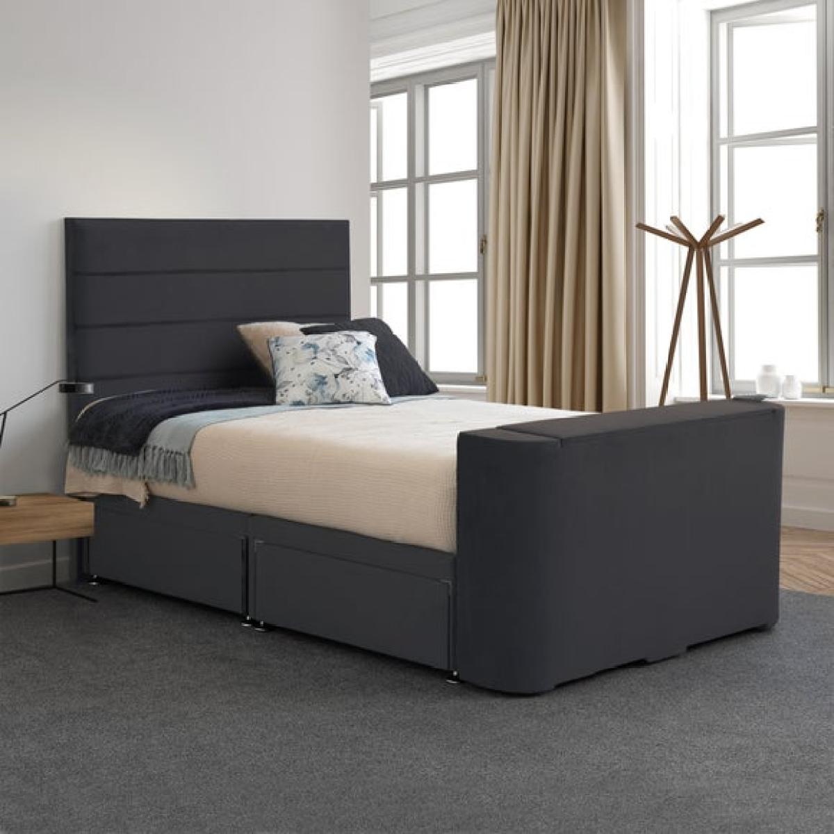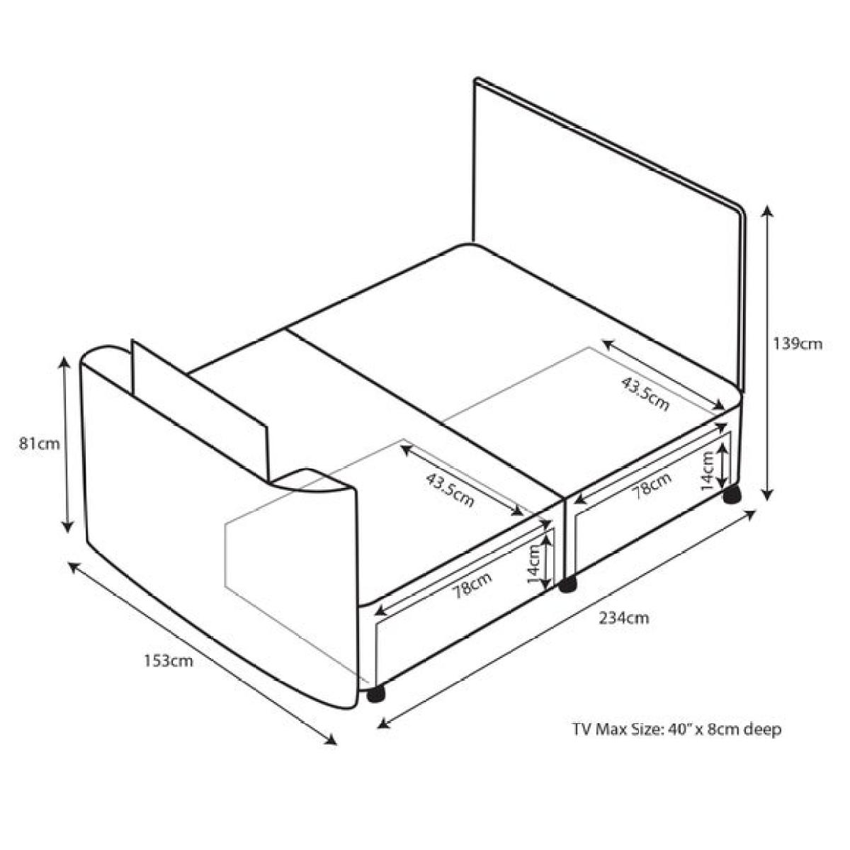 * Fits TVs up to 40" with max depth of 8cm (TV not included) * Upholstered in plush velvet-textured Opulence fabric * Horizontally pleated headboard for a modern finish * Available in multiple colour and storage options Soft-touch velvet meets smart bedroom tech in this plush TV bed. Upholstered in Opulence fabric, it’s available in a range of colours to suit your style. The horizontally pleated headboard adds a modern finish, while the foot end features a TV-ready compartment for screens up to 40". A remote-controlled mechanism lifts your TV smoothly into view, ready for movie nights or lazy mornings. Just connect to the mains and enjoy your favourite shows from bed. Please note: TV is not included.
