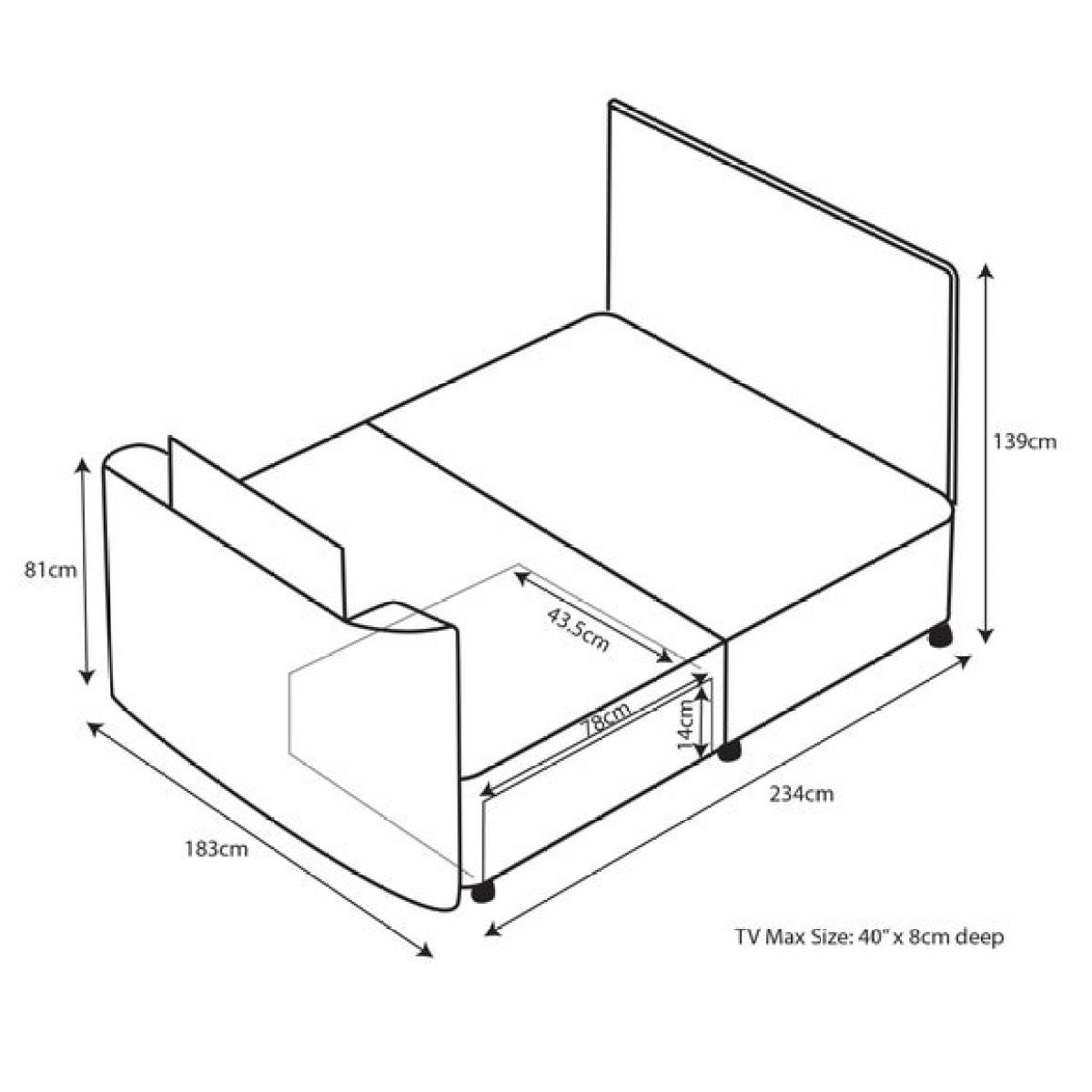 * Fits TVs up to 40" with max depth of 8cm (TV not included) * Upholstered in plush velvet-textured Opulence fabric * Horizontally pleated headboard for a modern finish * Available in multiple colour and storage options Soft-touch velvet meets smart bedroom tech in this plush TV bed. Upholstered in Opulence fabric, it’s available in a range of colours to suit your style. The horizontally pleated headboard adds a modern finish, while the foot end features a TV-ready compartment for screens up to 40". A remote-controlled mechanism lifts your TV smoothly into view, ready for movie nights or lazy mornings. Just connect to the mains and enjoy your favourite shows from bed. Please note: TV is not included.