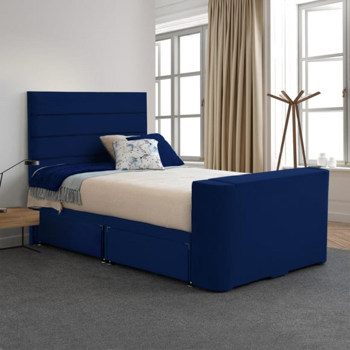 * Fits TVs up to 40" with max depth of 8cm (TV not included) * Upholstered in plush velvet-textured Opulence fabric * Horizontally pleated headboard for a modern finish * Available in multiple colour and storage options Soft-touch velvet meets smart bedroom tech in this plush TV bed. Upholstered in Opulence fabric, it’s available in a range of colours to suit your style. The horizontally pleated headboard adds a modern finish, while the foot end features a TV-ready compartment for screens up to 40". A remote-controlled mechanism lifts your TV smoothly into view, ready for movie nights or lazy mornings. Just connect to the mains and enjoy your favourite shows from bed. Please note: TV is not included.