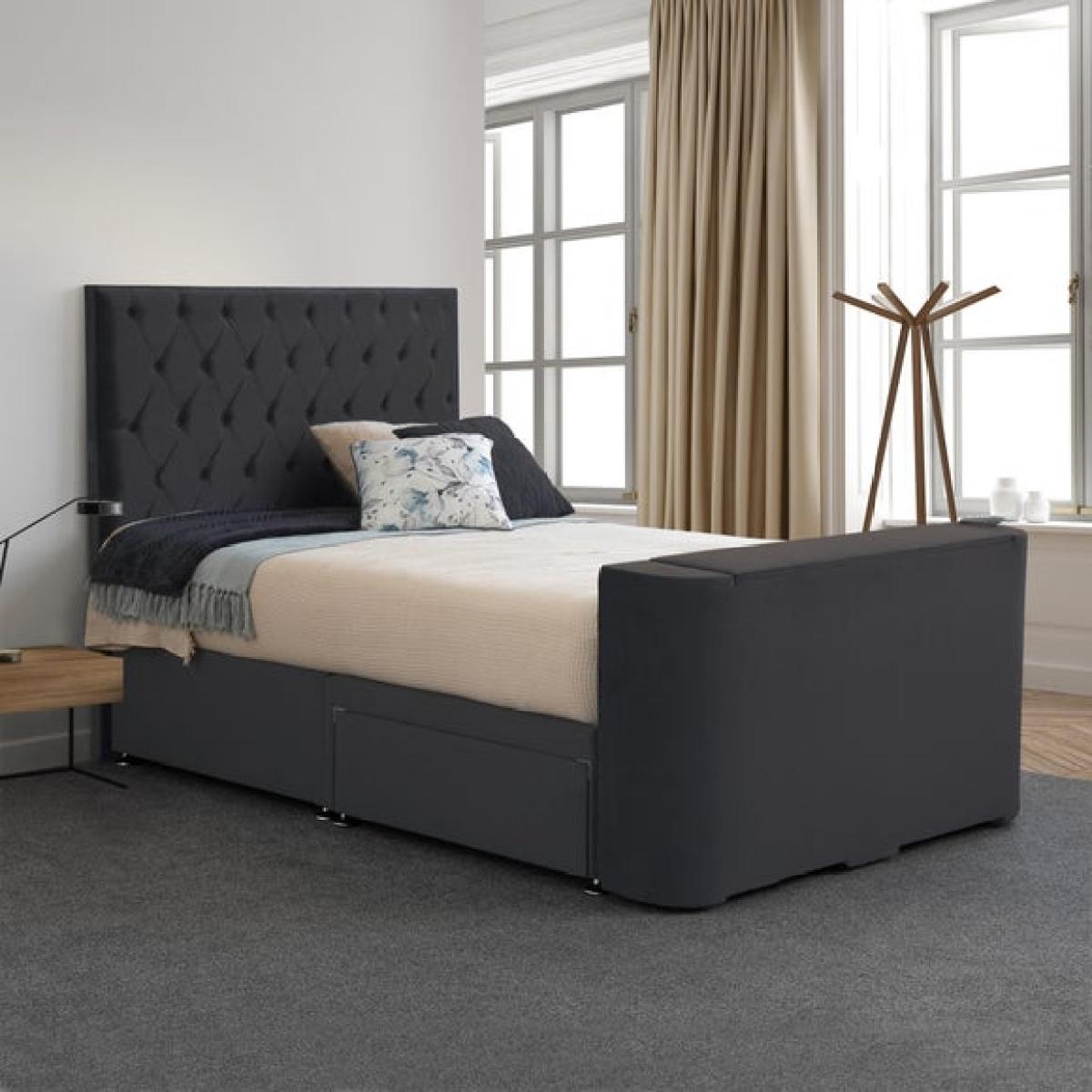 * Side lift ottoman base for spacious storage * Studded headboard for a stylish finish * TV ready foot end with remote controlled lift * Fits TVs up to 40 inches with a maximum depth of 8 cm TV not included Bring comfort, storage and entertainment together with the Sweet Dreams Opulence Studded TV Bed. The studded headboard adds a stylish feature while the side lift ottoman base provides generous hidden storage for bedding and more. The foot end is TV ready so you can enjoy your favourite shows from the comfort of your bed. Please note TV is not included as this frame supports screens up to 40 inches with a maximum depth of 8 cm. A remote controlled mechanism makes it easy to raise and lower your TV and it must be mains connected for use. Available in a choice of colours to suit your bedroom.