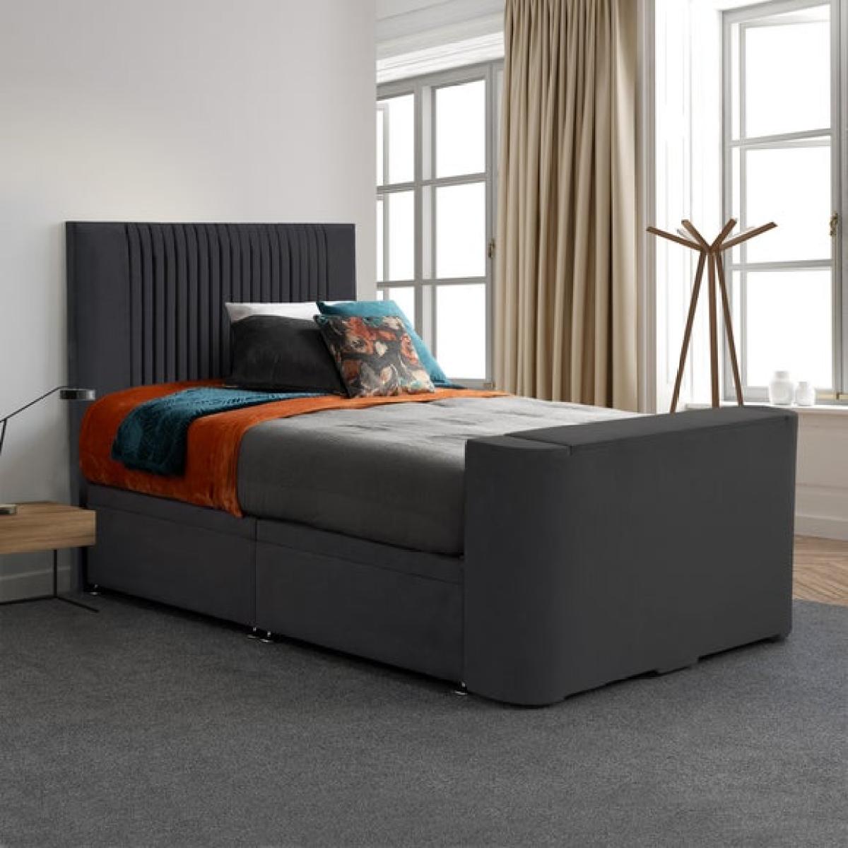 * Side-lift ottoman base for spacious storage * Vertically pleated headboard for a modern look * TV-ready foot end with remote-controlled lift * Fits TVs up to 40" (max depth 8cm) – TV not included Enjoy comfort, storage and entertainment in one smart design. The vertically pleated headboard adds a stylish touch while the side lift ottoman base gives you generous hidden storage for bedding and more. The foot end is TV ready so you can relax and watch from bed at the touch of a button. Please note TV is not included as this frame supports screens up to 40 inches with a maximum depth of 8 cm. A remote controlled mechanism makes it easy to raise and lower your TV and it must be mains connected for use. Available in a choice of colours to suit your bedroom.