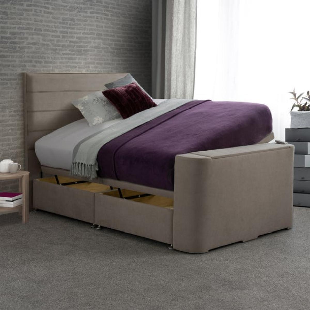* Suitable for TVs up to 40" with max depth of 8cm (TV not included) * Horizontally pleated headboard with a structured finish * Side-lift ottoman base for hidden storage * Available in a range of colour options Built for comfort and clever storage, the Venice TV Bed brings tech and texture together in one smart design. Upholstered in soft-touch Venice fabric with a contemporary finish, it’s available in a range of colours to suit your space. The horizontally pleated headboard adds a clean, structured look, while the foot end features a built-in TV lift for screens up to 40" (TV not included). The lift is remote-controlled and must be mains connected to operate. The side-lift ottoman base offers generous hidden storage, ideal for keeping clutter out of sight.