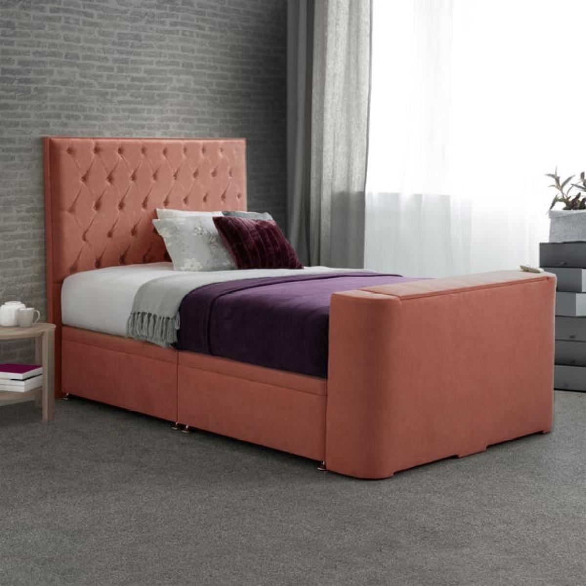 * Suitable for TVs up to 40" with max depth of 8cm (TV not included) * Upholstered in textured Venice fabric * Studded headboard with a tailored look * Side-lift ottoman base for hidden storage Tech meets texture in the Venice TV Bed, designed for laid-back evenings and clever storage. Upholstered in soft-touch Venice fabric with a contemporary feel, it’s available in a range of colours to suit your space. The studded headboard adds a tailored finish, while the foot end features a TV-ready compartment for screens up to 40" (TV not included). The lift mechanism is remote-controlled and must be mains connected to operate. The side-lift ottoman base offers generous hidden storage, ideal for keeping things tucked away.