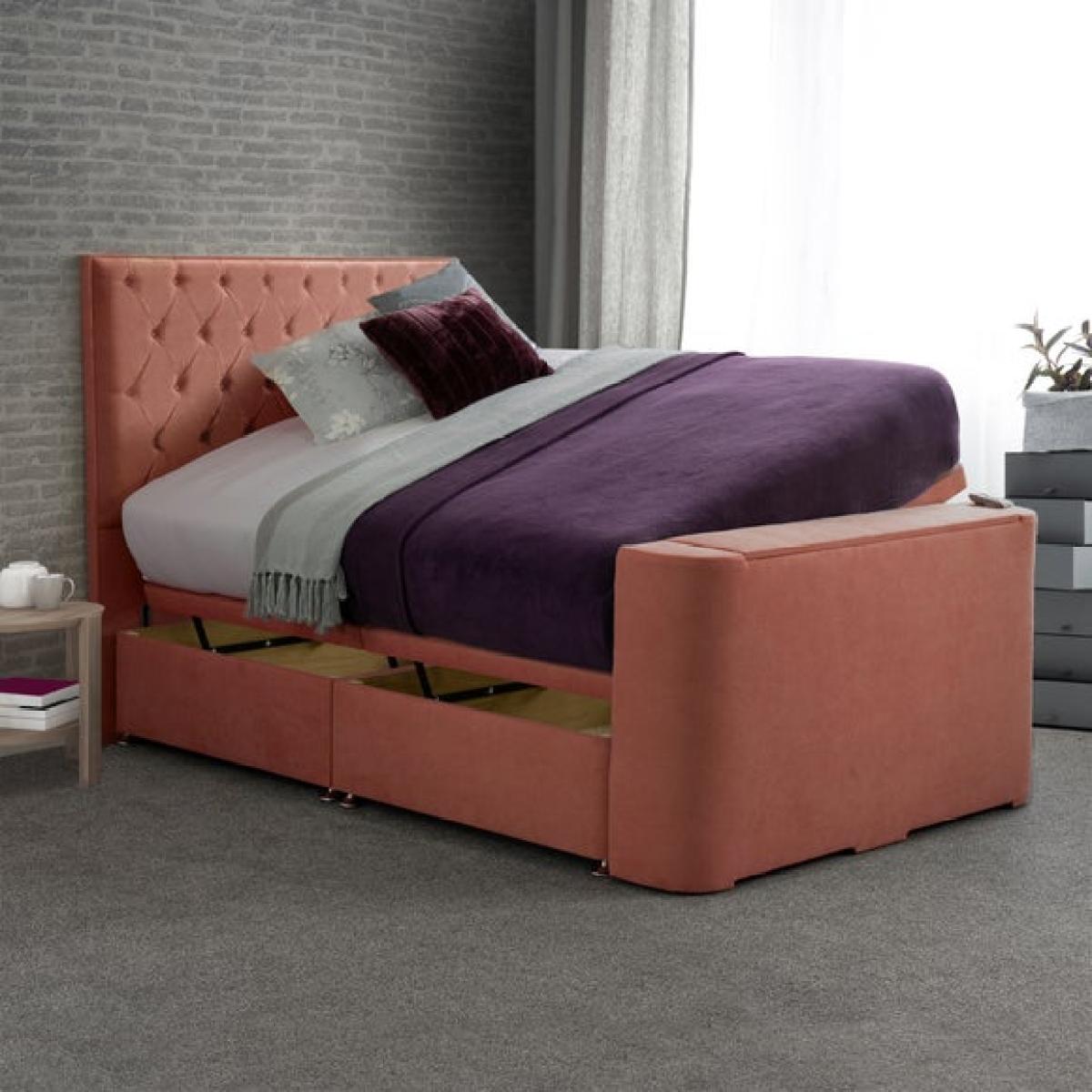 I love this bed for its blend of practical storage with a stylish, contemporary look. The studded side lift ottoman offers clever hidden space, perfect for decluttering without sacrificing design, making it ideal for multifunctional bedrooms or smaller spaces. It works well in modern, eclectic, or even luxe interiors, especially when paired with rich textiles and plush cushions to soften the look. For styling, consider layering neutral bedding with textures like velvet or faux fur to add comfort and visual interest. Keep the colour palette versatile-this blush tone pairs beautifully with muted greys, deep navies, or metallic accents to create an inviting, well-curated bedroom.