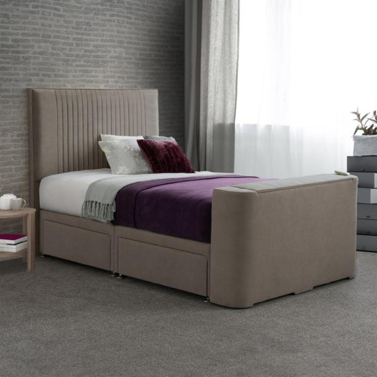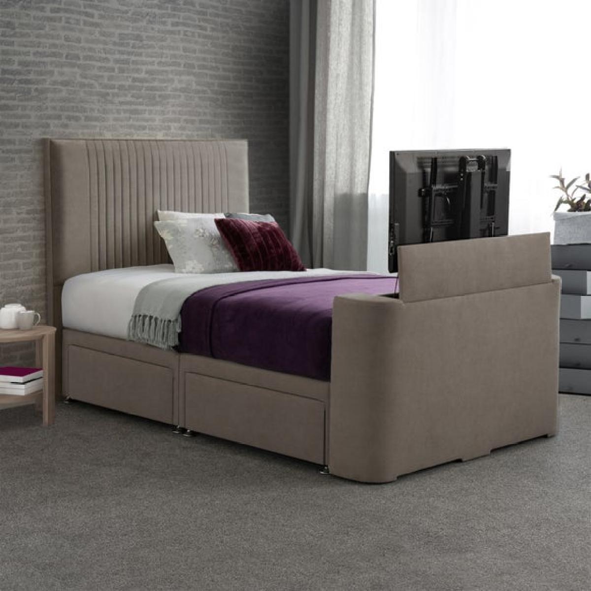 * Fits TVs up to 40" with max depth of 8cm (TV not included) * Upholstered in textured Venice fabric * Vertically pleated headboard for a modern look * Available in multiple colour options Designed with comfort and convenience in mind, the Venice TV Bed brings a modern touch to your bedroom. Upholstered in textured Venice fabric, it’s available in a range of colours to suit your space. The vertically pleated headboard adds a contemporary finish, while the foot end houses a TV-ready compartment for screens up to 40". With a remote-controlled lift mechanism, your TV rises smoothly into view whenever you're ready to unwind. The bed base is non-storage, keeping the focus on style and tech-friendly function. Just plug into the mains and enjoy your favourite shows from the comfort of bed. Please note: TV is not included.