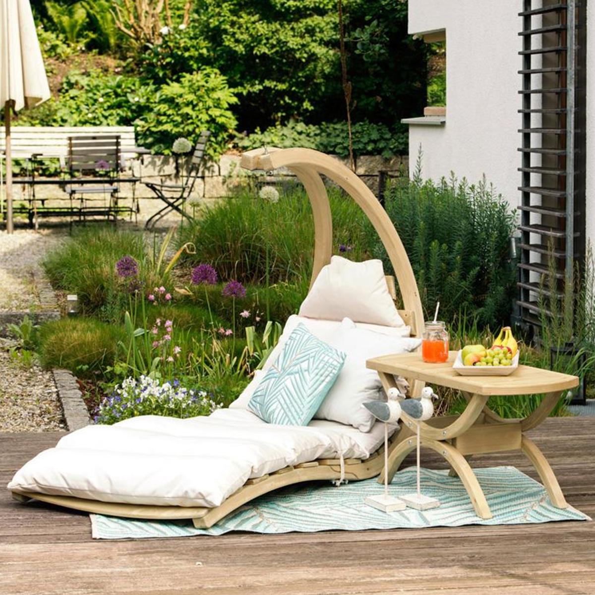 Swing Lounger combines maximum hanging comfort with a modern and stylish design, making it an eye-catching feature for any home. The elegantly curved reclining surface is precisely adjusted to the body, so you can lean back comfortably, relax and enjoy. The Swing Lounger is the product of painstaking craftsmanship and is made from weather-resistant treated spruce. The high-class laminated glueing makes it particularly stable and secure. The extra-thick, water-repellent and rapidly drying mattress is your guarantee of perfect relaxation. The highly durable Agora cover is as soft as cotton, but it is exceptionally light-resistant and weatherproof. It is also water-repellent, proof against mildew, insensitive to dirt and easy to clean. The Swing Lounger can be used either as a gently rocking recliner on the ground, or as a perfectly balanced floating recliner in the Globo Stand frame (not included, spiral spring is included)."