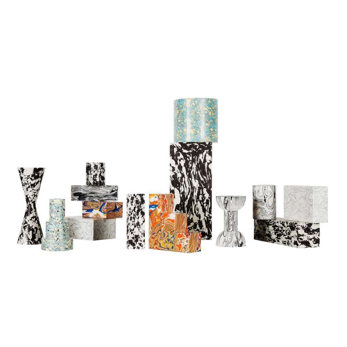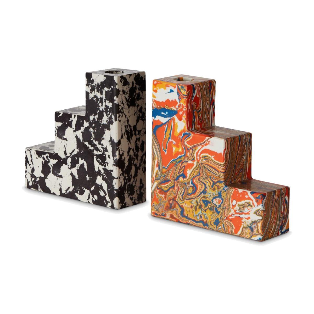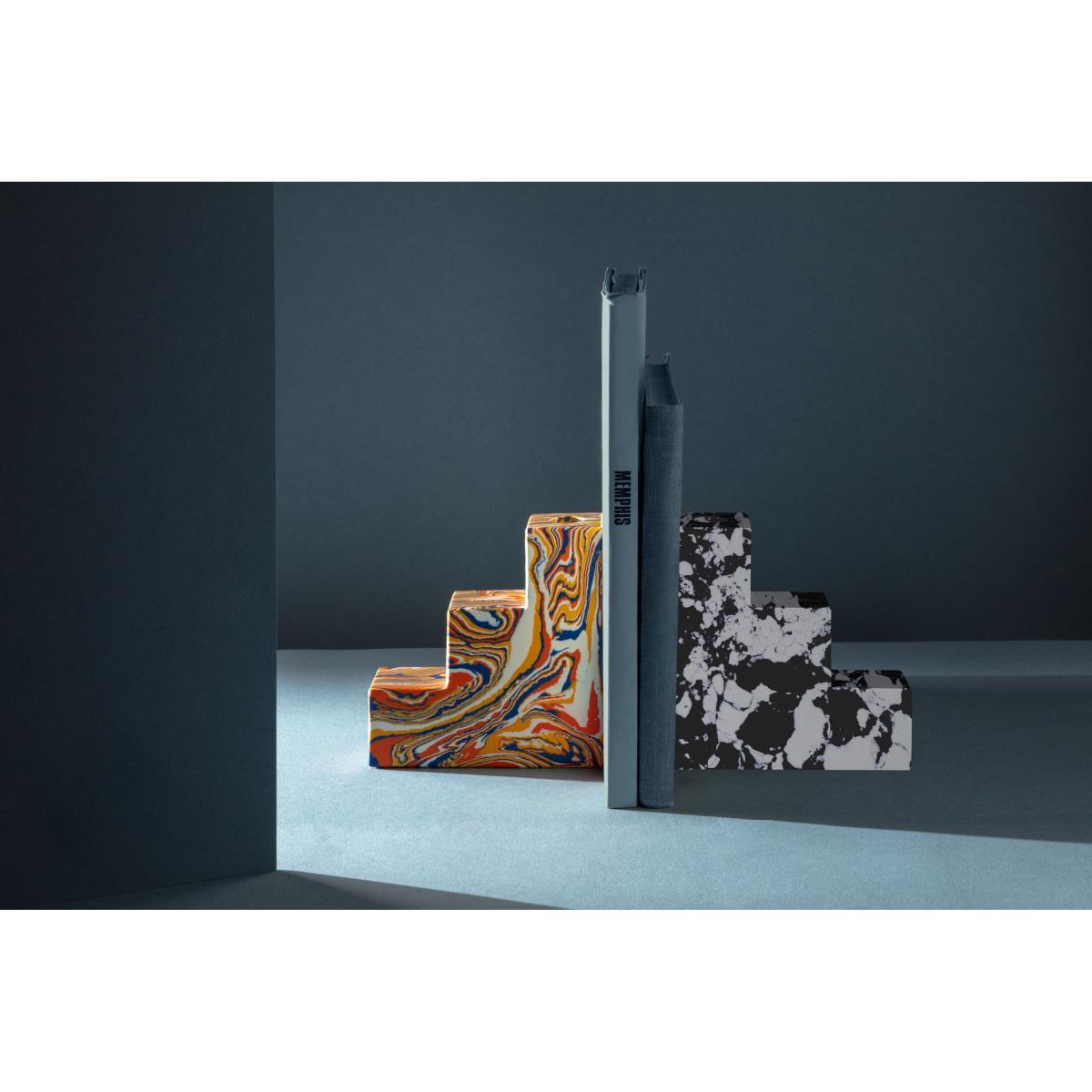 Both refined and modern, the Swirl collection features a sculptural, sophisticated construction. Highly graphic, these stair-shaped bookends also act as candle holders (for long candles). Tom Dixon pursues his artistic research inspired by post-consumer processes, the waste phenomenon and its management, and the recycling practices of used materials. The Swirl collection is made up of a material that imitates marble, made from industrial waste: recycled marble powder from sawmills. This powder is mixed with coloured pigments and resin. The material is then cut and turned by hand. The marble pattern provides superb mineral decoration. Placed on a sideboard, shelf, desk or bedside table, these bookends will keep your favourite novels in place with a lot of class! Set of 2 bookends (1 multicoloured + 1 black & white). Through the pigmentation process, each piece has a unique pattern.