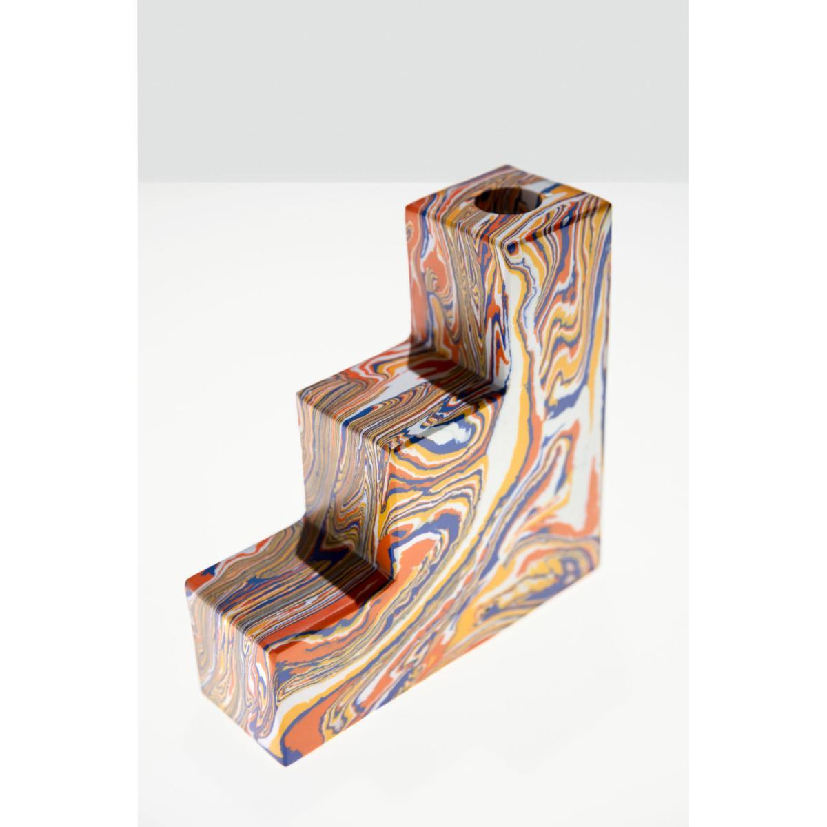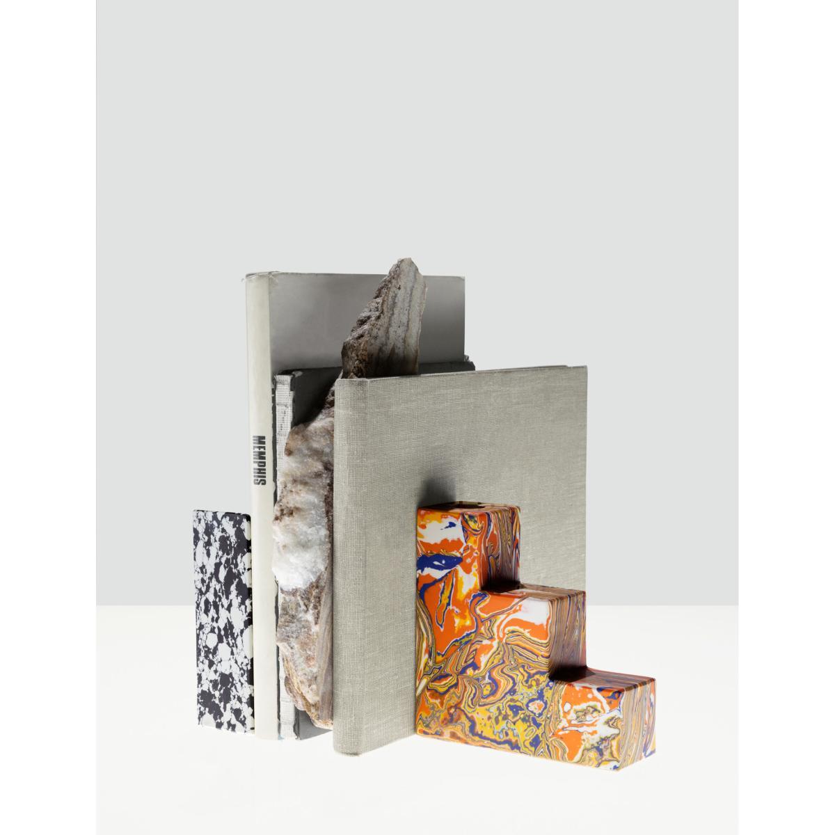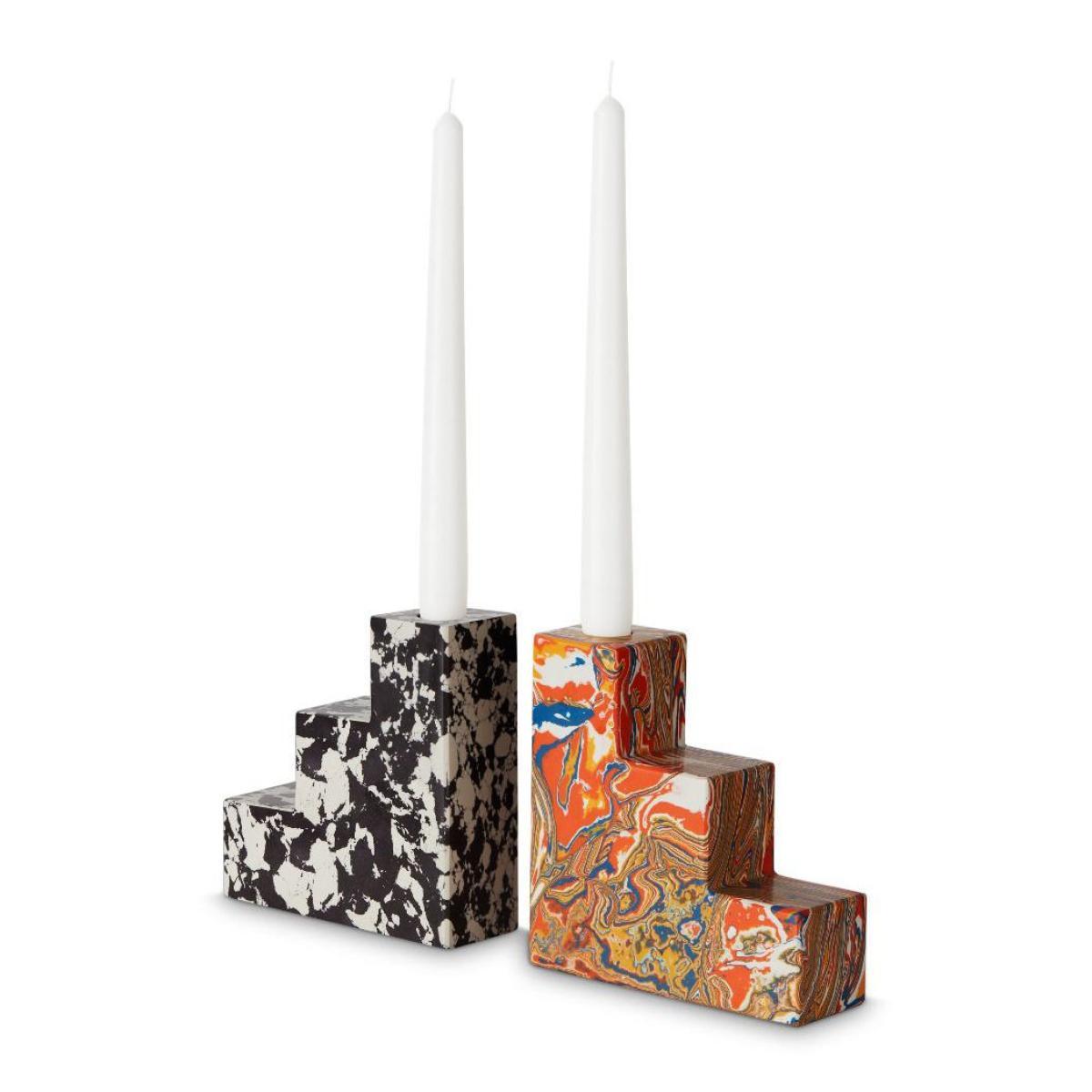 Both refined and modern, the Swirl collection features a sculptural, sophisticated construction. Highly graphic, these stair-shaped bookends also act as candle holders (for long candles). Tom Dixon pursues his artistic research inspired by post-consumer processes, the waste phenomenon and its management, and the recycling practices of used materials. The Swirl collection is made up of a material that imitates marble, made from industrial waste: recycled marble powder from sawmills. This powder is mixed with coloured pigments and resin. The material is then cut and turned by hand. The marble pattern provides superb mineral decoration. Placed on a sideboard, shelf, desk or bedside table, these bookends will keep your favourite novels in place with a lot of class! Set of 2 bookends (1 multicoloured + 1 black & white). Through the pigmentation process, each piece has a unique pattern.