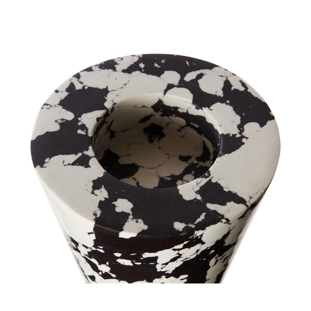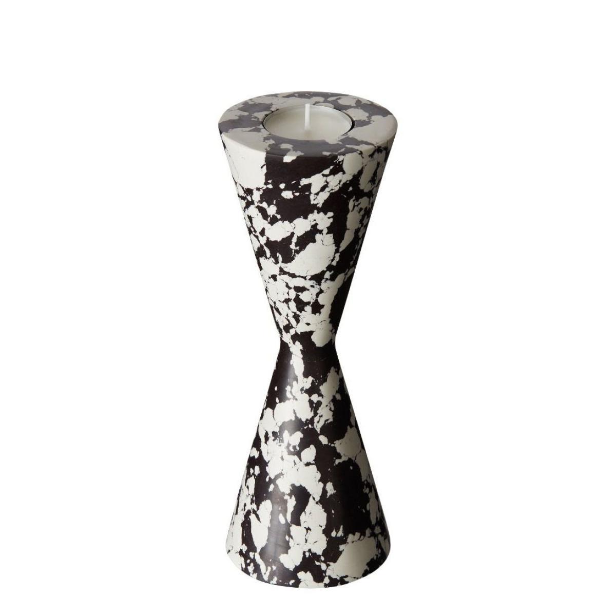 Both refined and modern, the Swirl collection features a sculptural, sophisticated construction that explores the notion of balance. Ultra-graphic, this candlestick has a solid geometric shape. Reversible, it can accommodate long candles or tealights. Tom Dixon pursues his artistic research inspired by post-consumer processes, the waste phenomenon and its management, and the recycling practices of used materials. The Swirl collection is made up of a material that imitates marble, made from industrial waste: recycled marble powder from sawmills. This powder is mixed with coloured pigments and resin. The material is then cut and turned by hand. The marble pattern provides superb mineral decoration. Through the pigmentation process, each piece has a unique pattern.