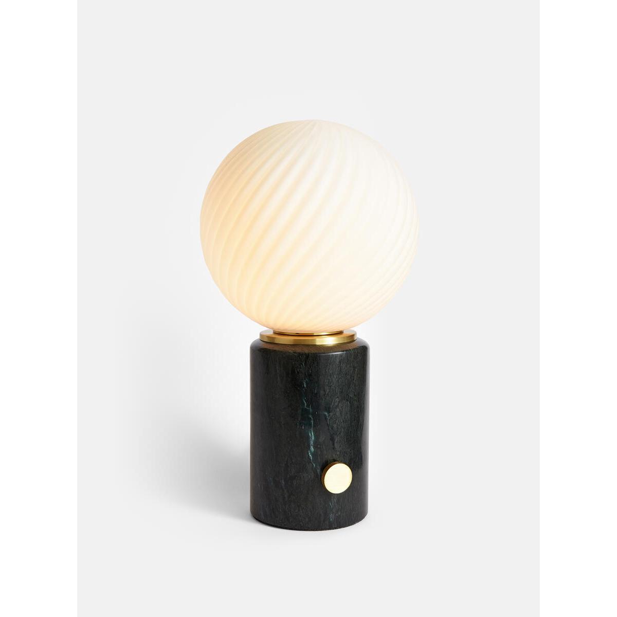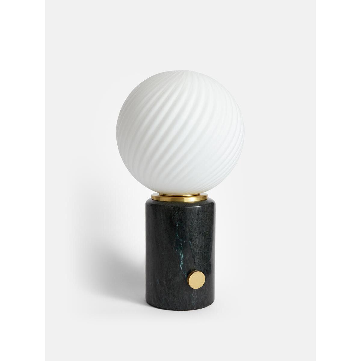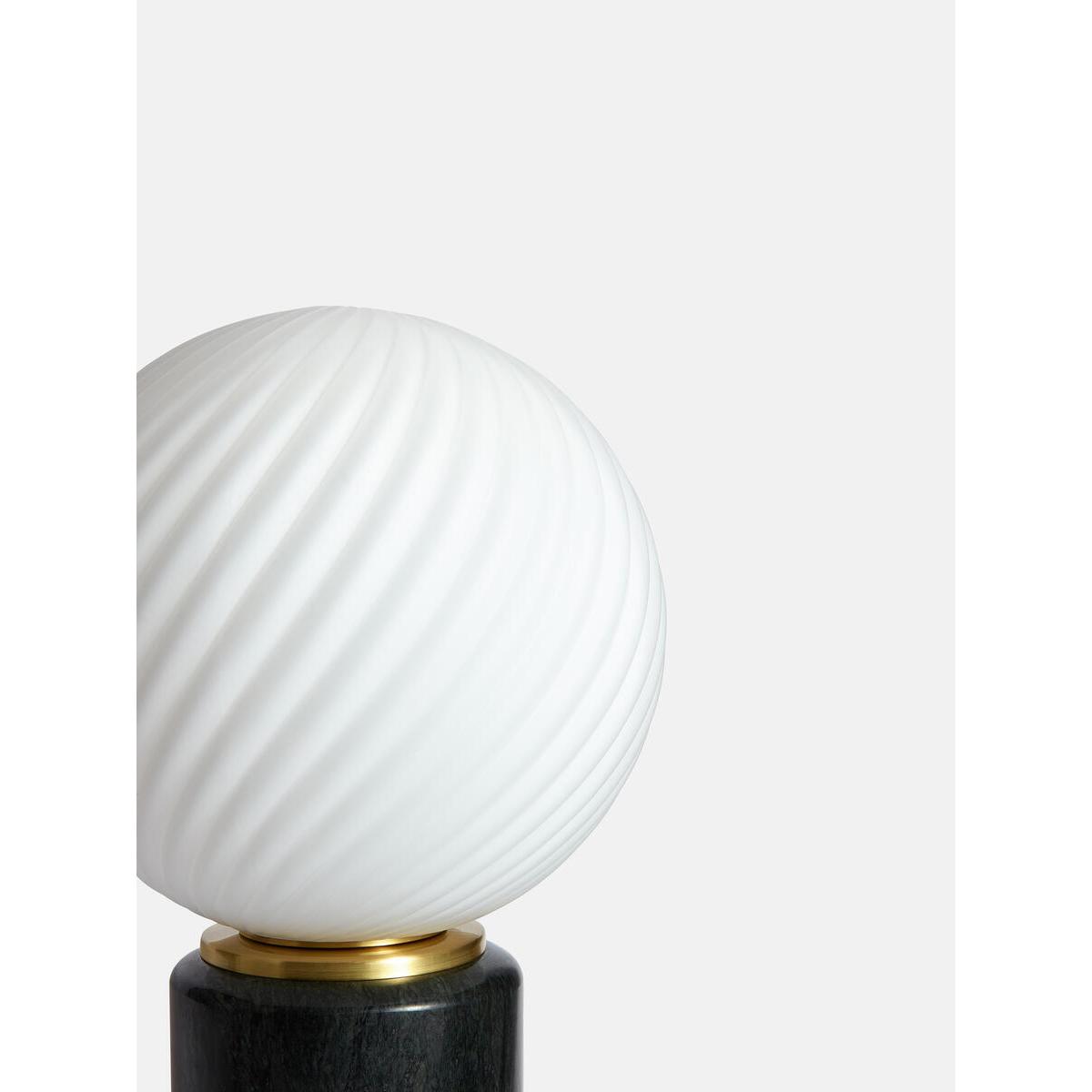 Inspired by vintage Murano glass designs from the 1960s and theinteriors at DUMBO House in Brooklyn, this lamp is topped with aspiral cut globe shade. The solid marble base is minimally detailedwith an antique brass dimmer switch so you can create a warm lightor soft glow to suit your mood. Spiral cut frosted glass globe shade. European marble base with distinctive veining. Natural variations in marble make each lamp unique. Antique brass finish dimmer switch. Bulb included. Inspired by DUMBO House. 1 / G9 / 28W MAXIMUM.