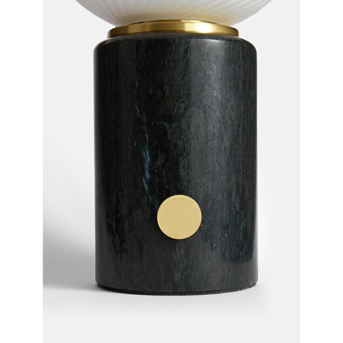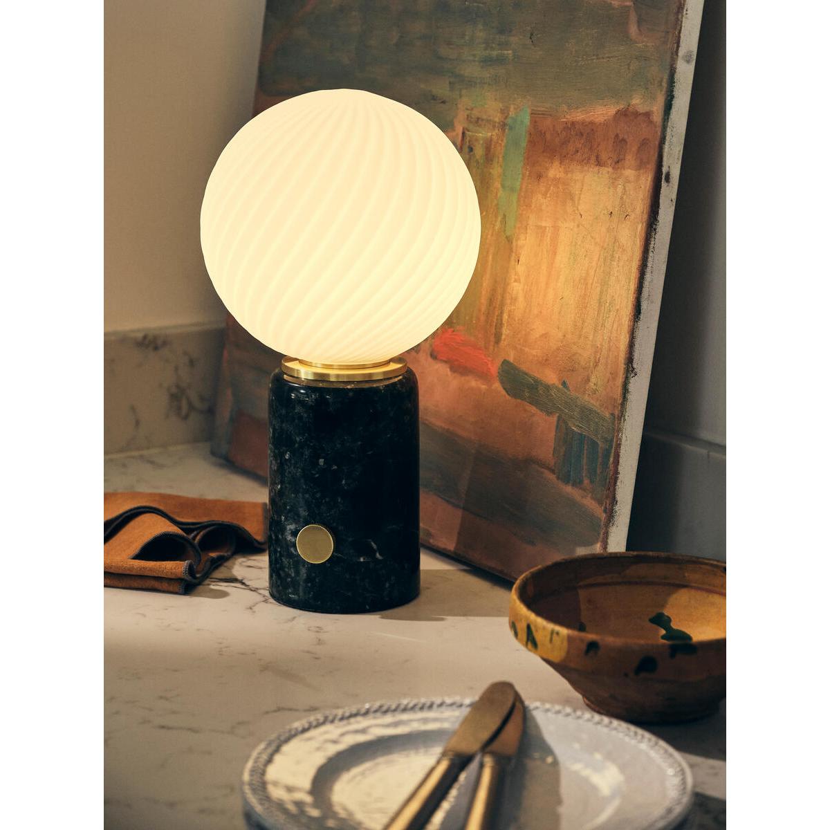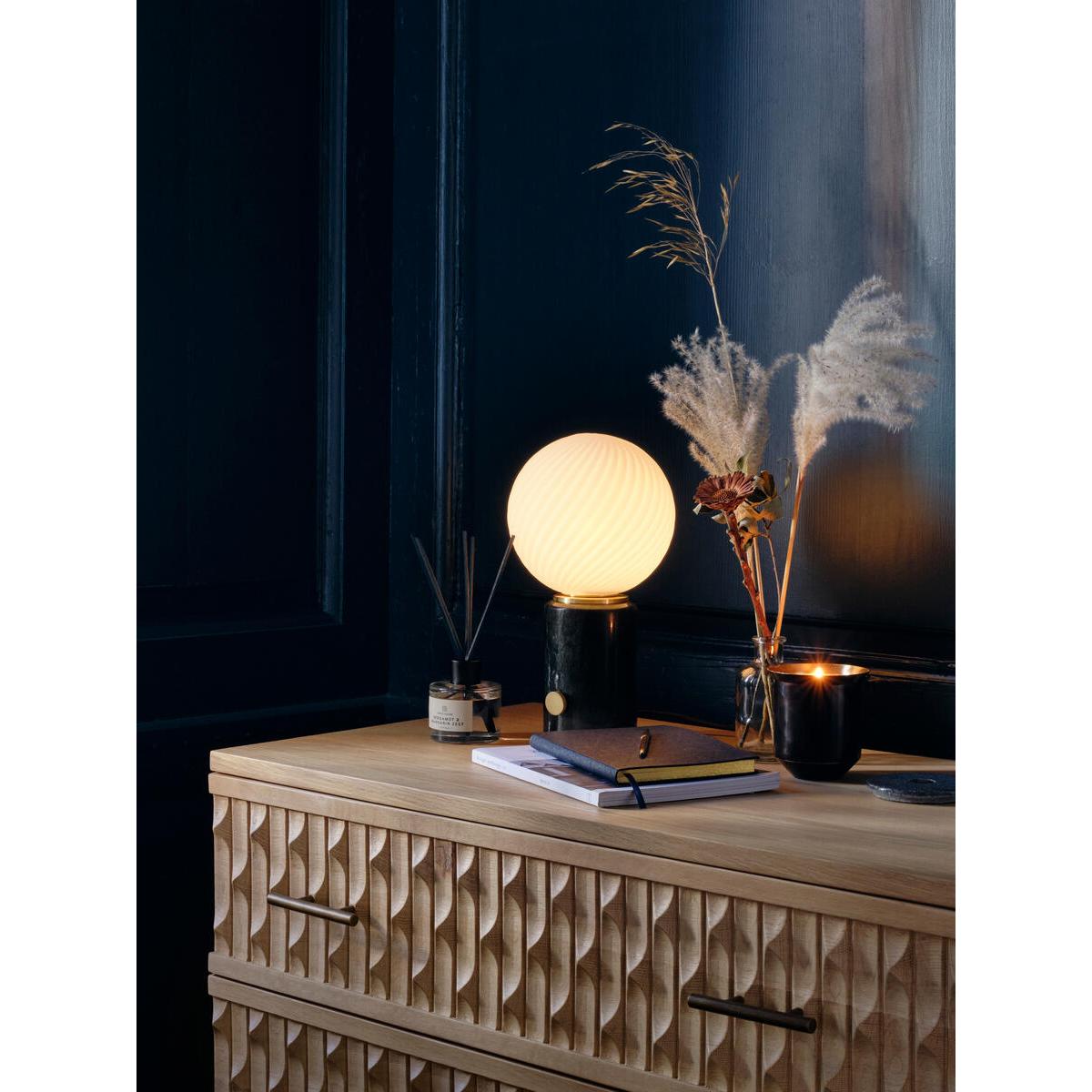 Inspired by vintage Murano glass designs from the 1960s and theinteriors at DUMBO House in Brooklyn, this lamp is topped with aspiral cut globe shade. The solid marble base is minimally detailedwith an antique brass dimmer switch so you can create a warm lightor soft glow to suit your mood. Spiral cut frosted glass globe shade. European marble base with distinctive veining. Natural variations in marble make each lamp unique. Antique brass finish dimmer switch. Bulb included. Inspired by DUMBO House. 1 / G9 / 28W MAXIMUM.