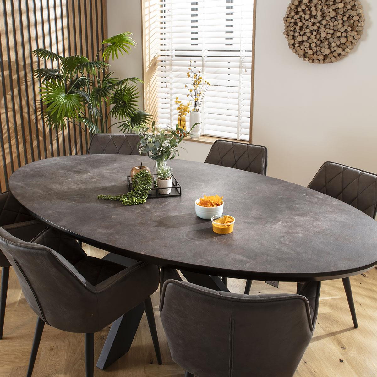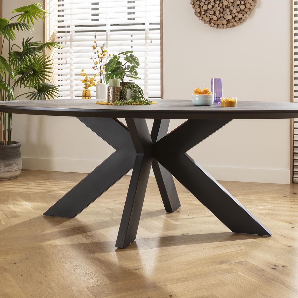 Enhance your dining room with our ultra-modern oval dining table. This sleek black dining table measures 220cm x 120cm, seating up to 8 comfortably. Featuring a matte black HPL textured finish tabletop atop powder-coated metal legs in a striking star design. Ideal for modern homes seeking a bold centerpiece. Crafted with a 43mm MDF tabletop coated in durable HPL, our oval dining table exudes contemporary elegance. The tabletop's matte black textured finish not only adds sophistication but also ensures longevity and easy maintenance. The star leg design with chunky black metal legs provides robust stability while complementing its ultra-modern appeal. The tabletop's matte black HPL finish sets a bold statement in any dining room, blending seamlessly with modern decor schemes. Its textured surface adds depth and style, enhancing the overall aesthetic of this modern oval kitchen table. The sleek black finish makes it a versatile choice for both formal dinners and casual gatherings. Designed for convenience, assembling our oval dining table is hassle-free. Simply fix the powder-coated legs to the tabletop using the provided hardware and instructions. This quick setup ensures you can enjoy your new dining centerpiece in no time, without compromising on its sturdy construction or striking design. W220cm D120cm H76cm High Pressure Laminate (HPL) is considered one of the most durable decorative surface materials 15cm x 5cm Legs