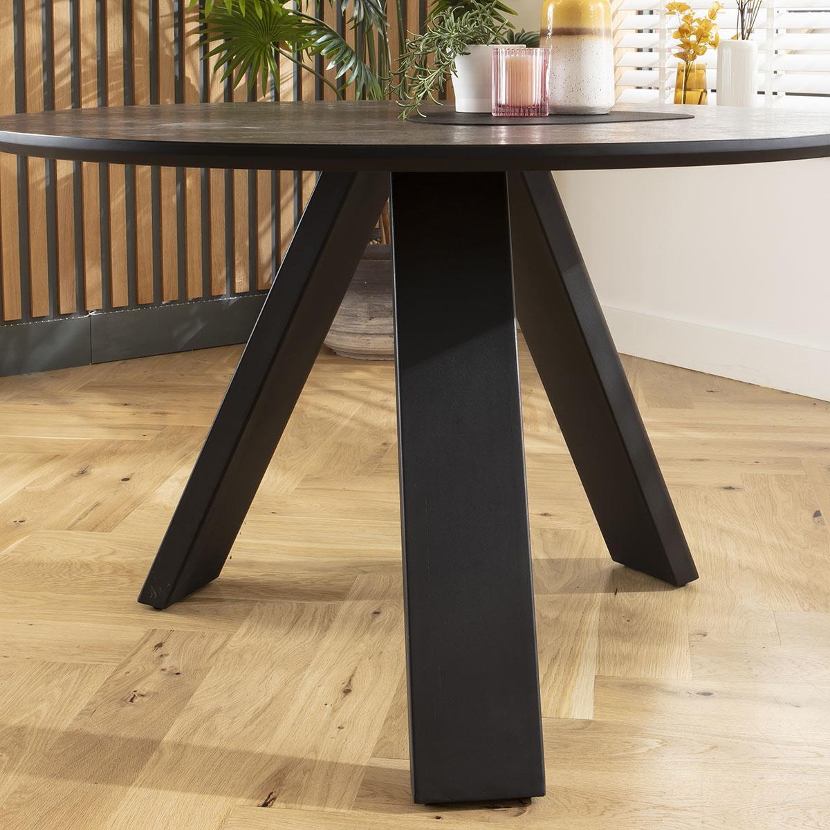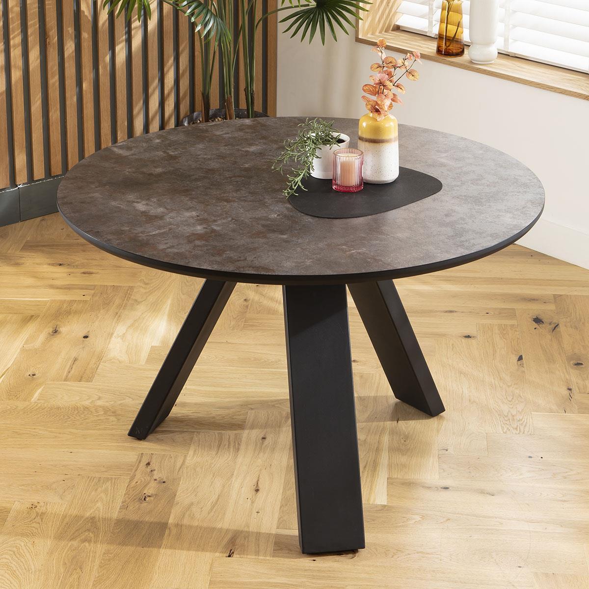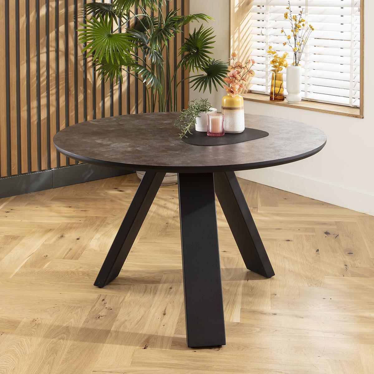 Elevate your dining space with this round black dining table, a sleek and ultra-modern addition. This small round dining room table features a 120cm diameter, ideal for seating up to 4. Its matte black HPL textured tabletop rests on chunky, powder-coated metal legs, boasting a bold and contemporary design. Designed for style and durability, this modern round kitchen table combines a 25mm MDF tabletop with a hardwearing HPL finish. The three-point leg design ensures stability while adding a striking visual appeal to any dining area. Perfect for intimate meals or casual gatherings, it blends seamlessly into any modern interior. The tabletop's matte black finish not only enhances its modern aesthetic but also provides a durable surface resistant to scratches and easy to clean. This small round dining table effortlessly complements various decor styles, from minimalist to industrial, adding a sophisticated touch to your home. Assembly of our ultra-modern dining table is quick and straightforward, requiring minimal effort. Simply fix the chunky black metal legs securely to the tabletop using the provided hardware and instructions. Enjoy hassle-free setup and start enjoying meals around this stylish centerpiece in no time. W120cm D120cm H76cm High Pressure Laminate (HPL) is considered one of the most durable decorative surface materials 15cm x 5cm Legs
