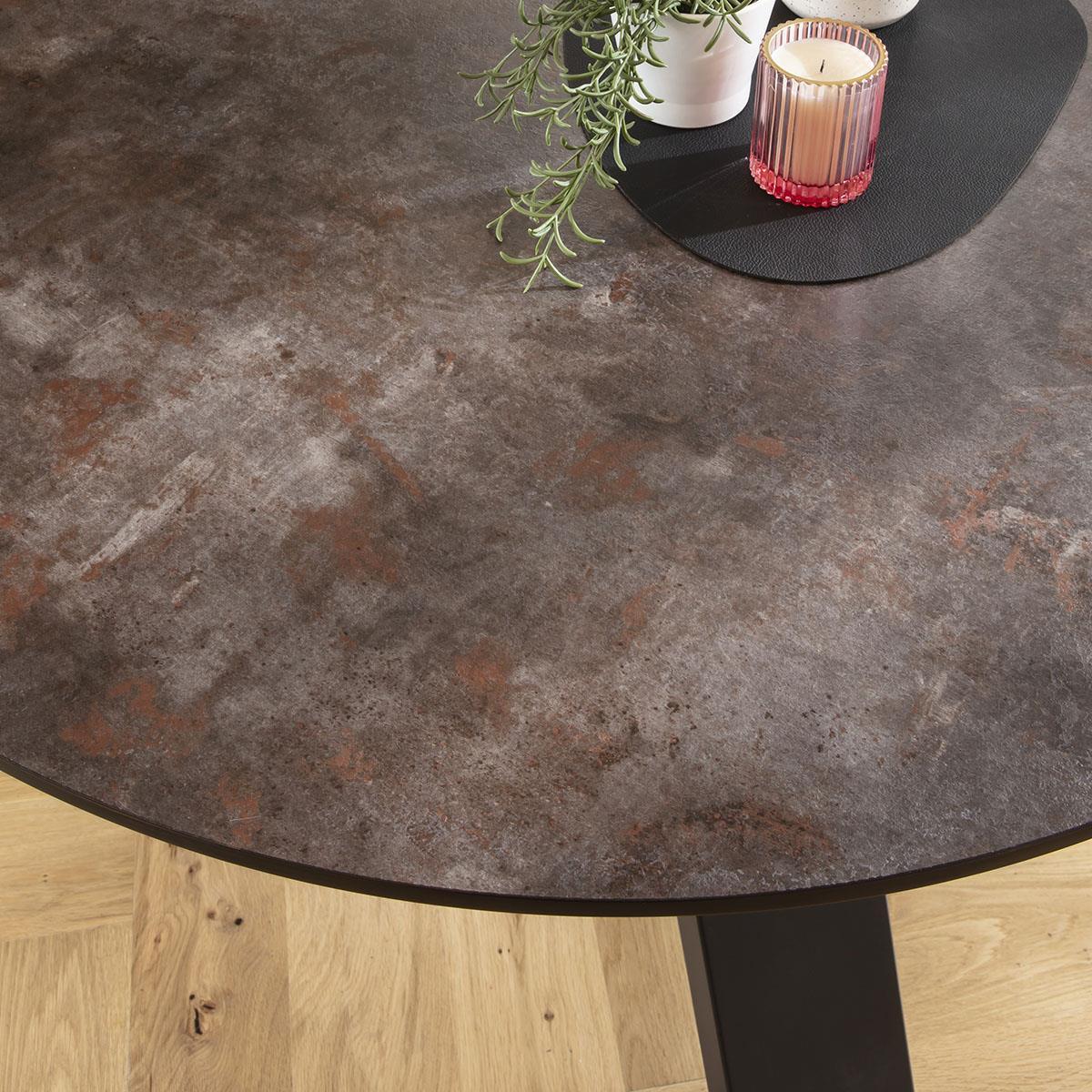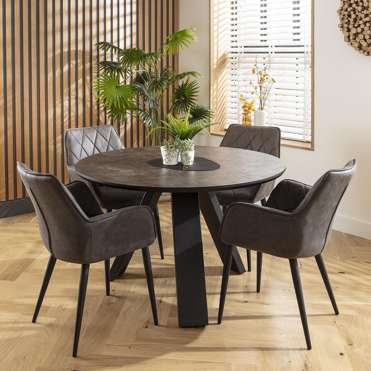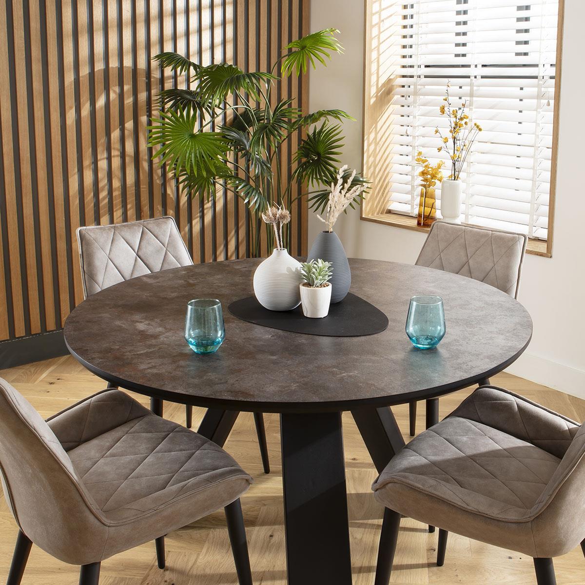 Elevate your dining space with this round black dining table, a sleek and ultra-modern addition. This small round dining room table features a 120cm diameter, ideal for seating up to 4. Its matte black HPL textured tabletop rests on chunky, powder-coated metal legs, boasting a bold and contemporary design. Designed for style and durability, this modern round kitchen table combines a 25mm MDF tabletop with a hardwearing HPL finish. The three-point leg design ensures stability while adding a striking visual appeal to any dining area. Perfect for intimate meals or casual gatherings, it blends seamlessly into any modern interior. The tabletop's matte black finish not only enhances its modern aesthetic but also provides a durable surface resistant to scratches and easy to clean. This small round dining table effortlessly complements various decor styles, from minimalist to industrial, adding a sophisticated touch to your home. Assembly of our ultra-modern dining table is quick and straightforward, requiring minimal effort. Simply fix the chunky black metal legs securely to the tabletop using the provided hardware and instructions. Enjoy hassle-free setup and start enjoying meals around this stylish centerpiece in no time. W120cm D120cm H76cm High Pressure Laminate (HPL) is considered one of the most durable decorative surface materials 15cm x 5cm Legs