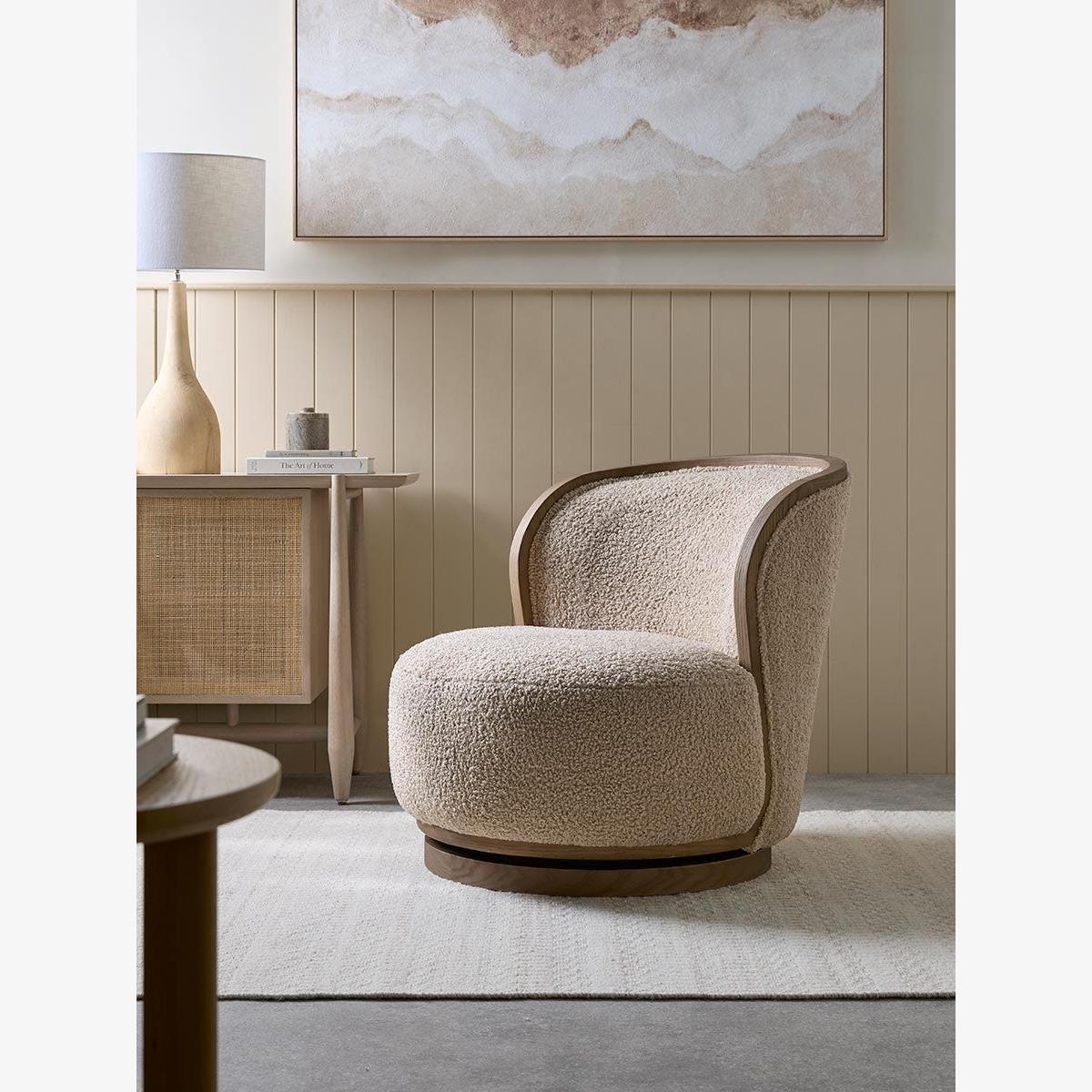 Relax and unwind in our Swivel Teddy Occasional Chair. Made from a pine and plywood frame in dark tones, the light, neutral boucle offers a soft and sumptuous place to land. The curvaceous shape with soft lines gives any room an elevated and luxurious look, and the swivel feature makes this chair ideal for positioning at any angle in any room.