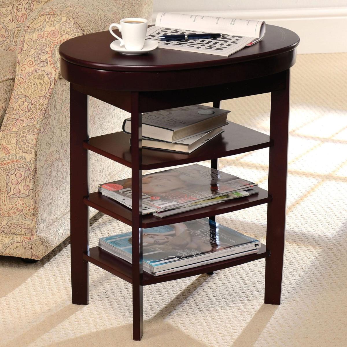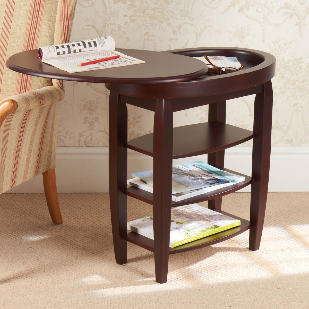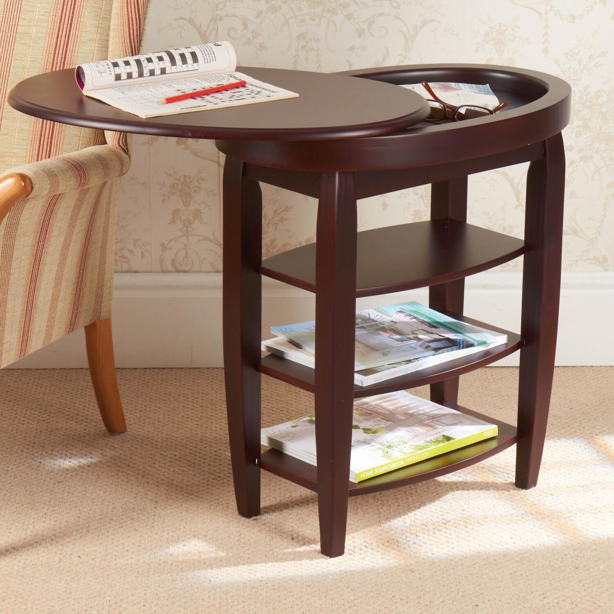 Our popular and practical multi-purpose Swivel Top Side Table features a rotating top that is ideal for enjoying drinks and nibbles from the comfort of your favourite chair whilst watching TV or surfing the internet. Inside reveals a useful storage compartment to keep items such as remote controls handy, whilst also including three shelves for books, magazines, etc. Crafted from wood with MDF sections and finished in either a mahogany or oak effect. Home assembly is required.