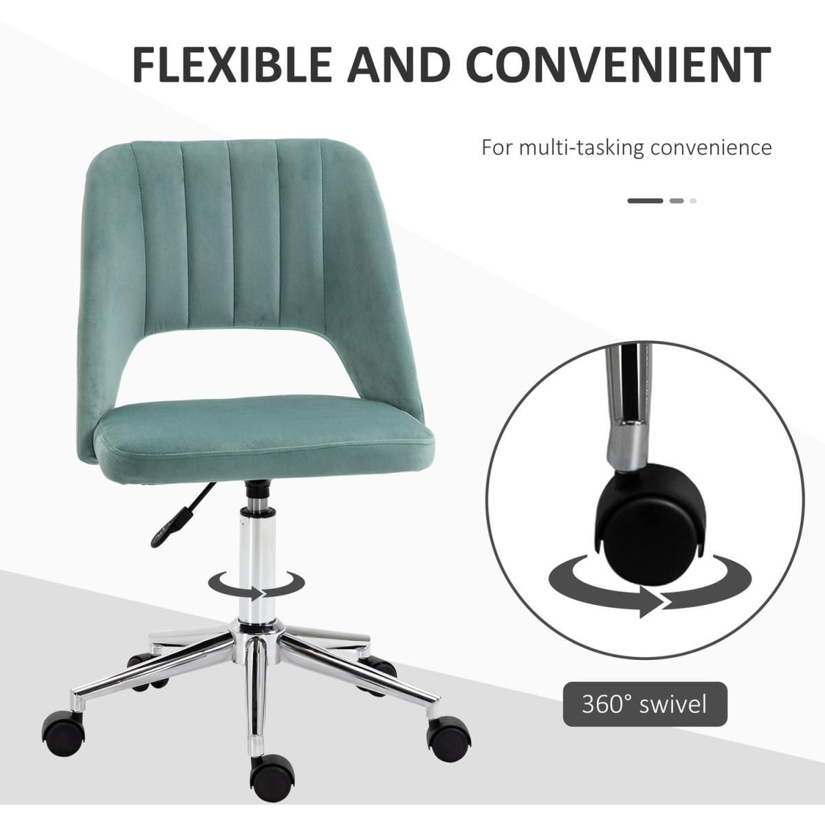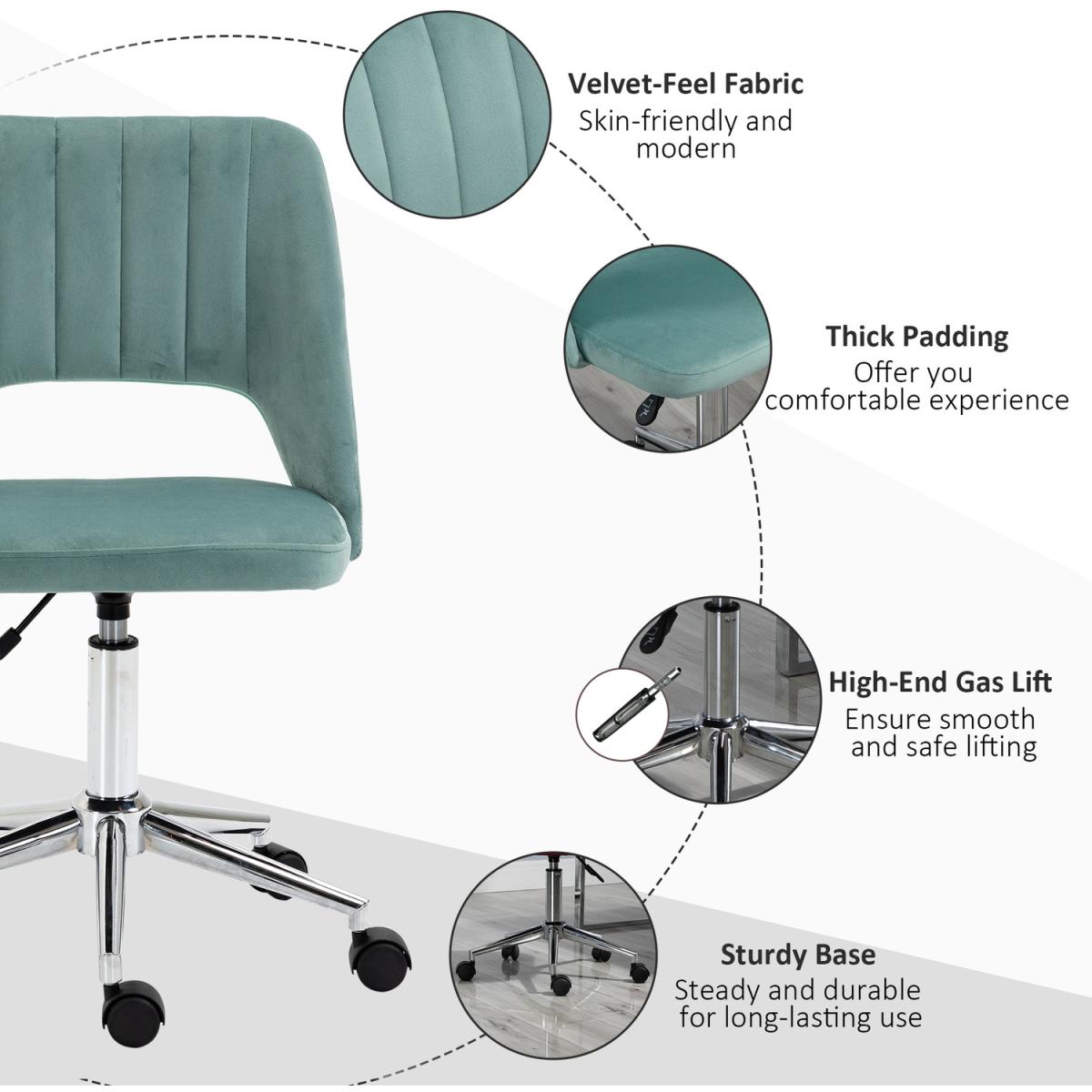 Sometimes we need to bring sophistication into the workday. And now it's easy to - simply use this chair from Vinsetto. Crafted into an armless design for a simplistic look, with plenty of sitting room, it's wrapped in light green velvet-feel upholstery - a beautiful look and feel. Both the tall back and seat are filled with sponge for comfort, with the tall back providing support. Swivel seat moves with your body motions as you work, finished with five wheels on the base.