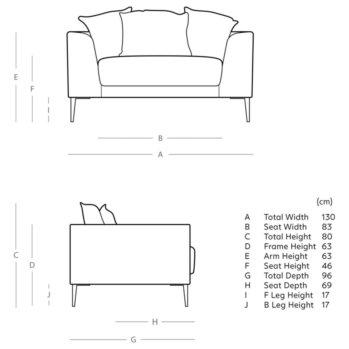 The Alena's elegant frame is enjoying all the attention right now. The generous proportions and luxe detailing has earned this Italian style sofa more than a few home-obsessed fans. Prepare to relax. Want more? Have a look at designs from Swoon's Alena Contemporary sofa range. See the collection of love seats, 3-seater couches, chaise and corner sofas. Don't forget to order a free fabric swatch. Part of the Alena collection. Material: Made from 100% polyester. Wooden feet. Fixed seat with foam and fibre filling. Fixed cushion(s) with foam and fibre filling. Dimensions: Size H80, W130, D96cm. Floor to seat height: 46cm. Depth of seat: 69cm. Height of seat back: 34cm. Width of seating area between arms: 83cm. Height of arm rest: 63cm. Weight: 38kg. Packaged dimensions: Package size H68, W135, D101cm. General information: Professional clean only. Plump cushions regularly to maintain shape. Self-assembly. Maximum individual user weight 180kg. Manufacturer's 1 year guarantee.