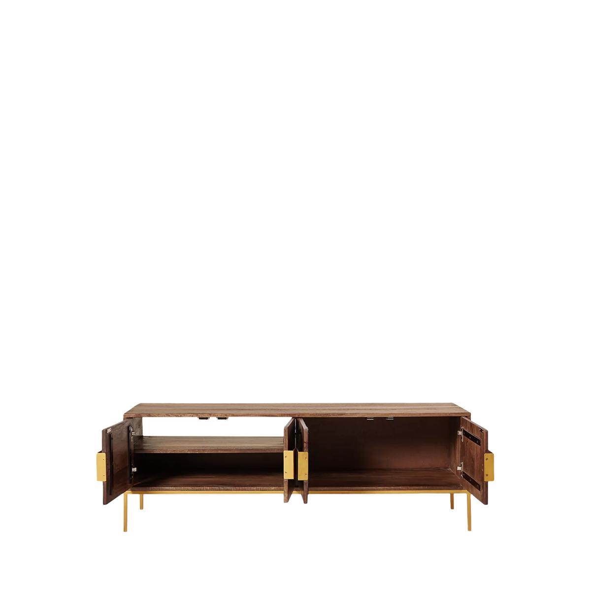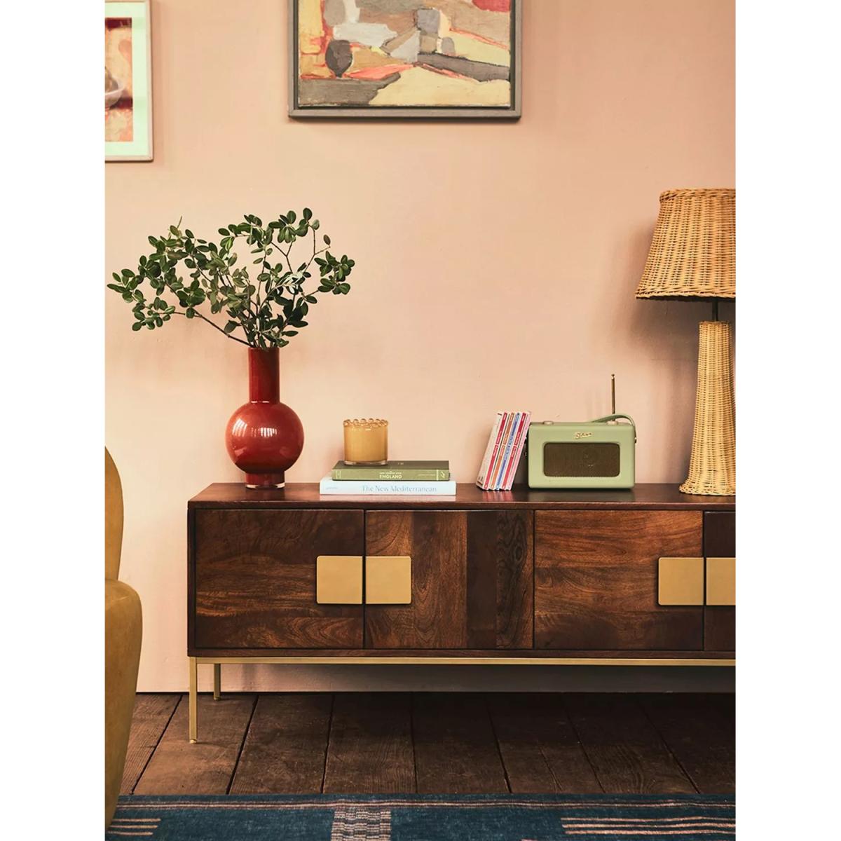 I’m a fan of the Banner TV unit for its warm sheesham finish paired with bold brass handles - it brings just the right amount of character without feeling overdone. Its low-profile, four-door design works brilliantly in mid-century, Scandi or modern industrial schemes, and the hidden compartments make gadget and cable organisation effortless. For styling, keep the top simple: a sculptural ceramic vase, a framed print or mirror propped behind, and perhaps a trailing plant to soften the metal legs. A neutral woven rug and a mix of textures - think wool throws or linen cushions on nearby seating - will balance the rich wood tones and let the unit remain the focal point.