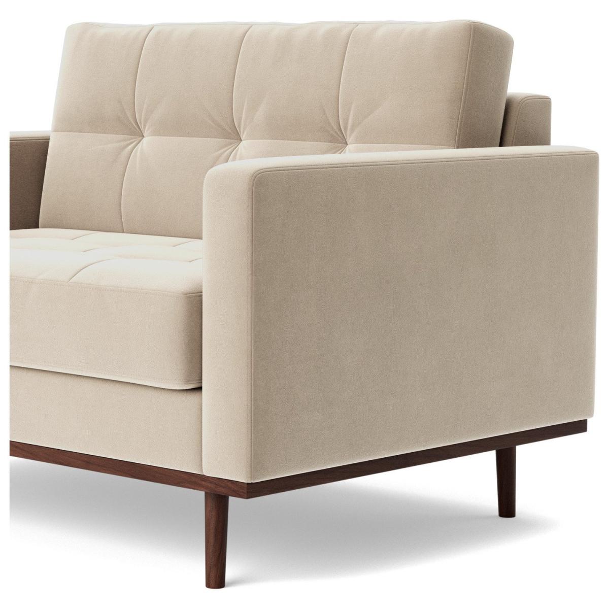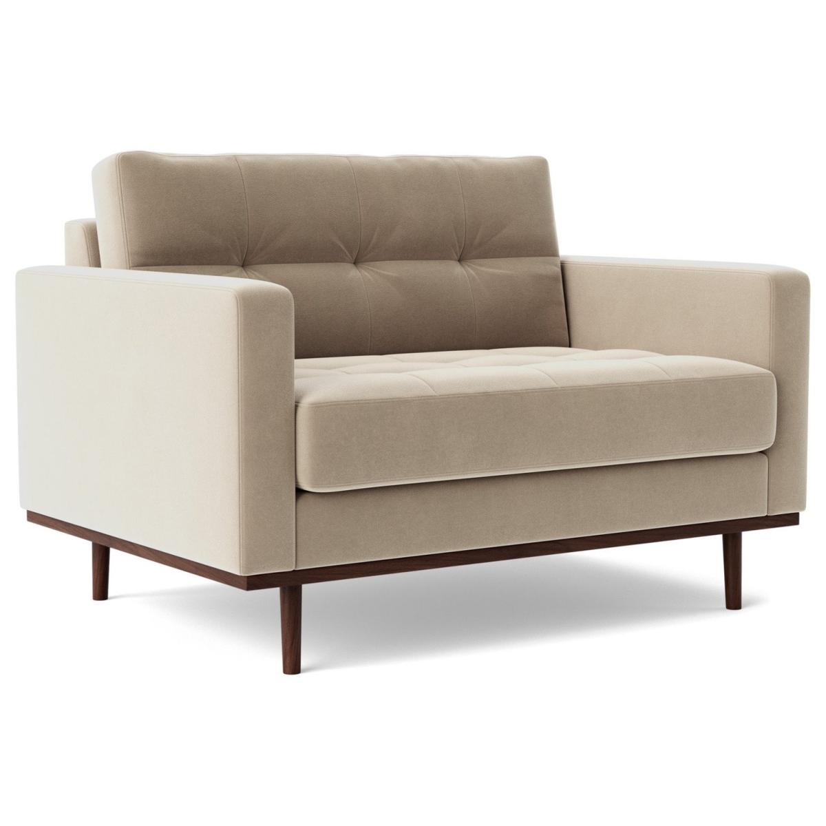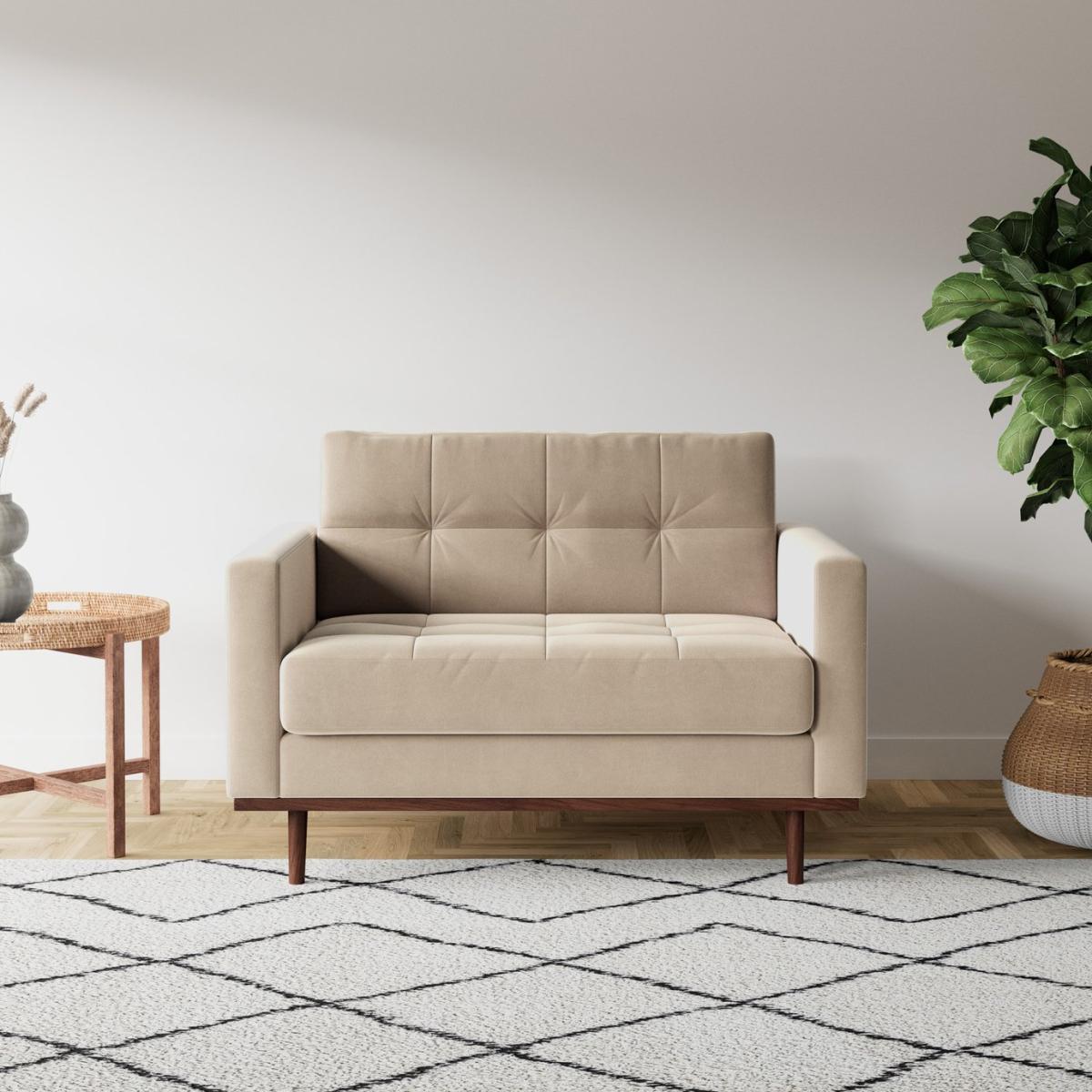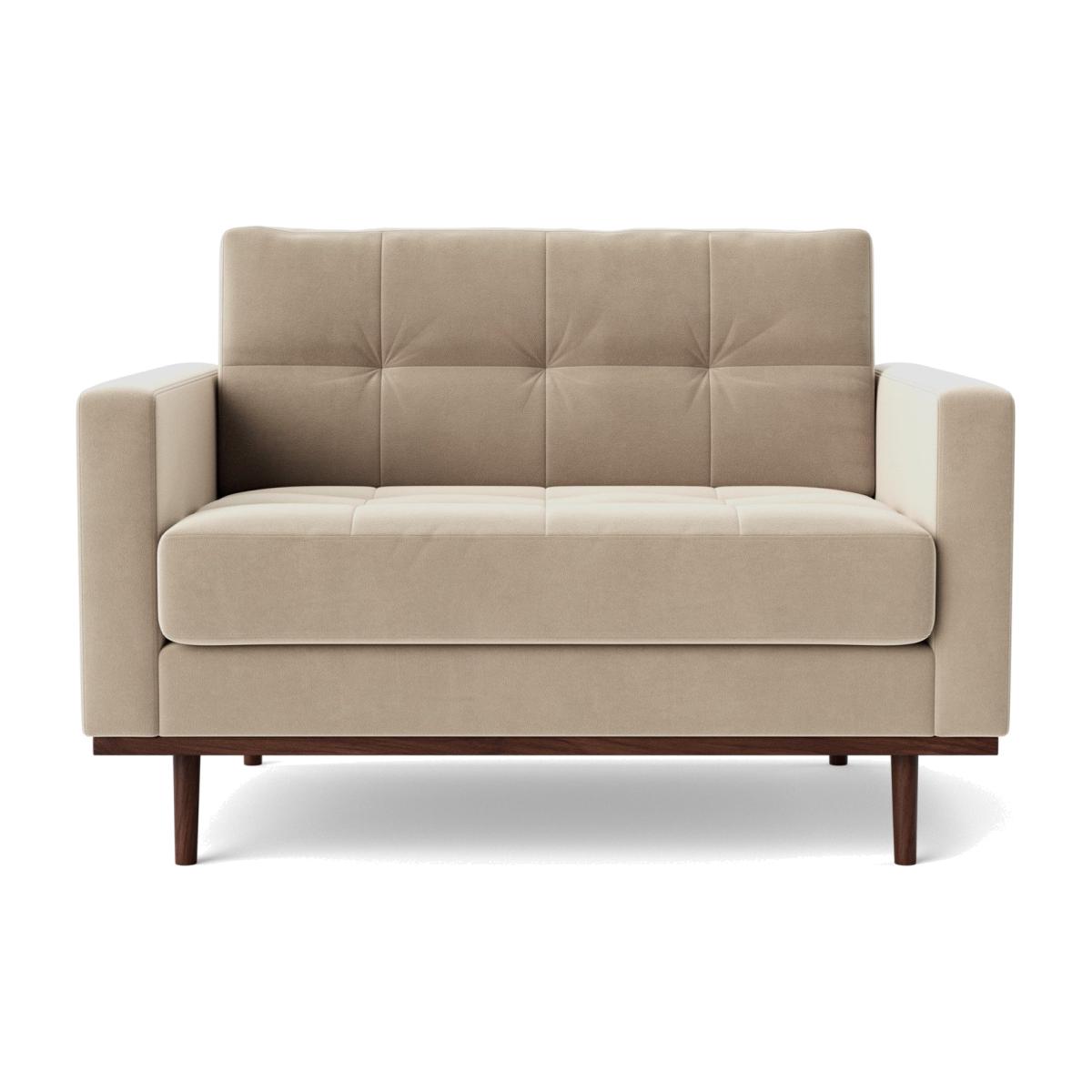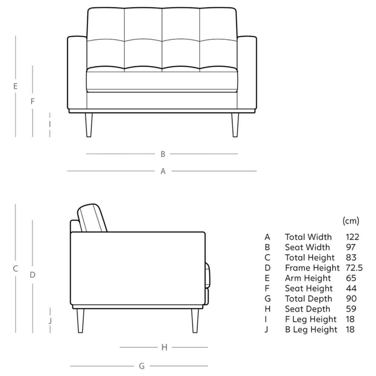 Falling over yourself to discover beautiful design? You'd better take a seat. A love seat. We were so struck by the Berlin when it arrived. In fact, we're still speechless. This is a larger version of the bestselling armchair, so even more space for tired feet and a stack of treats. Those clean lines, that tufting on the back, this is a Mid-Century marvel on legs - beech ones. Want more? Have a look at designs from Swoon's Berlin Mid Century sofa range. See the collection of ottomans, armchairs, love seats, sofa beds, 2, 3 and 4-seater couches, chaise and corner sofas. Don't forget to order a free fabric swatch. Part of the Berlin collection. Material: Made from 100% polyester. Wooden feet. Fixed seat with foam and fibre filling. Dimensions: Size H83, W122, D90cm. Floor to seat height: 44cm. Depth of seat: 59cm. Height of seat back: 39cm. Width of seating area between arms: 97cm. Height of arm rest: 65cm. Weight: 25kg. Packaged dimensions: Package size H78, W124, D95cm. General information: Professional clean only. Plump cushions regularly to maintain shape. Self-assembly. Maximum individual user weight 180kg. Manufacturer's 10 year frame guarantee.