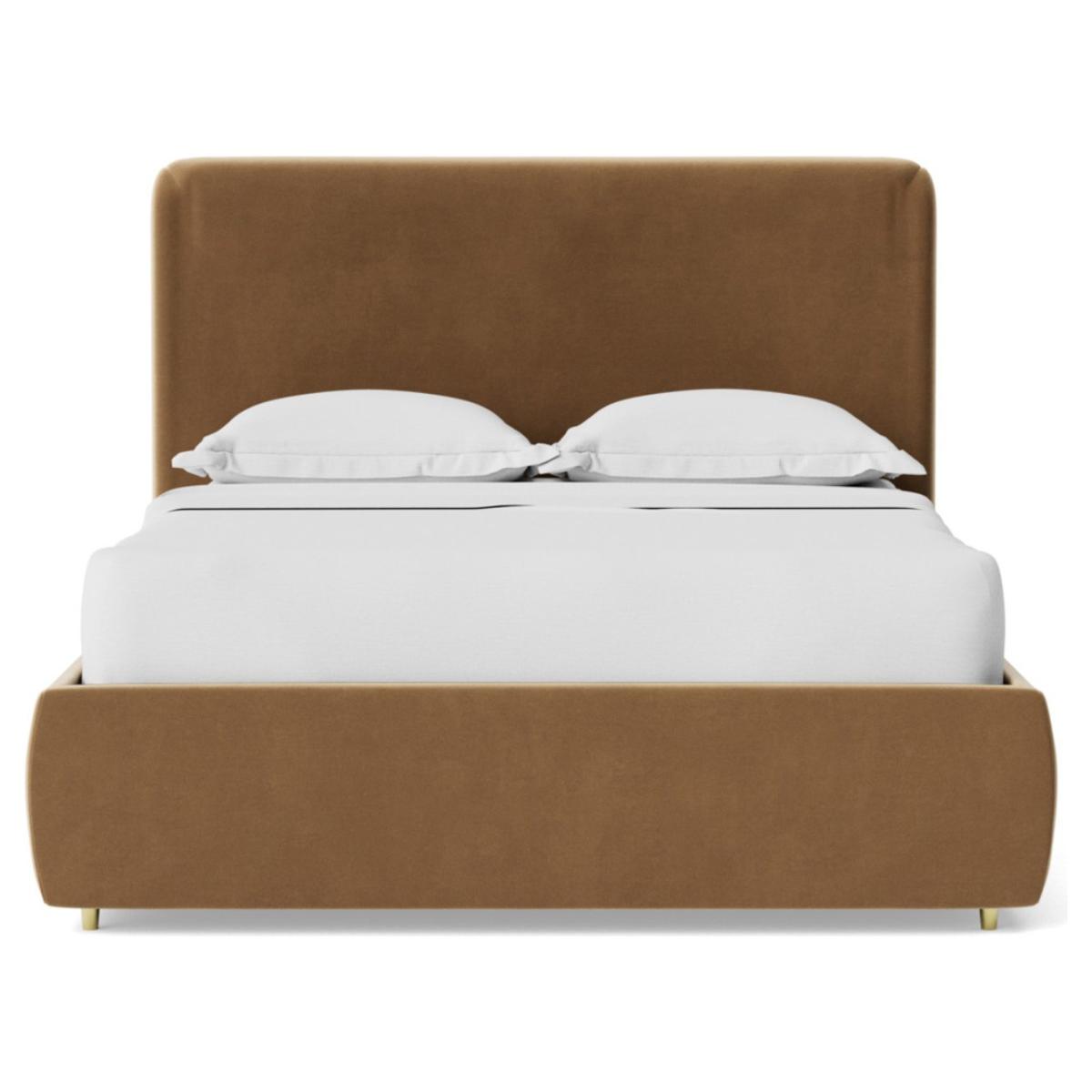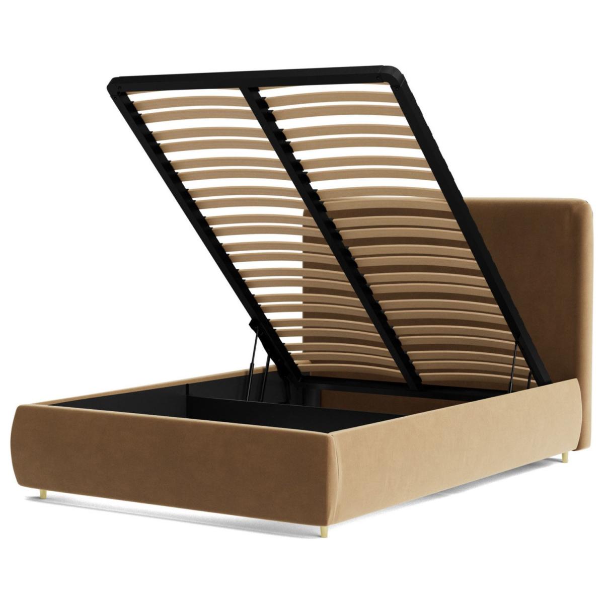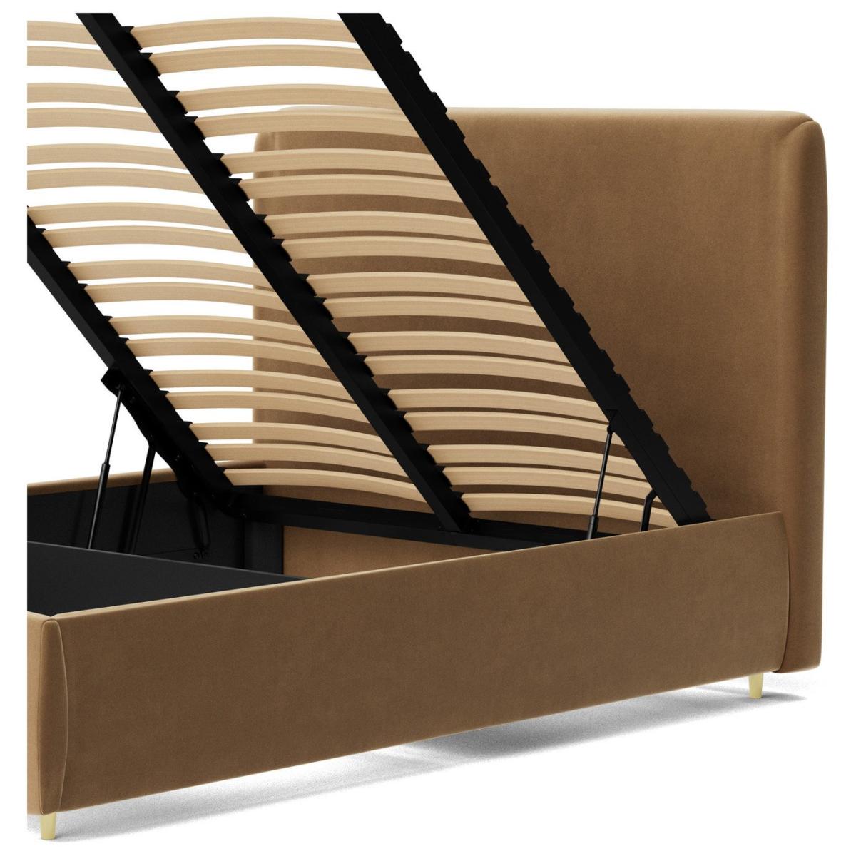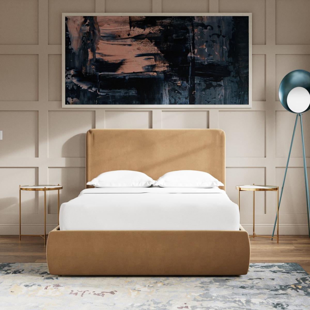 With its clean and simple lines, the Brockham sits nicely with any style. The perfectly padded frame is softened even further by the subtly rounded headboard. And there's more. Lift up the end of the bed using its nifty mechanism to reveal loads of storage space underneath. Want more? Have a look at designs from Swoon's Brockham bespoke bed range. See the collection of bed frames and ottoman beds. Don't forget to order a free fabric swatch. Featuring beech frame and plywood sprung slats. Our made to order furniture service means you can choose from different options, such as fabric, size and shape to create a beautiful bespoke piece of furniture. Because this piece is designed just for you, you might notice the delivery time is a little longer than usual. Luxurious and extra durable this deep pile velvet is sensually soft to the touch and doesn't mark or crease like traditional velvets. Part of the Brockham collection. Fabric frame. Easy velvet fabric - 100 % polyester. Dark wood and brass feet. Base with sprung wooden slats. End lift. Ottoman: end opening. Storage capacity: 945 litres. Size W165, L215, H109.5cm. Height to top of siderail 29cm. 5cm clearance between floor underside of bed. Weight 82kg. Total maximum user weight 220kg. Self-assembly - 2 people recommended. Package Dimension: Package 1 dimension H14, W196, D26cm. Package 1 weight: 34.9kg. Package 2 dimensions: H38, W205, D19.2cm. Package 2 weight: 26kg. Package 3 dimension: H11, W165, D105cm. Package 3 weight: 21kg. General information: Manufacturer's 10 year frame guarantee.