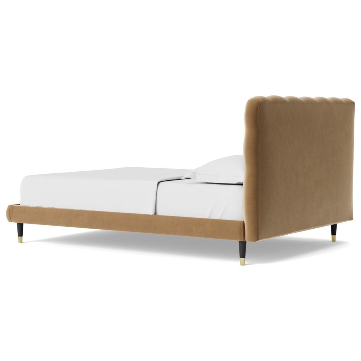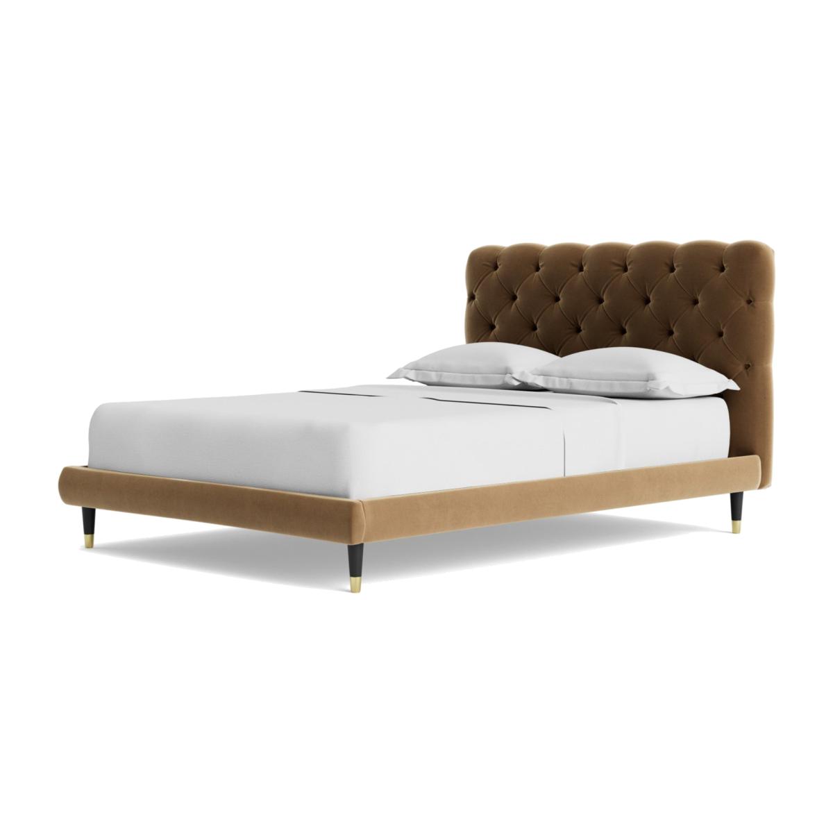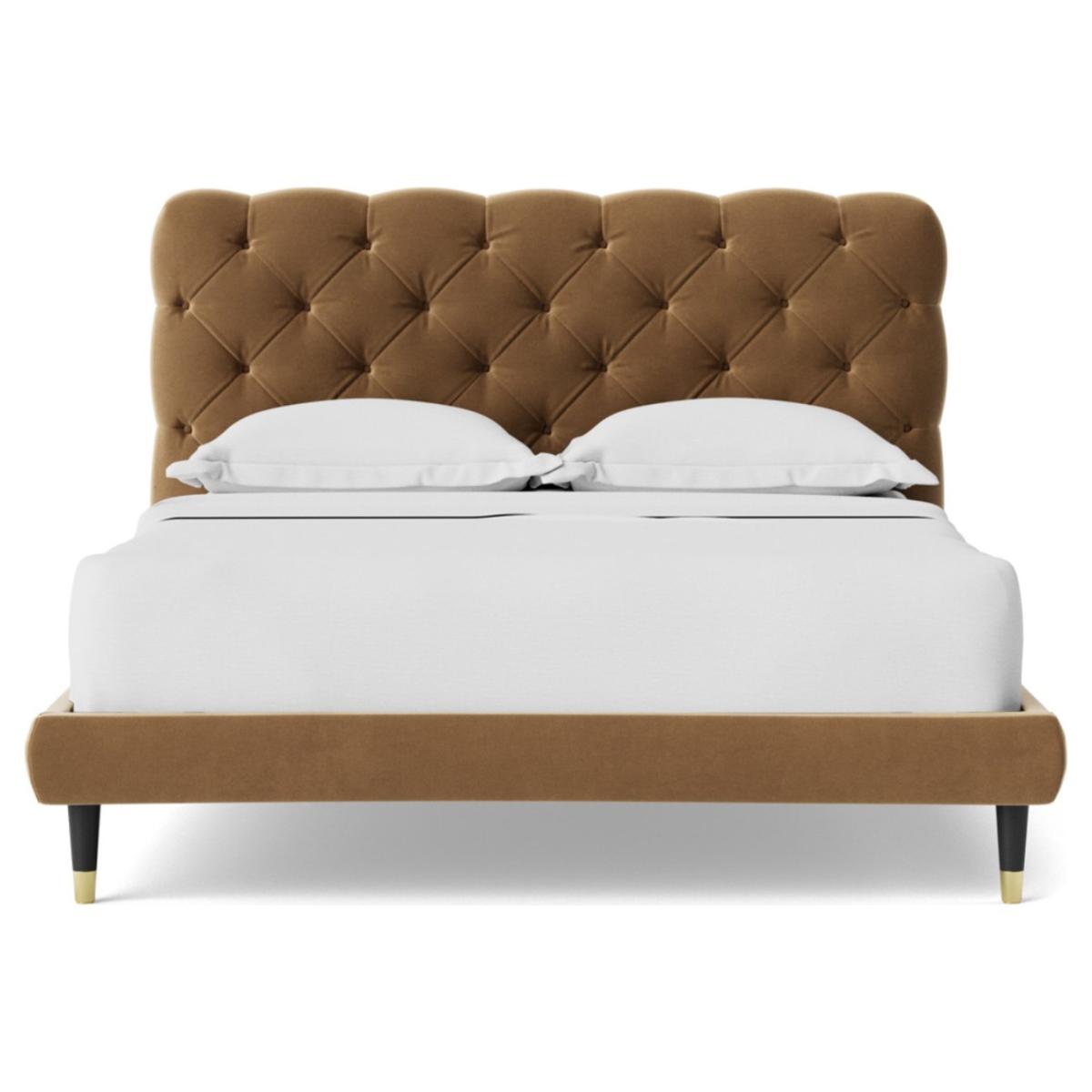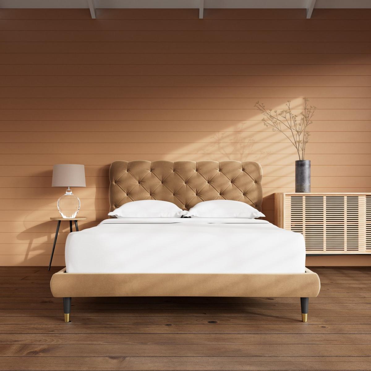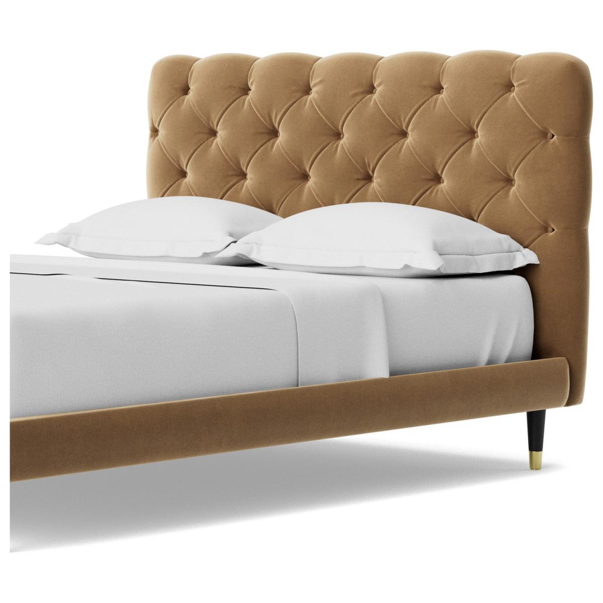 An elegant, perfectly padded frame, proves an impeccable plinth on which to lay a mattress and, indeed, your head. But the refined quilted headboard is where the Burbage really shines. The opulent, deep button tufted upholstery is eye catching and opulent. Want more? Have a look at designs from Swoon's Burbage bespoke bed range. See the collection of bed frames and ottoman beds. Don't forget to order a free fabric swatch. Features beech plywood sprung slats. Our made to order furniture service means you can choose from different options, such as fabric, size and shape to create a beautiful bespoke piece of furniture. Because this piece is designed just for you, you might notice the delivery time is a little longer than usual. Luxurious and extra durable this deep pile velvet is sensually soft to the touch and doesn't mark or crease like traditional velvets. Part of the Burbage collection. Fabric frame. Easy velvet fabric - 100% polyester. Dark wood and brass feet. Base with sprung wooden slats. No storage. Size W162, L208, H108cm. Height to top of siderail 29cm. 17cm clearance between floor and underside of bed. Weight 60kg. Total maximum user weight 220kg. Self-assembly - 2 people recommended. Package Dimensions: Package 1 dimensions: H167.5, W95.5, D11cm. Package 1 weight: 20kg. Package 2 dimensions: H206.5, W43, D14cm. Package 2 weight: 40kg. General Information: Manufacturer's 1 year guarantee.