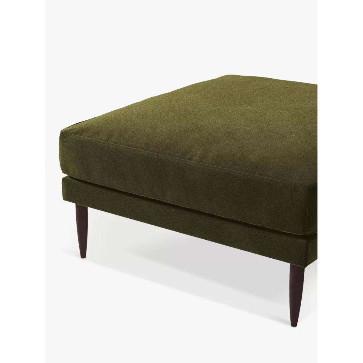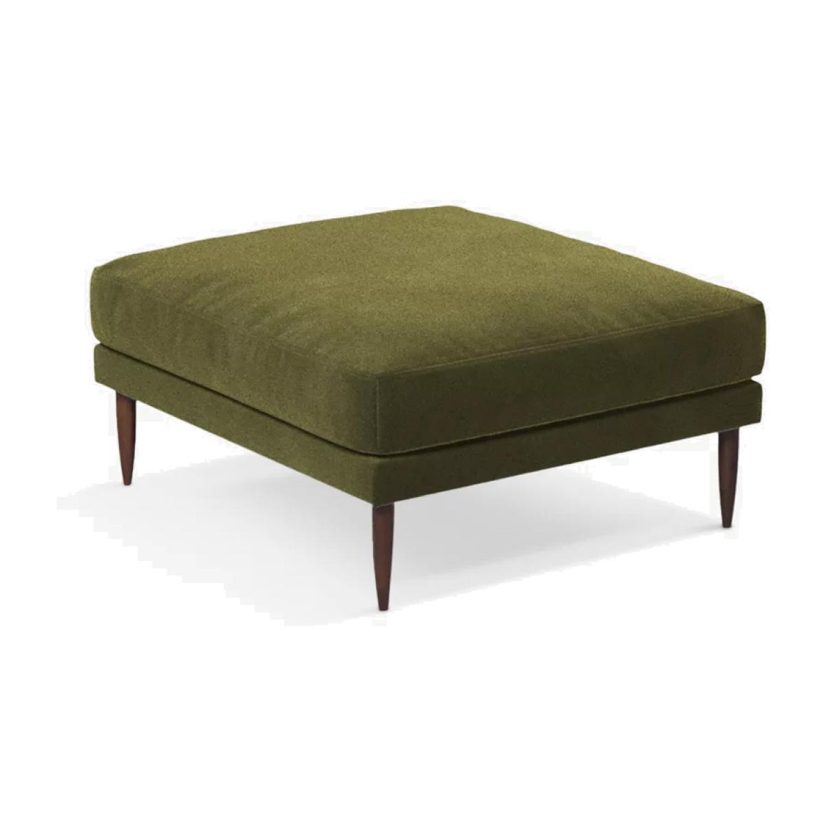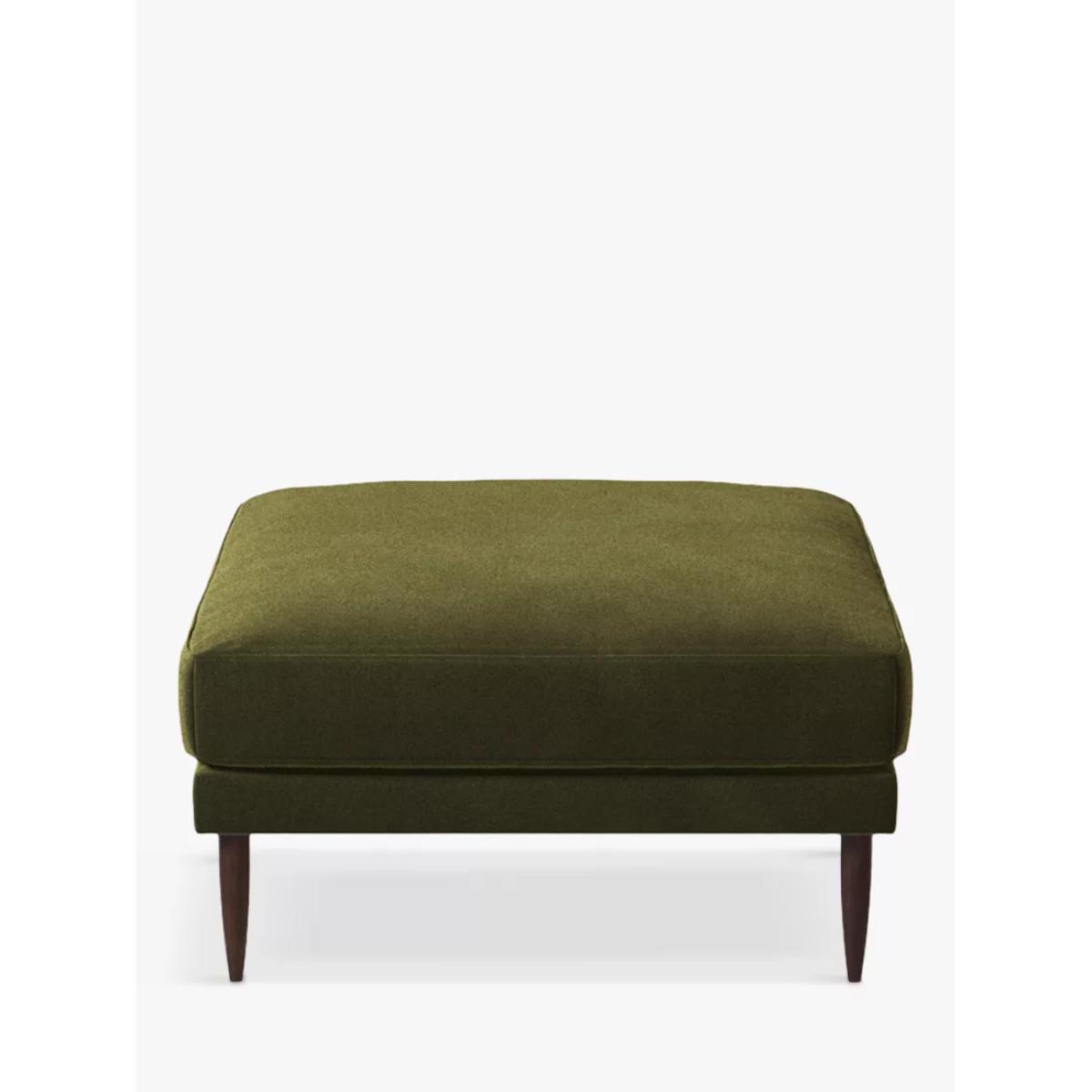 I love this ottoman for its versatile style and rich, dark legs that provide a sleek, modern touch. It works particularly well in contemporary or minimalist interiors, where its clean lines can be the focal point, or in more eclectic spaces that benefit from a pop of colour and texture. The green upholstery adds warmth and an element of nature-inspired calm, making it perfect for living rooms or reading nooks. Practical tips include using it as an extra seat, a footrest, or even a low coffee table by adding a tray on top. To style around it, pair with neutral-toned sofas or layering with textured throws and cushions to create a cosy yet polished look.
